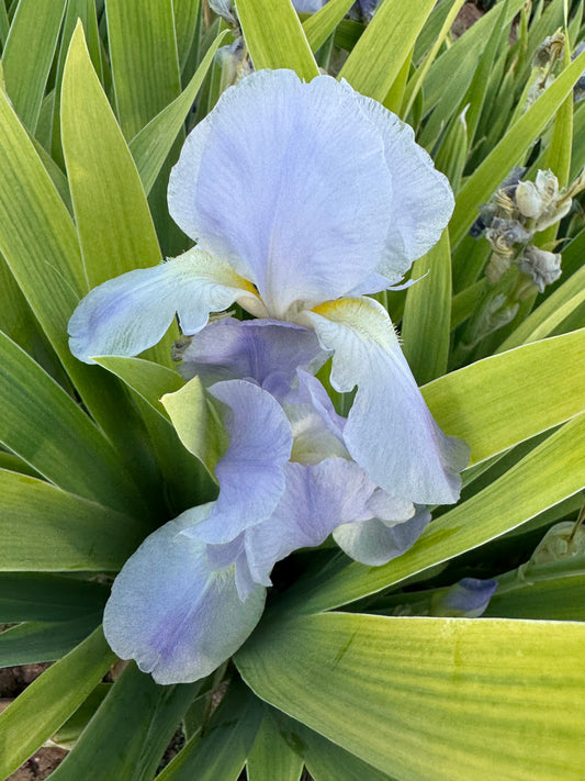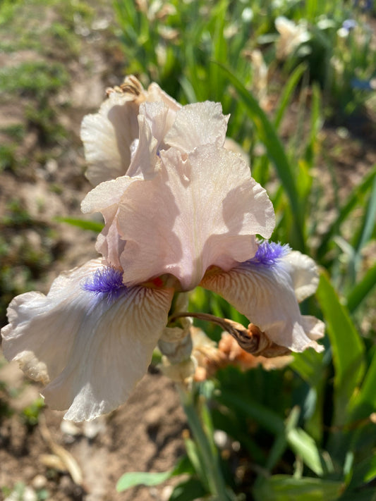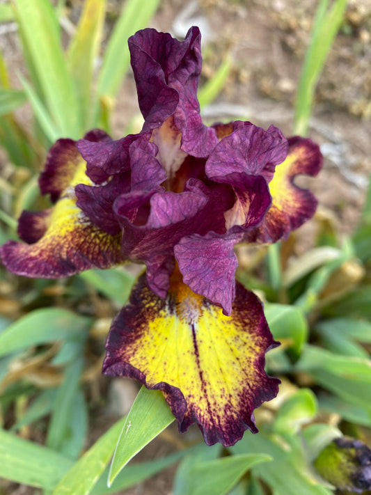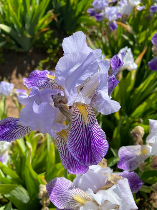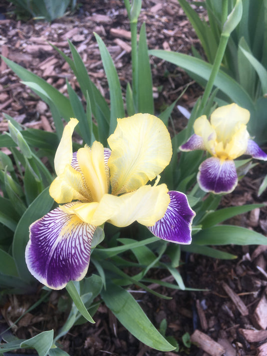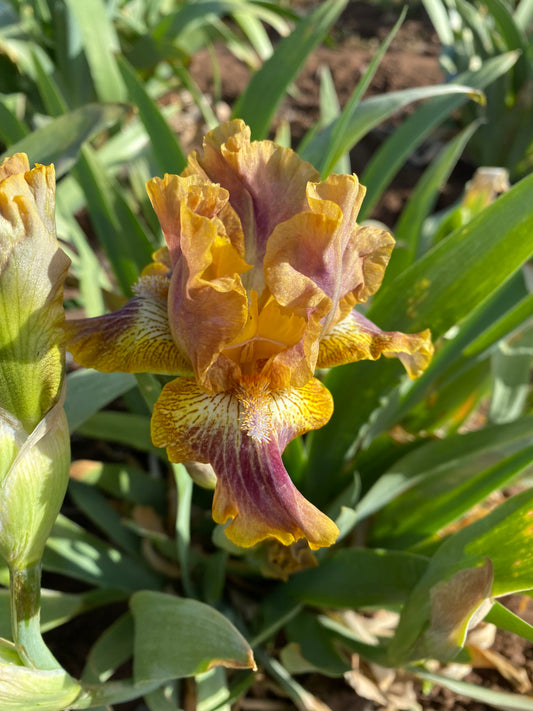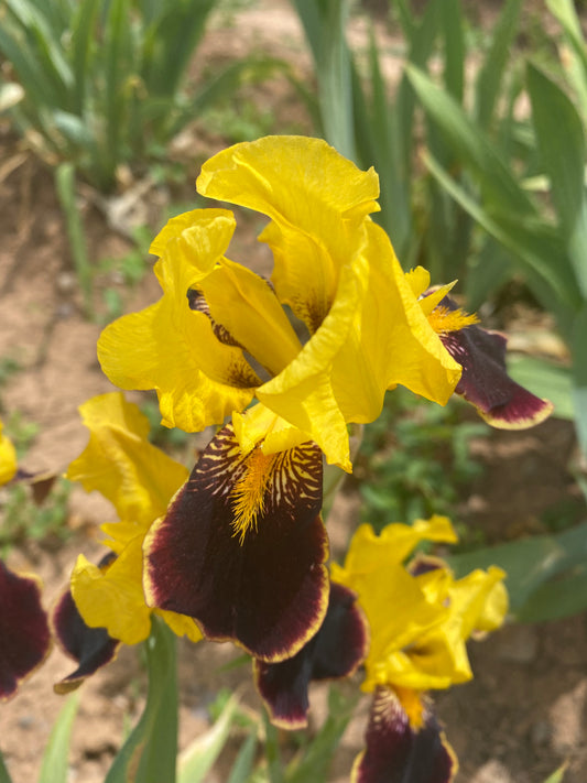Intermediate Bearded (IB) — stand from 41 cm (16 inches) to 70 cm (27 1/2 inches) high, with their bloom season overlapping the SBDs and the TBs. Although the IBs show their dwarf ancestry in early bloom season and very interesting color patterns, they are large enough that their individual stalks may be nicely branched, forming an elegant bouquet. Some varieties are nicest in clumps, where they present a large amount of color (like the SDBs), while others are showiest in specimen plantings, where the stalks and individual blooms may be seen to best advantage.