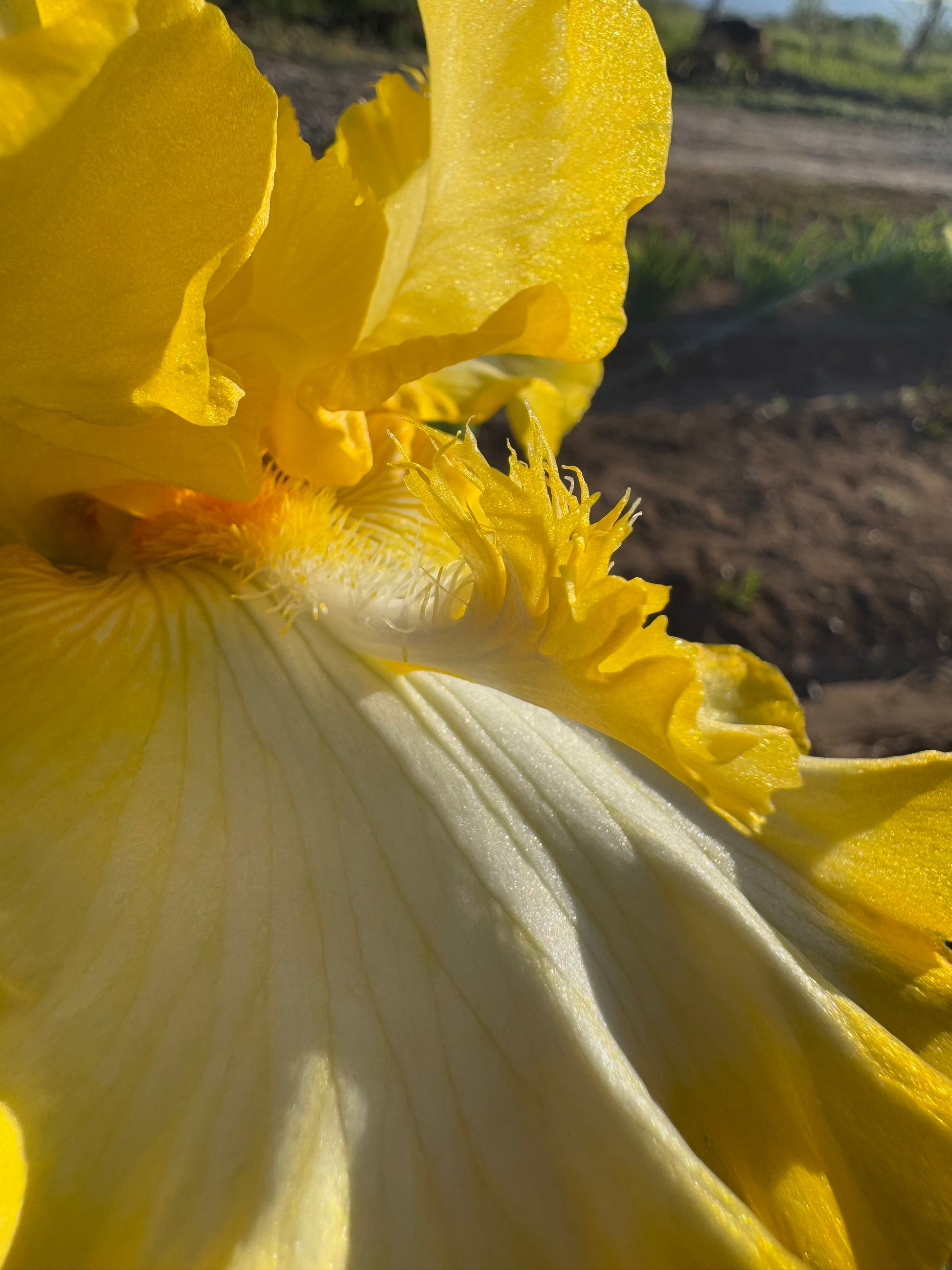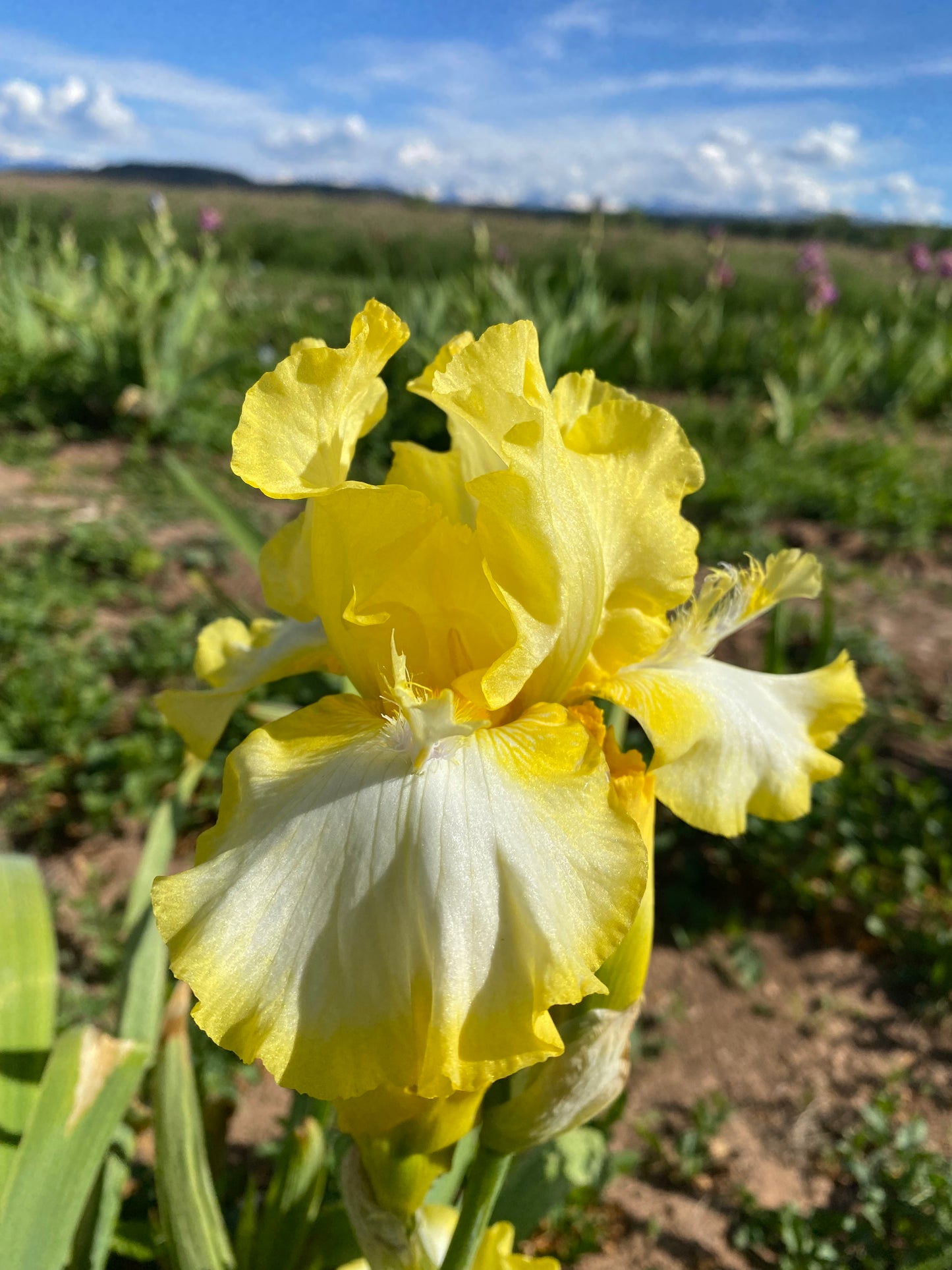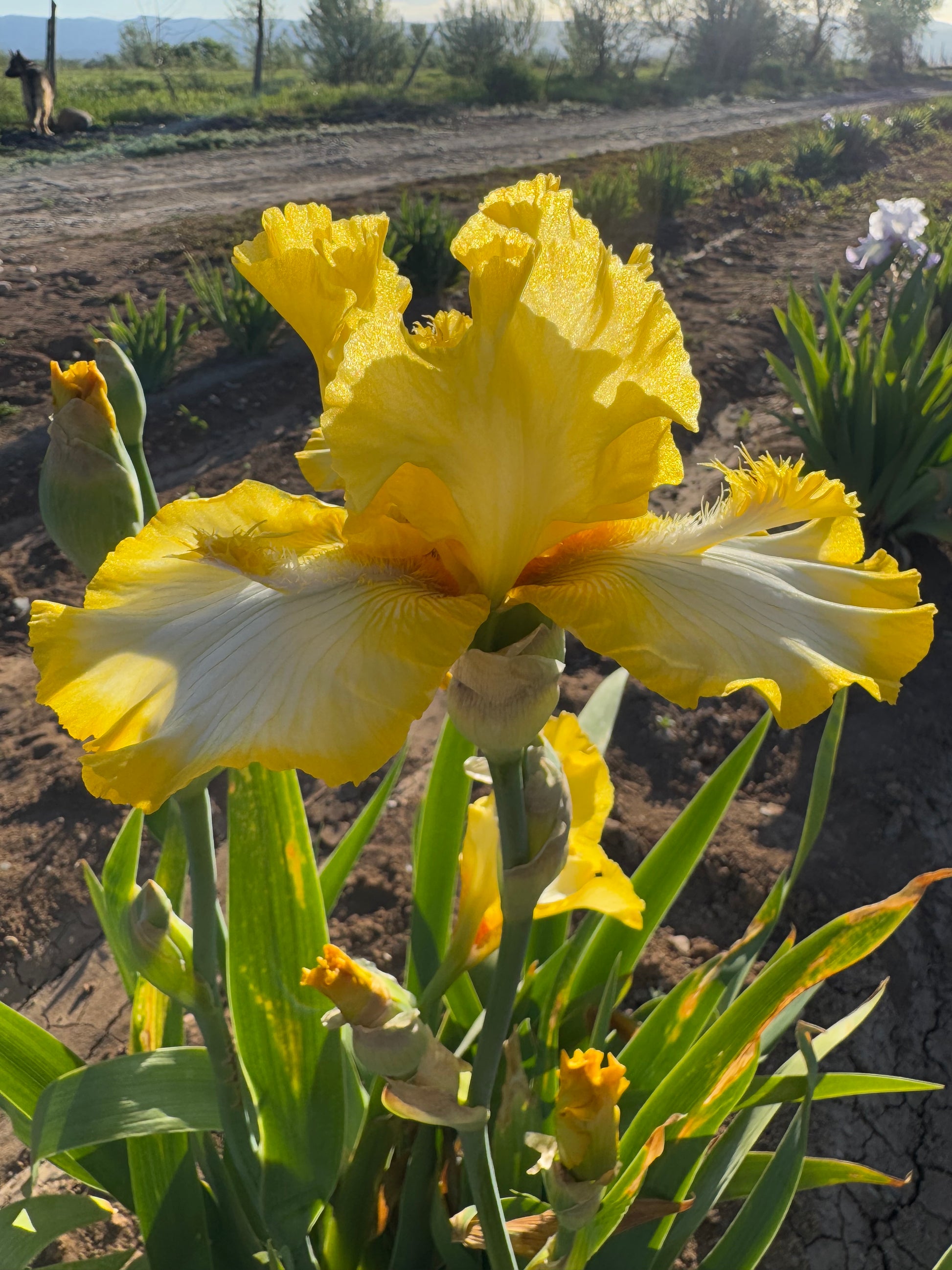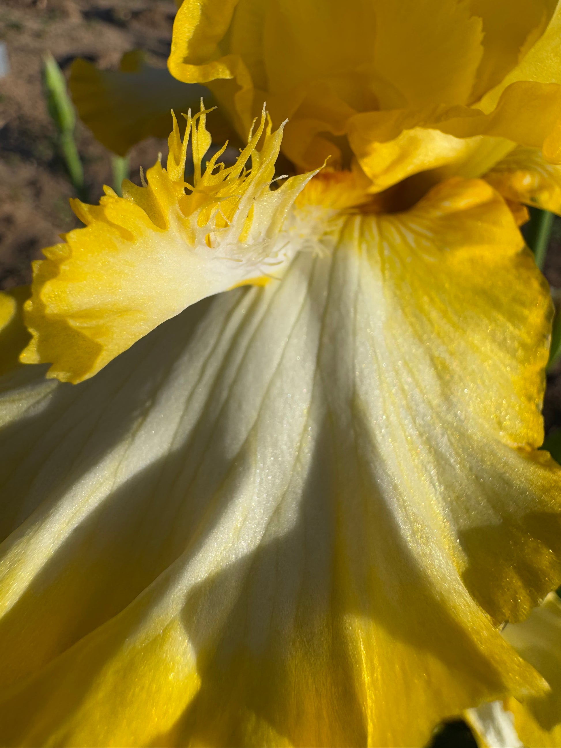 ‘Abby And Me’ (Tom Burseen, R. 2003). TB, 37″ (94 cm), Midseason bloom. Standards bright lemon yellow; style arms bright yellow; Falls white, 1/4″ bright yellow rim; beards dark buttercup yellow, white flounce ending in tattered yellow spoon; heavily ruffled, flared. Honorable Mention 2008; Award of Merit 2012.
