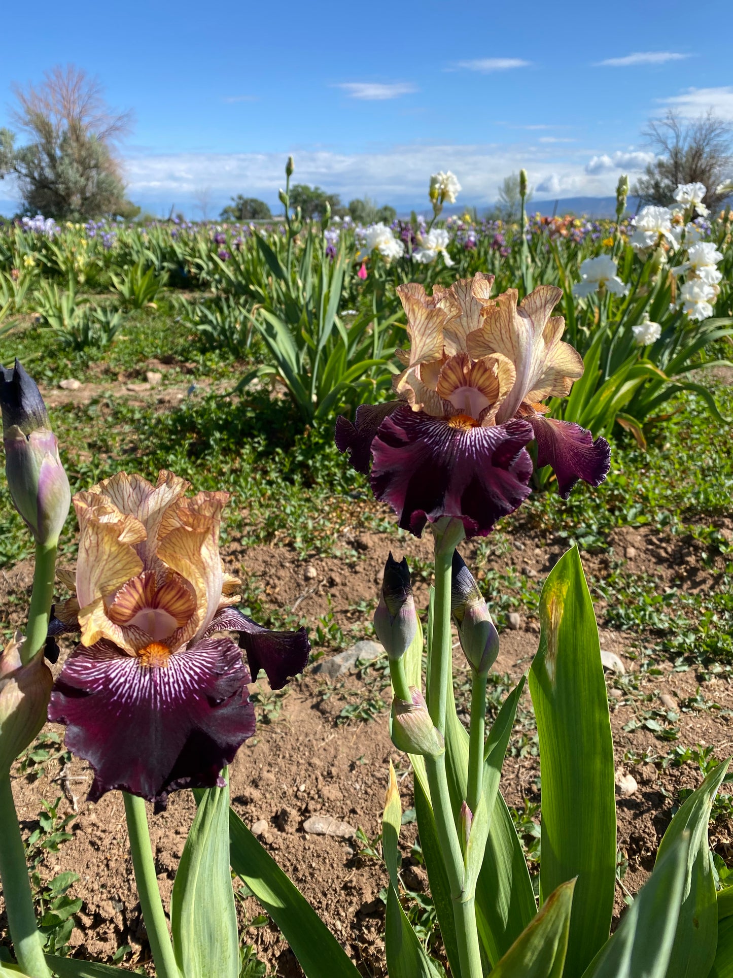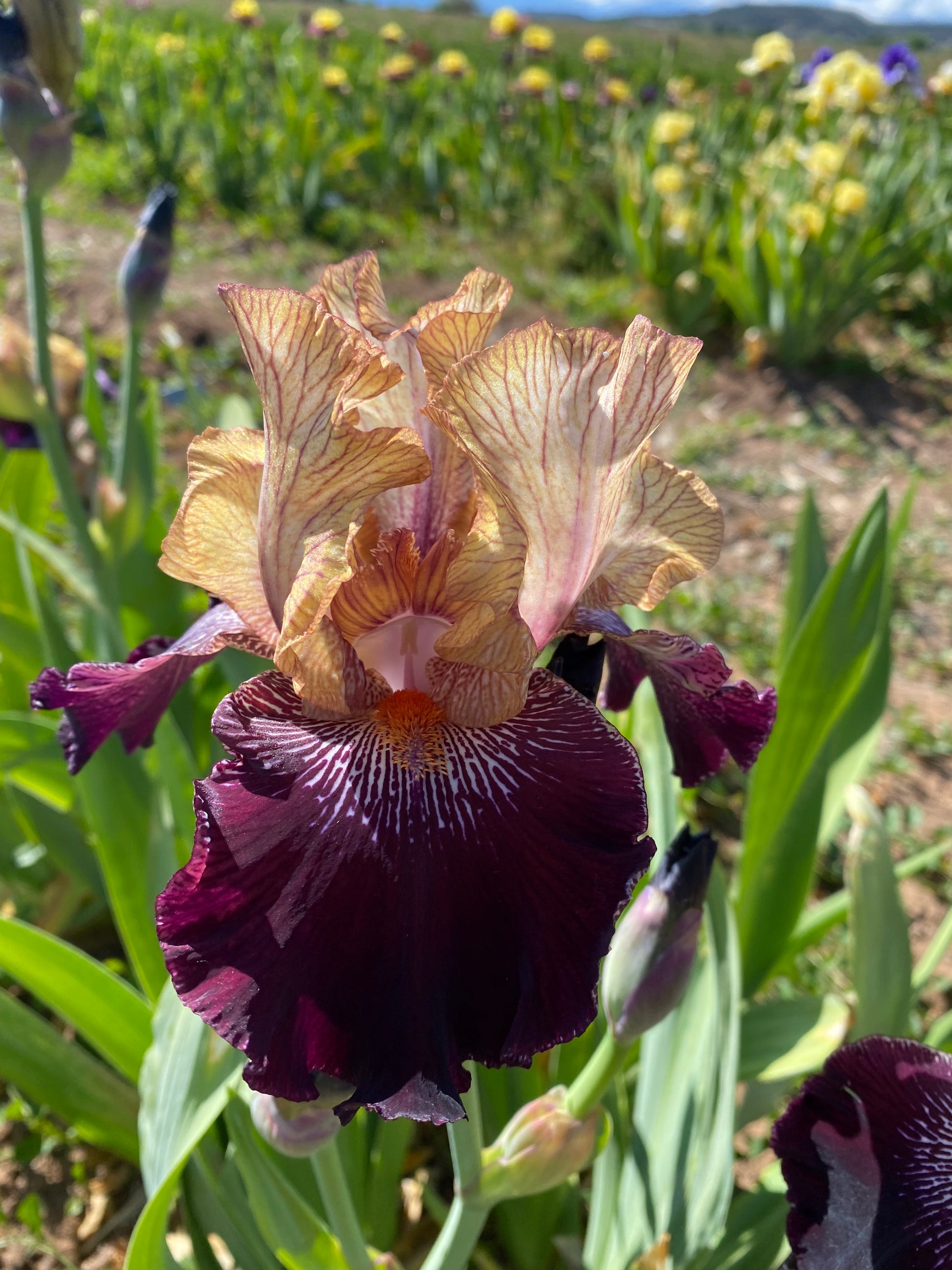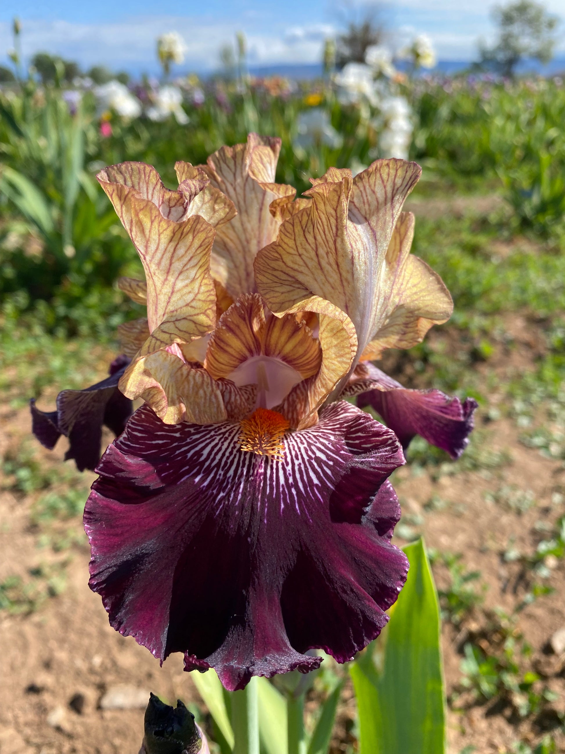 ‘Action Packed’ (Paul Black, R. 2011) Seedling O177C. TB, 36″ (91 cm), Midseason to very late bloom. Standards white washed light tan-gold, prominent medium wine veining from edge inward to midribs, medium wine rim, inside more white; lower style arms light tan-gold, violet ridge, upper crest wine, alternating wine and gold stripes below; Falls velvety purple-black, beard surrounded by white rays; beards violet base, hairs tipped orange. ‘Magic Masquerade’ X seedling L157C: (seedling 98A: (‘Sensual Elegance x ‘Romantic Evening’) x ‘Snowed In’). Mid-America 2011. Honorable Mention 2013; Award of Merit 2015