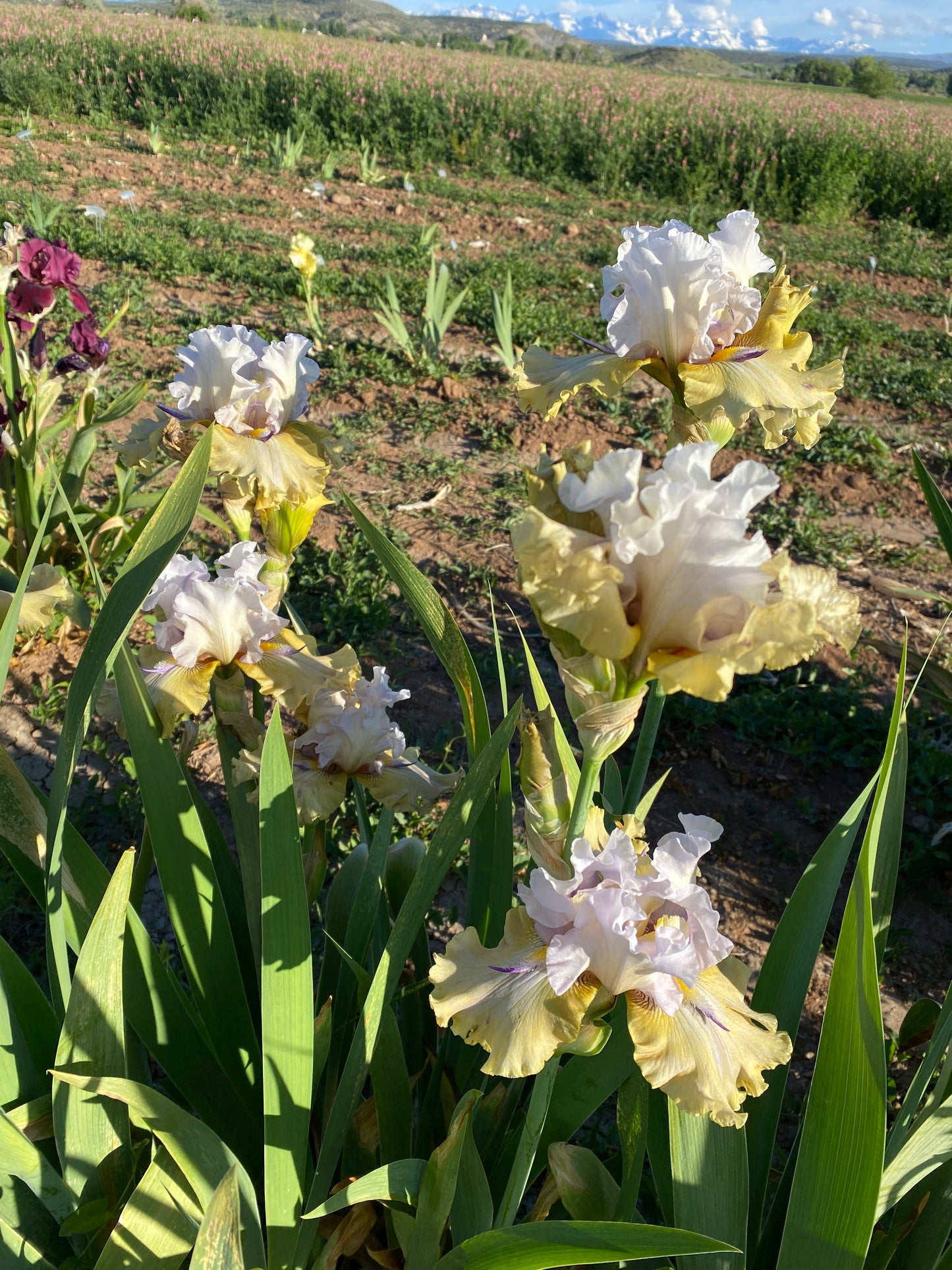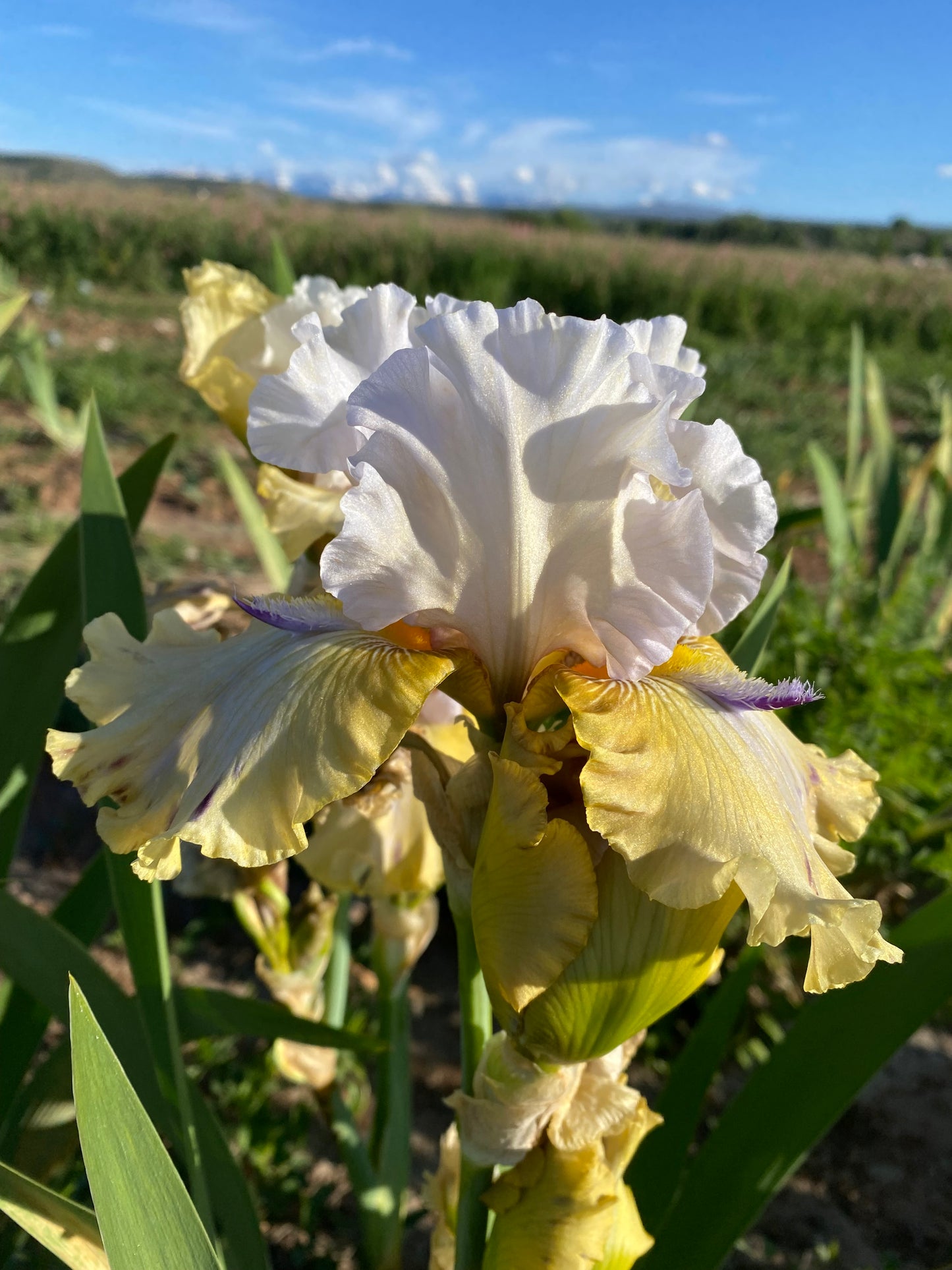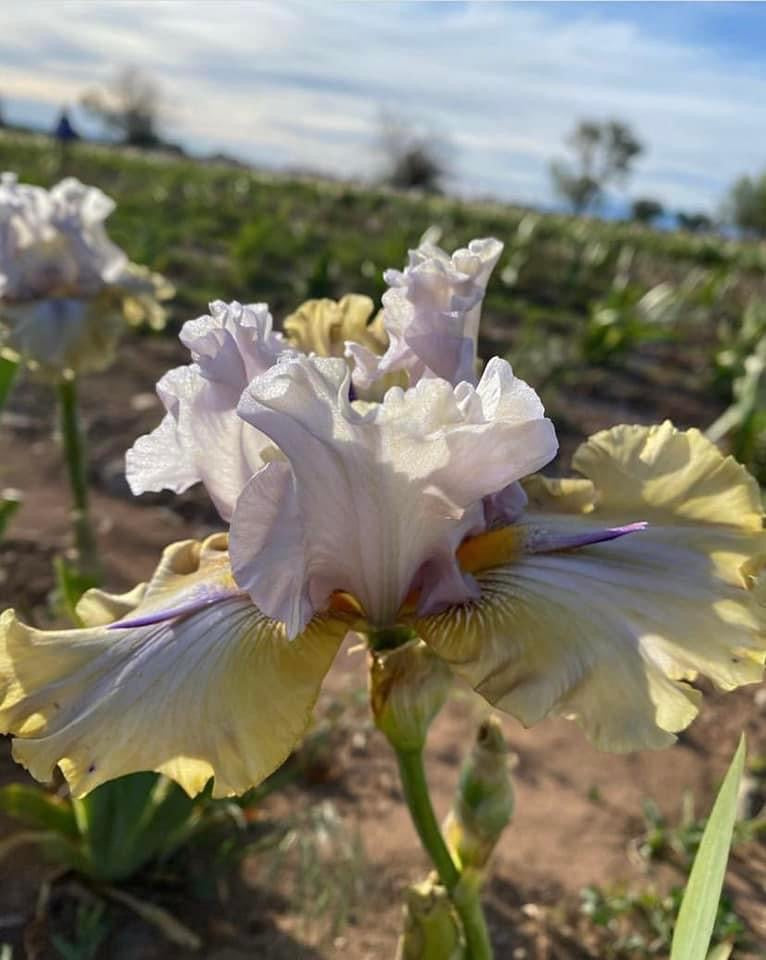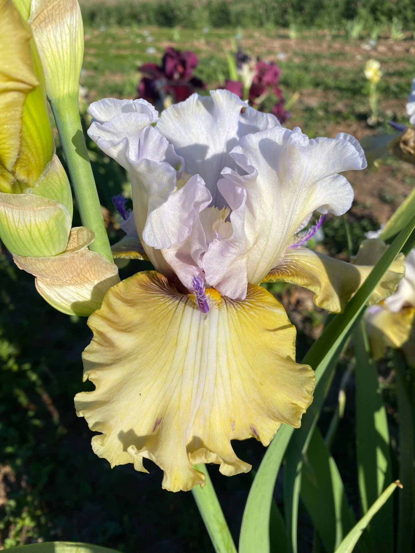 ‘Angler Fish’ (Gerald Richardson, R. 2013) TB, 33 (84 cm), Midseason bloom. Standards and style arms pale lavender; Falls light buff, stippled violet; beards light orange, upward pointing violet horns; slight fragrance.