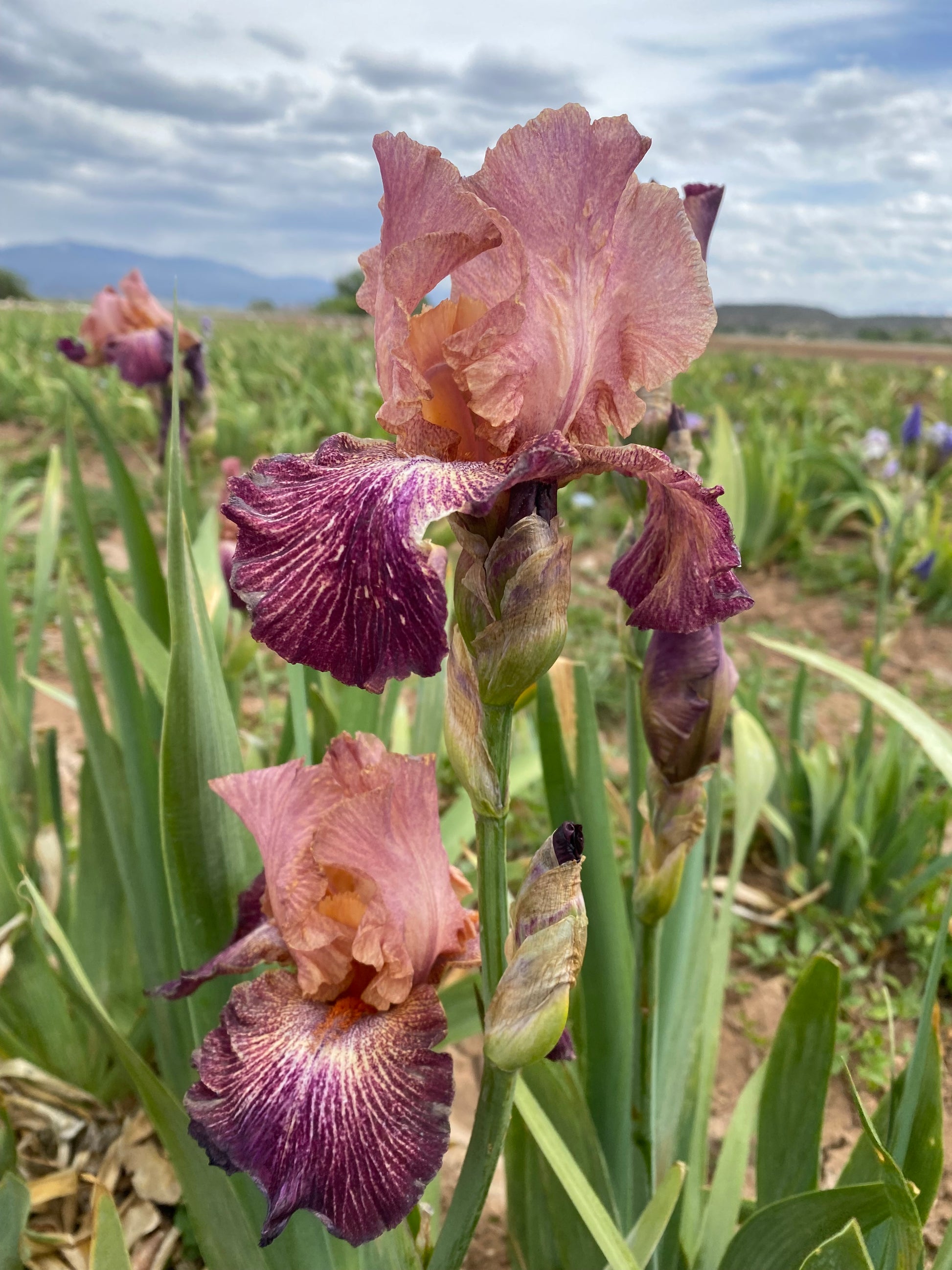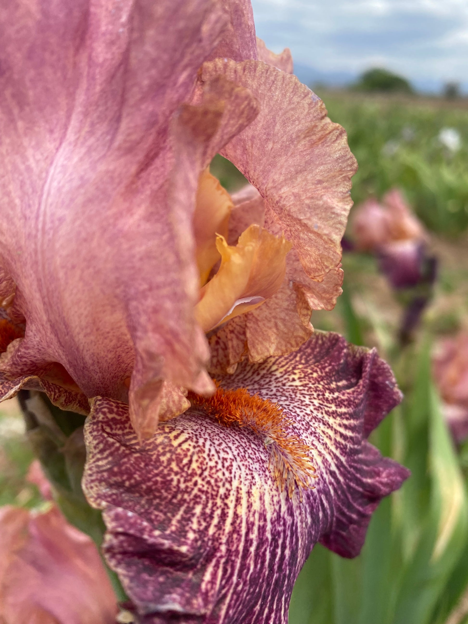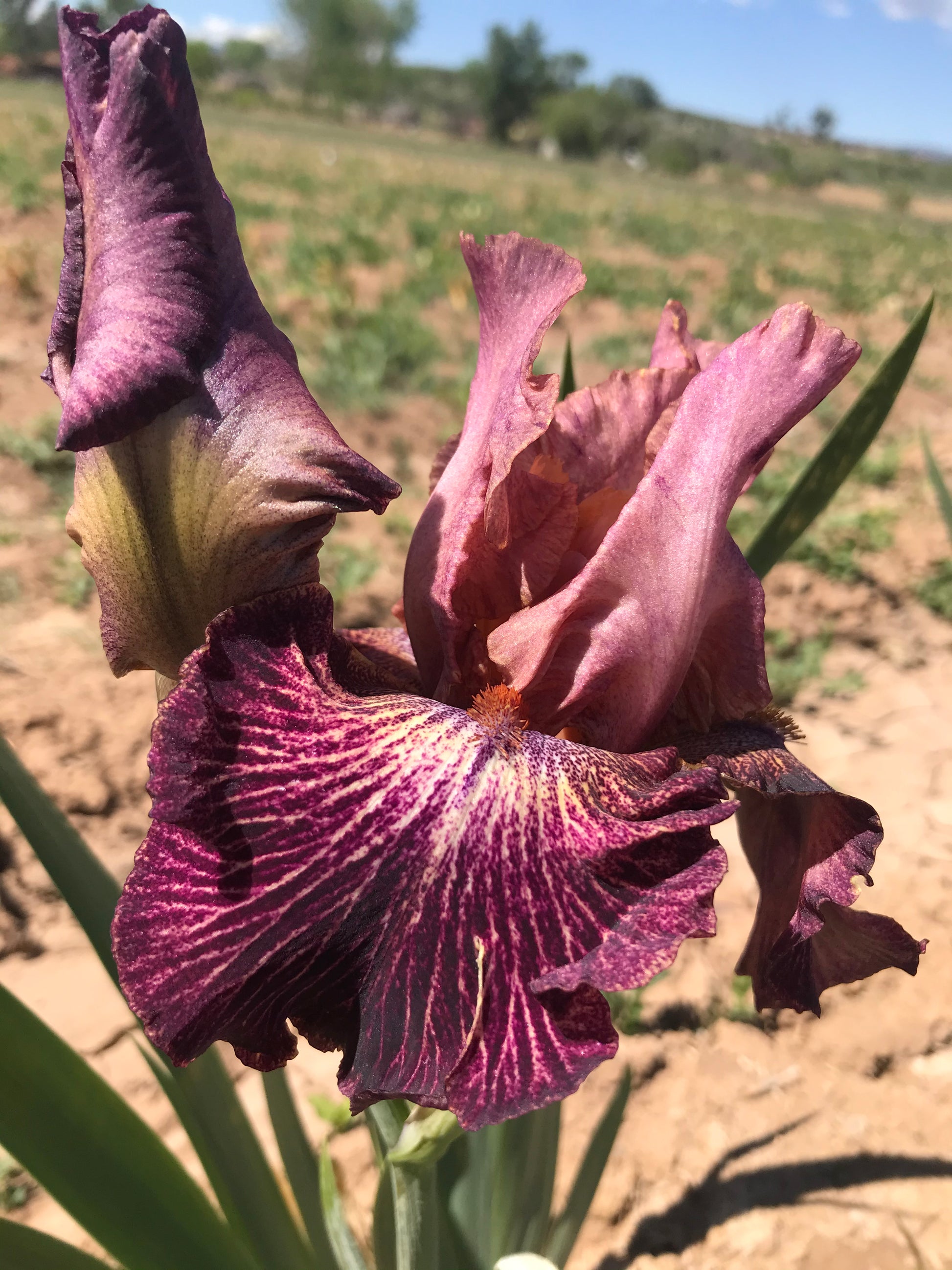 'Artistic Web' (Richard Tasco, R. 2010) Seedling 03-TB-38-20. TB, 38" (97 cm). Midseason bloom. Standards light orient-pink lightly washed magenta rose, very slight irregular light maize-yellow edges; style arms maize yellow edges lightening to rosy mauve wash near midrib; falls salmon apricot ground heavily striated beetroot purple (RHS 71A) becoming nearly solid at edge; beards white base, tipped bronze; lightly ruffled, luminata plicata; sweet fragrance. Seedling 00-TB-28-30: ('Ostentatious' x seedling 96-TB-11-27: ('Splashacata' x 'Oh Babe')) Xseedling 01-TB-65-08: ('Flights Of Fancy' x 'Fancy Woman'). Superstition 2010. Honorable Mention 2012.