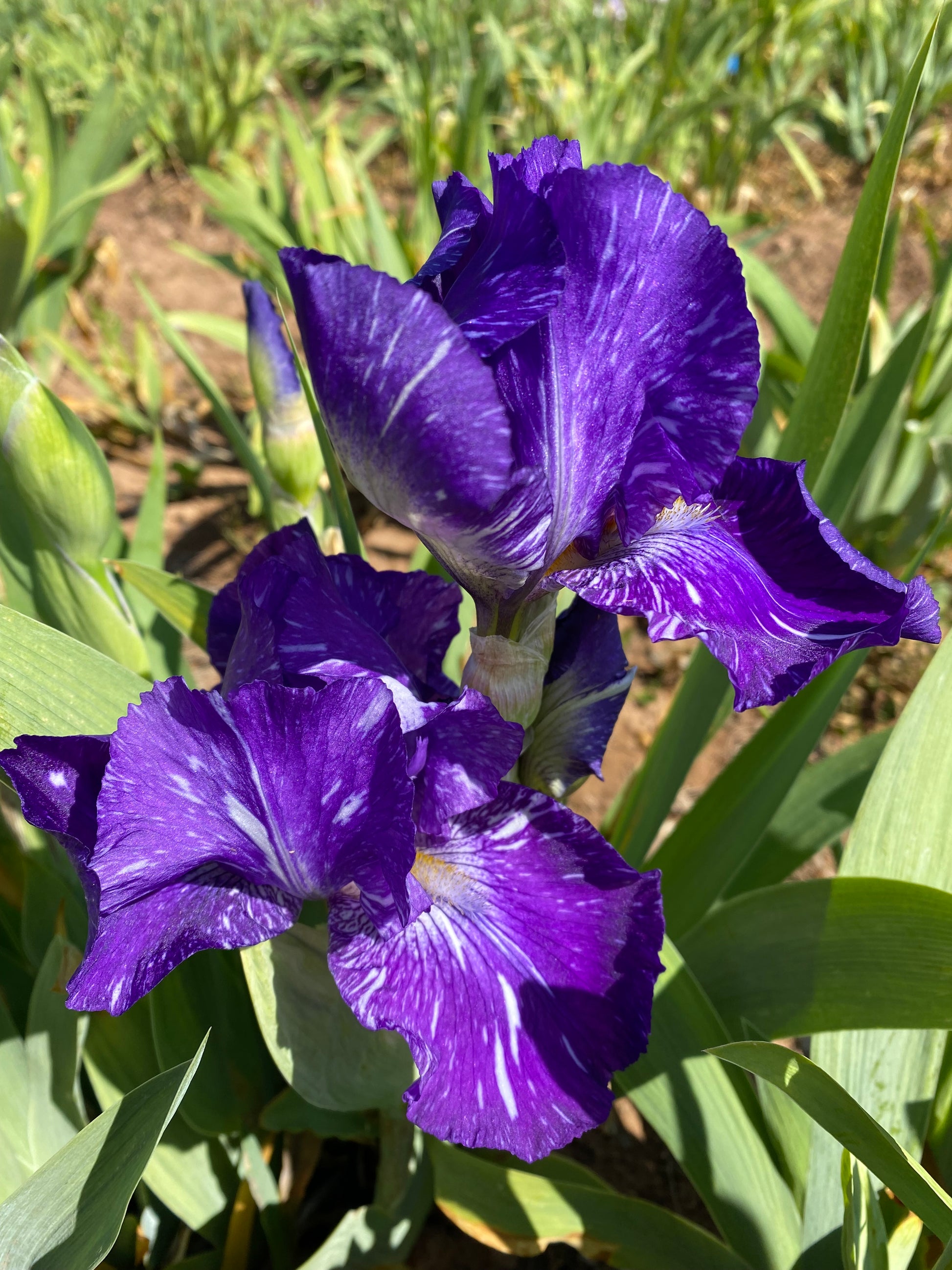 ‘Batik’ (Allan Ensminger, R. 1985). Seedling 79-79. BB, 26″ (66 cm). Midseason bloom. White ground, striped royal purple; yellow beard tipped white. ‘Aegean Star’ X ‘Purple Streaker’. Varigay Gardens 1986. Honorable Mention 1988; Favorite Guest 1988; Award of Merit 1990; Knowlton Medal 1992.