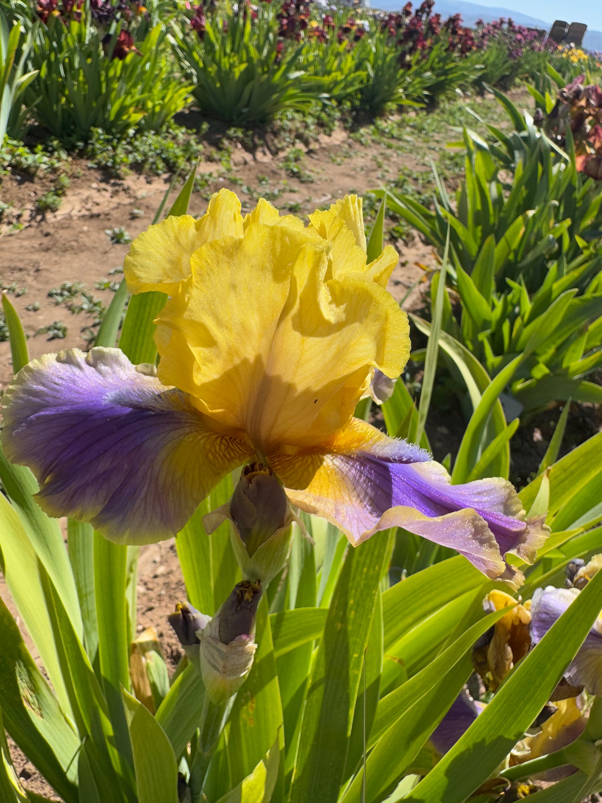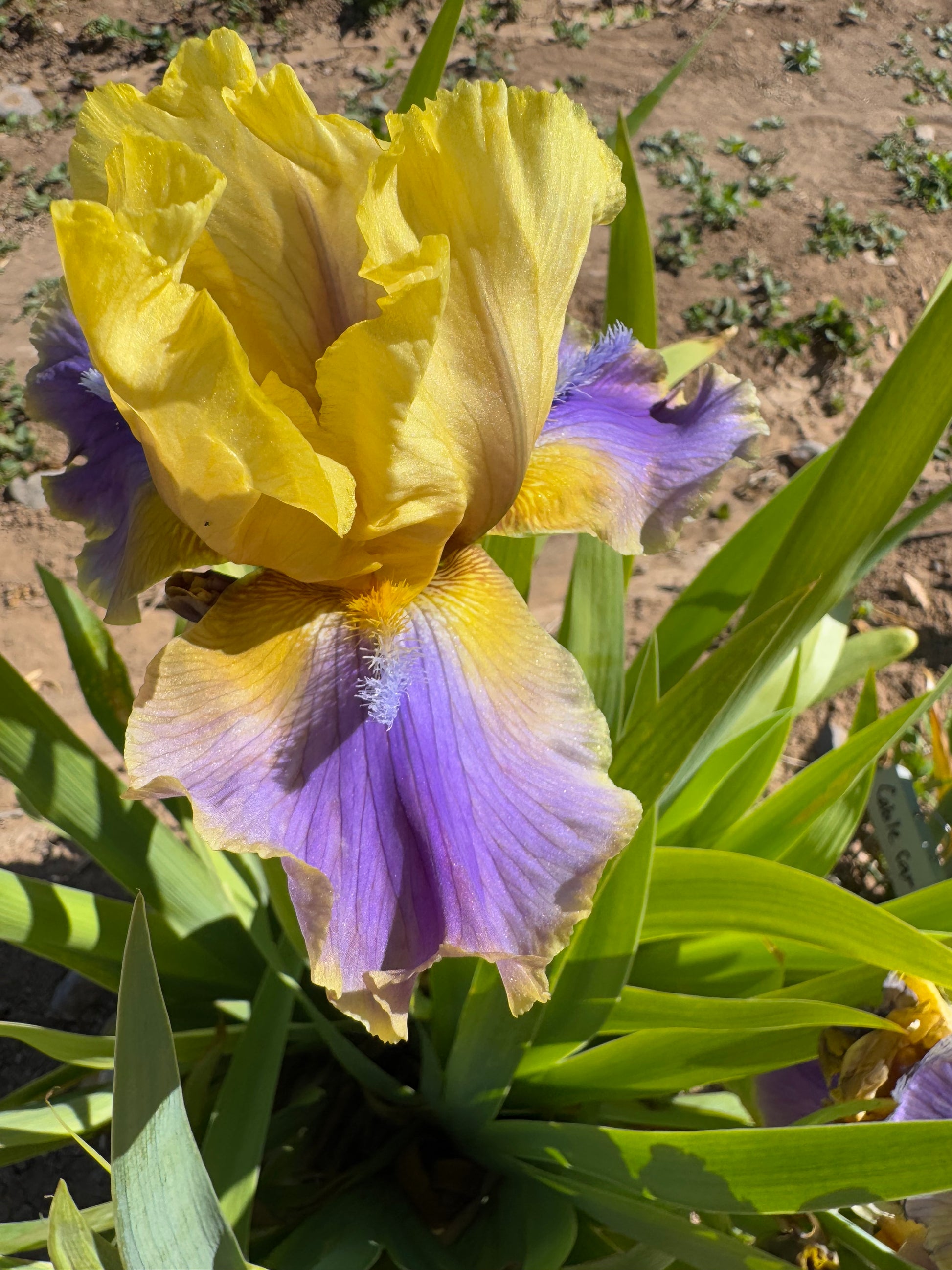 'Bermuda Triangle' (Anna and David Cadd, R. 1999). Seedling# 82-93-1. BB, 27" (69 cm), Midseason bloom. Standards and style arms old gold, midribs touched lavender; falls old gold, triangular fluorescent lavender purple wash from beard to edge, darkest at top; beards bronze, small fuzzy lavender horn; slight sweet fragrance. 'Marsh Light' X 'Branching Out'. Cadd's Beehive, O'Brien Iris 2000. Honorable Mention 2004, Award of Merit 2006.