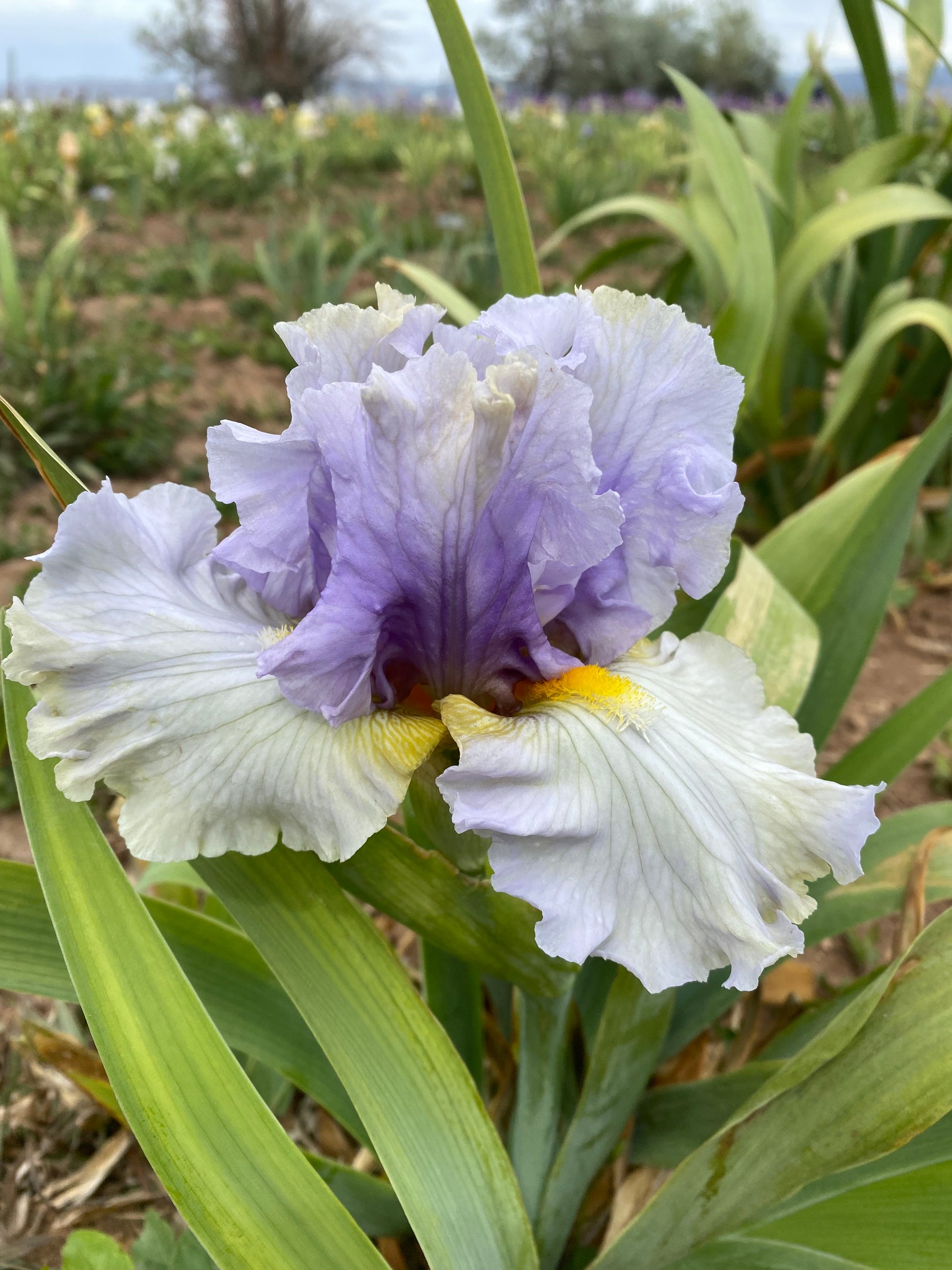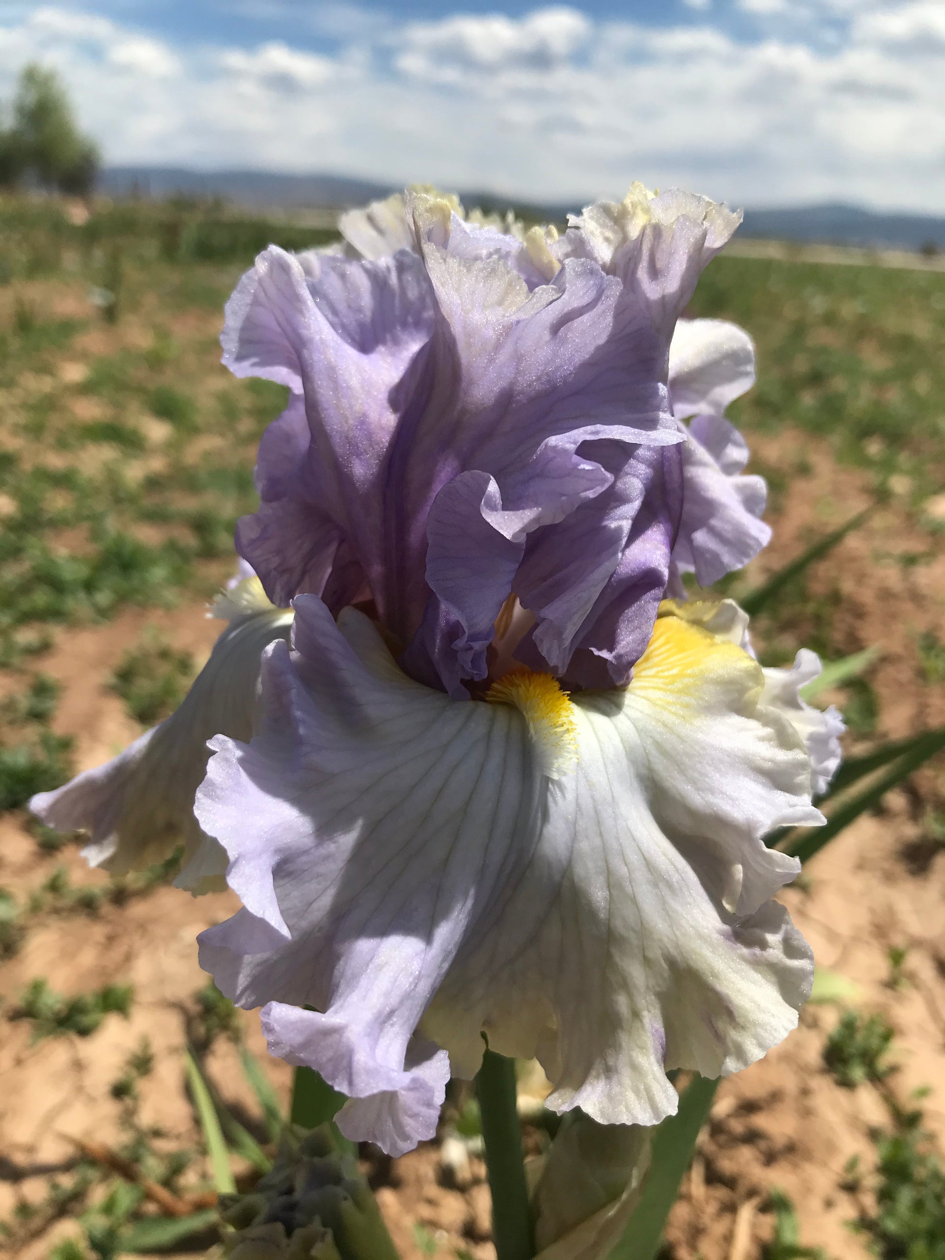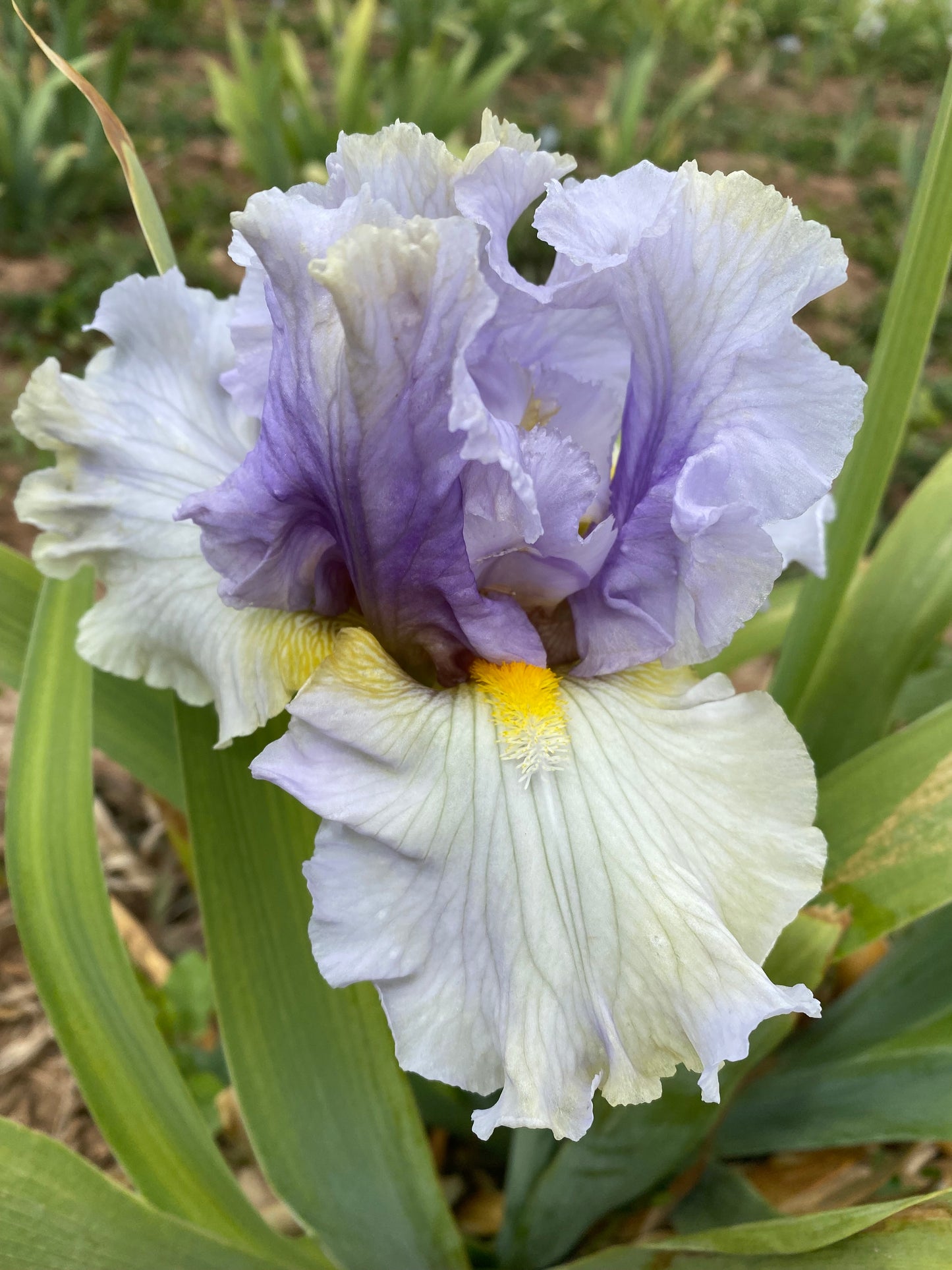 'Blockbuster' (Gerald Richardson, R. 2008). Seedling# 02-5-1. TB, 40" (102 cm), Midseason bloom. Standards greyed lavender, deeper violet flush at base; style arms pale amber; falls greyed lavender, pale amber reverse; beards golden orange; slight fragrance. 'Ivory Ghost' sibling. Rockytop 2010.