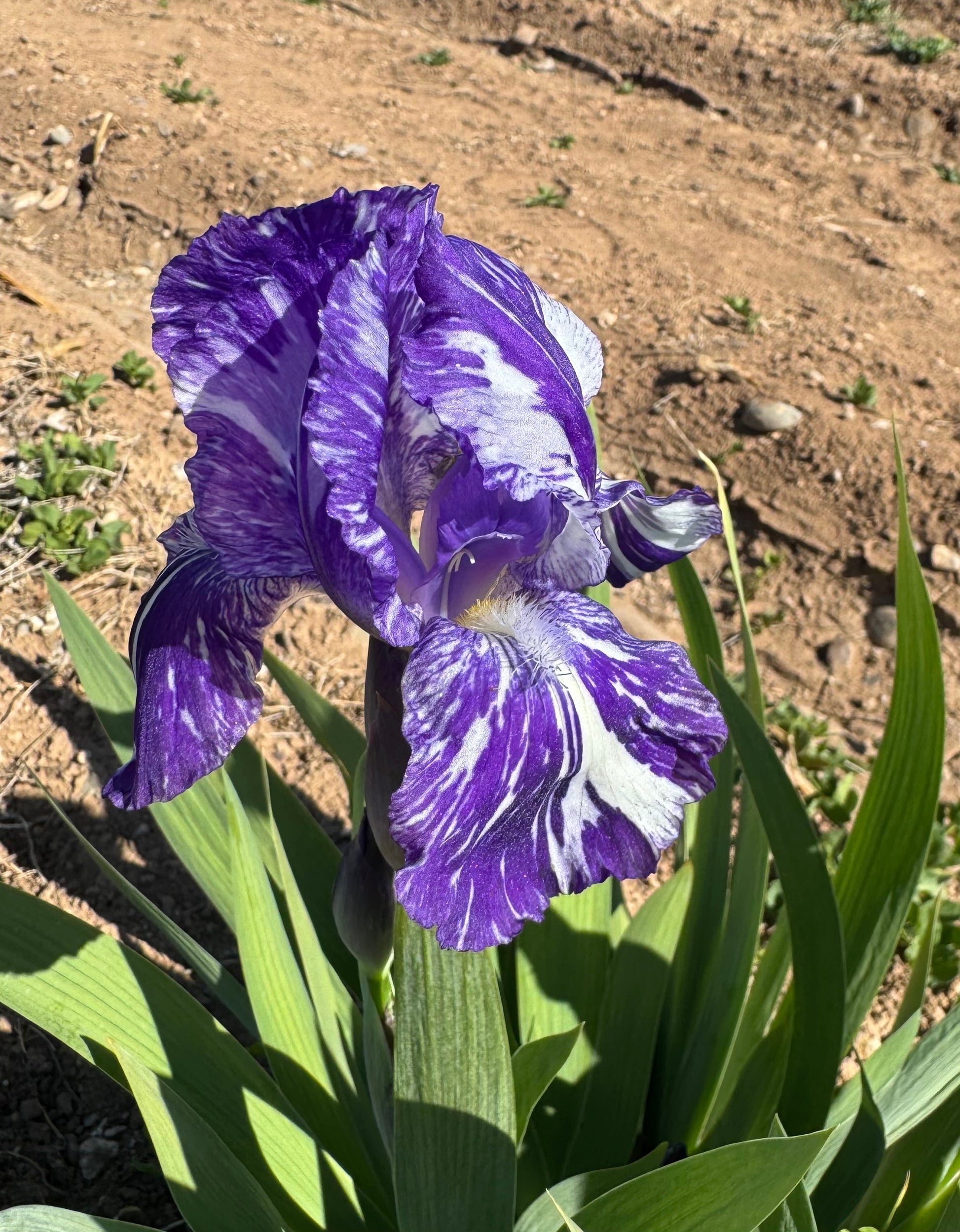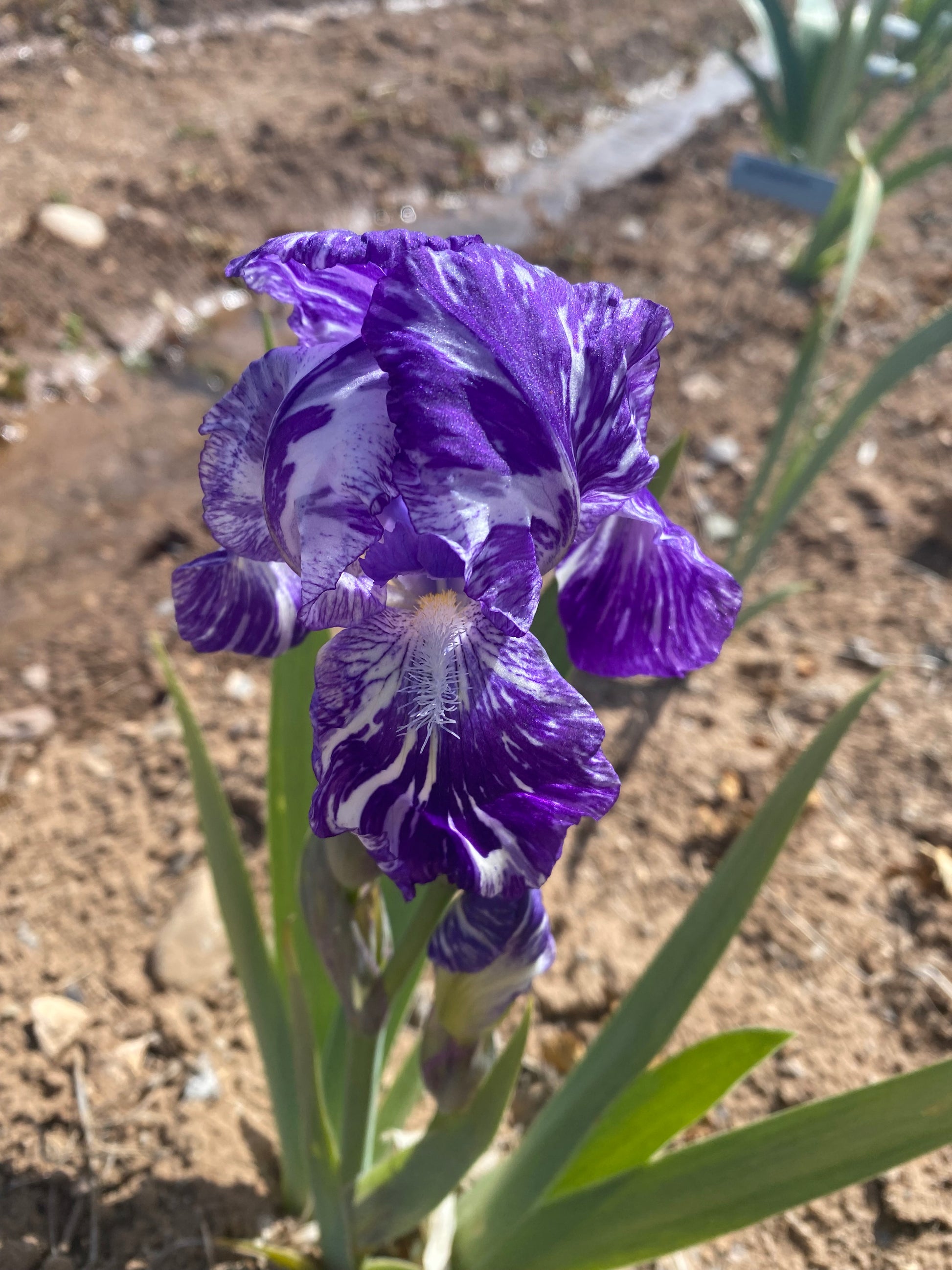 'Blueberry Filly' (Brad Kasperek, R. 1998). Seedling #94-13-67. IB, 23" (58 cm). Very early bloom. Blue violet (RHS 89B/C), silver white streaking; style arms violet blue; beards light yellow; broken color pattern; slight fragrance. 'Batik' X 'Ostry White'. Zebra 2000.