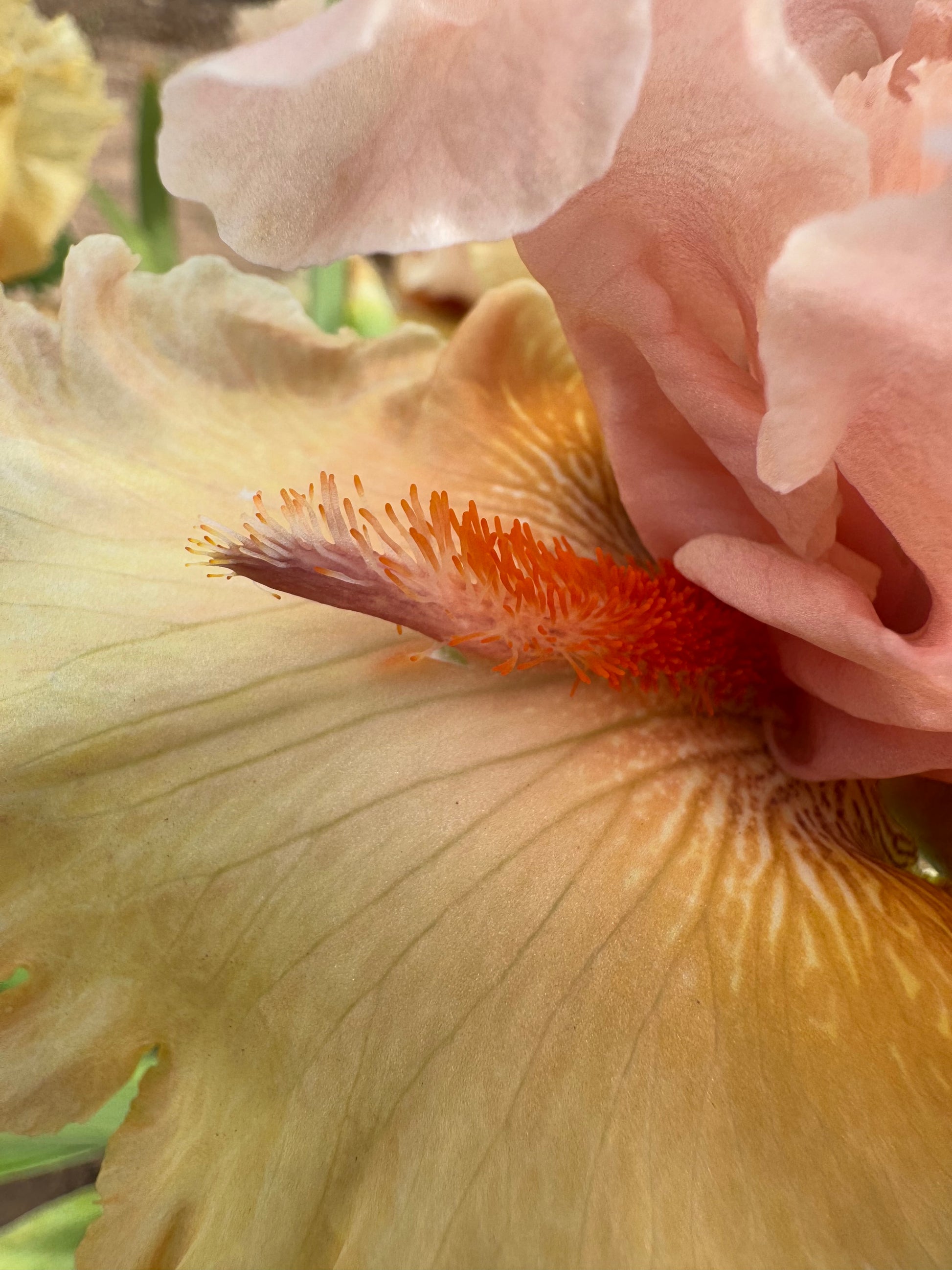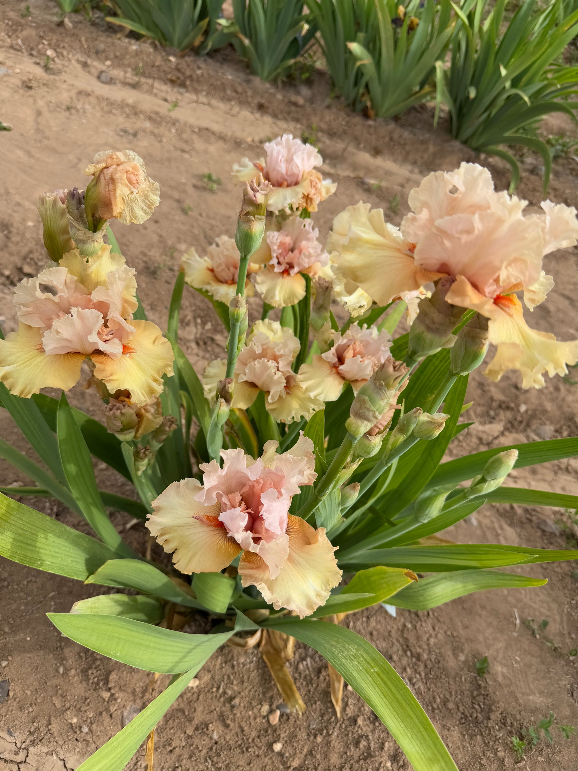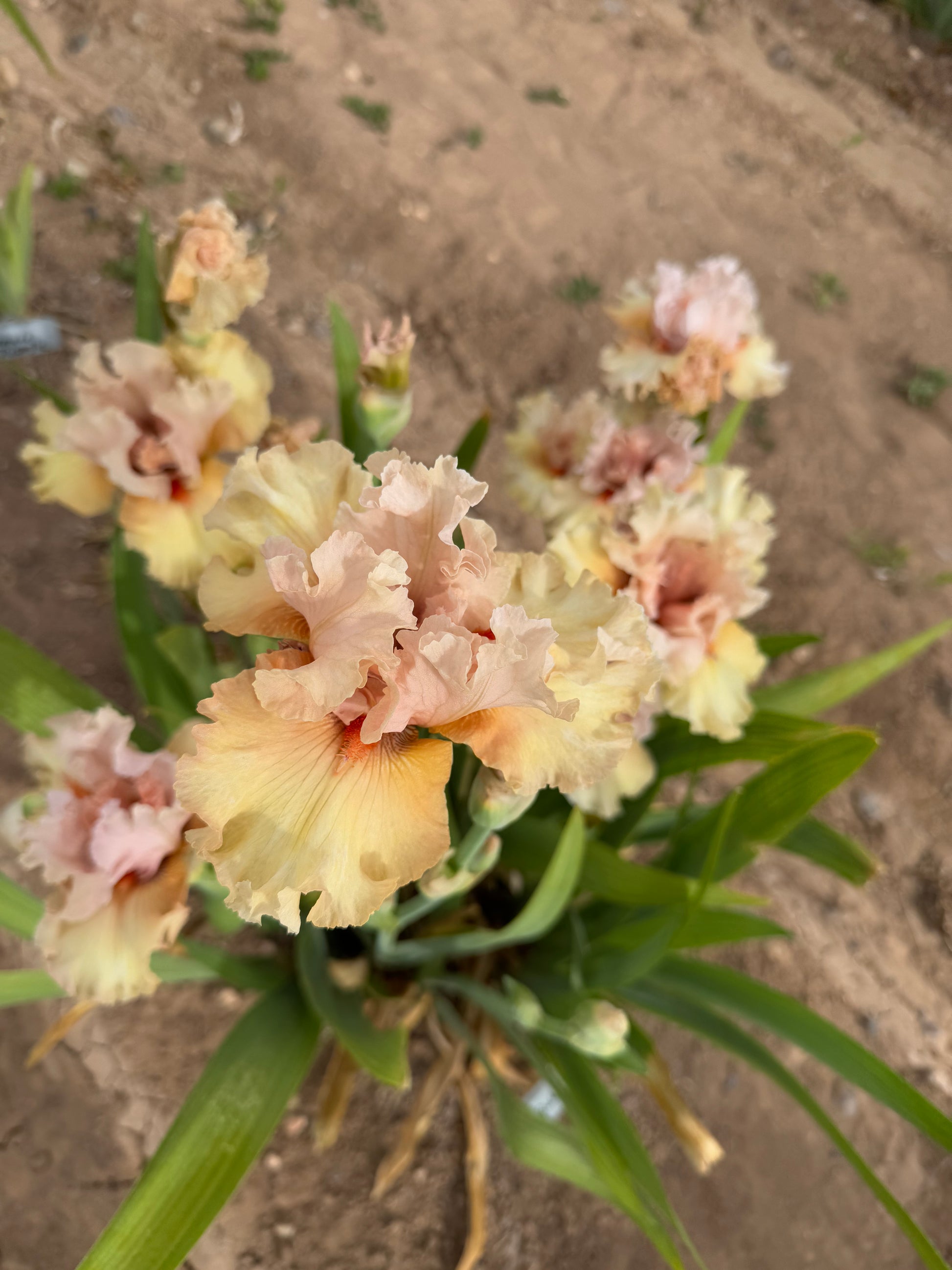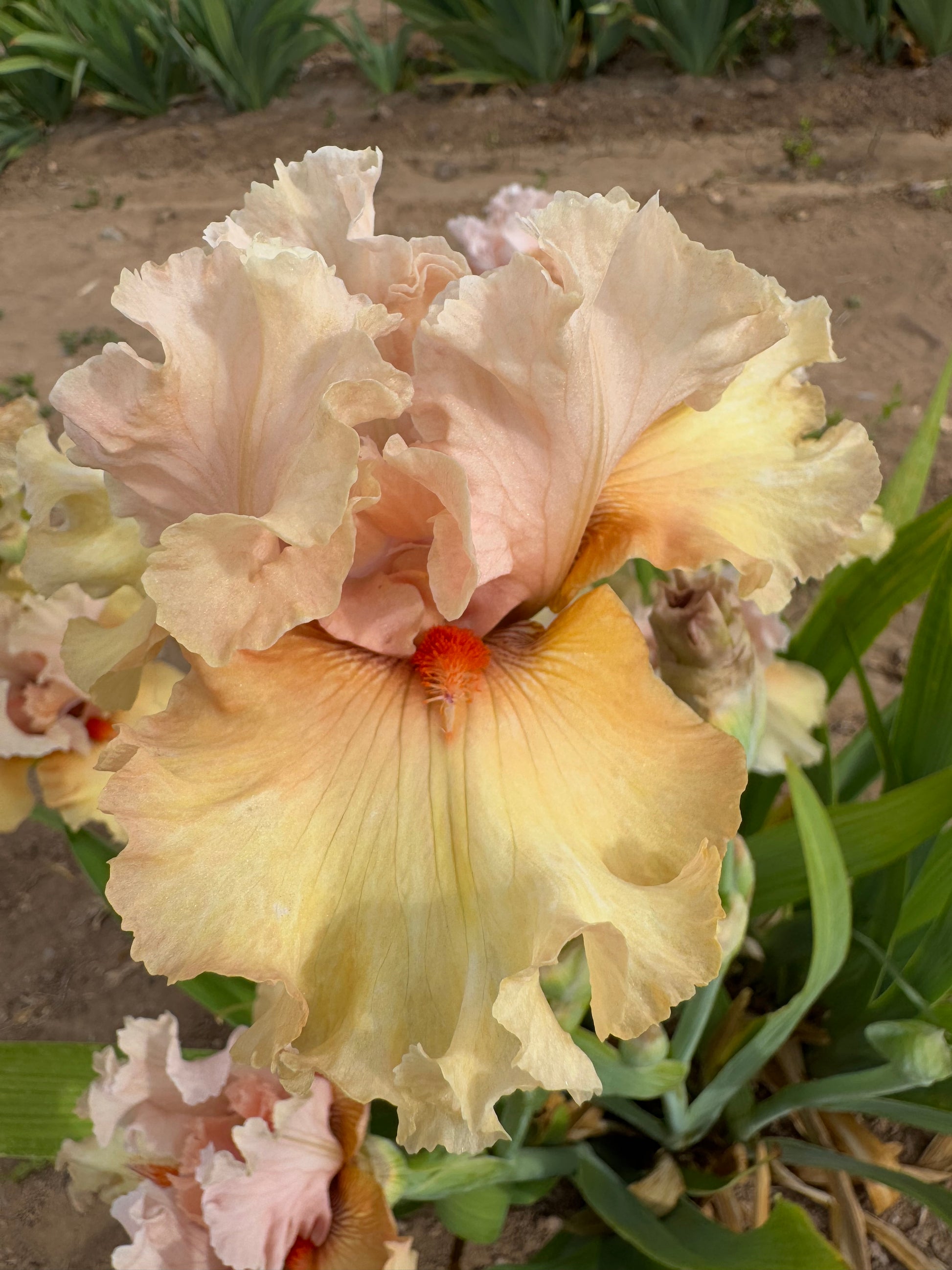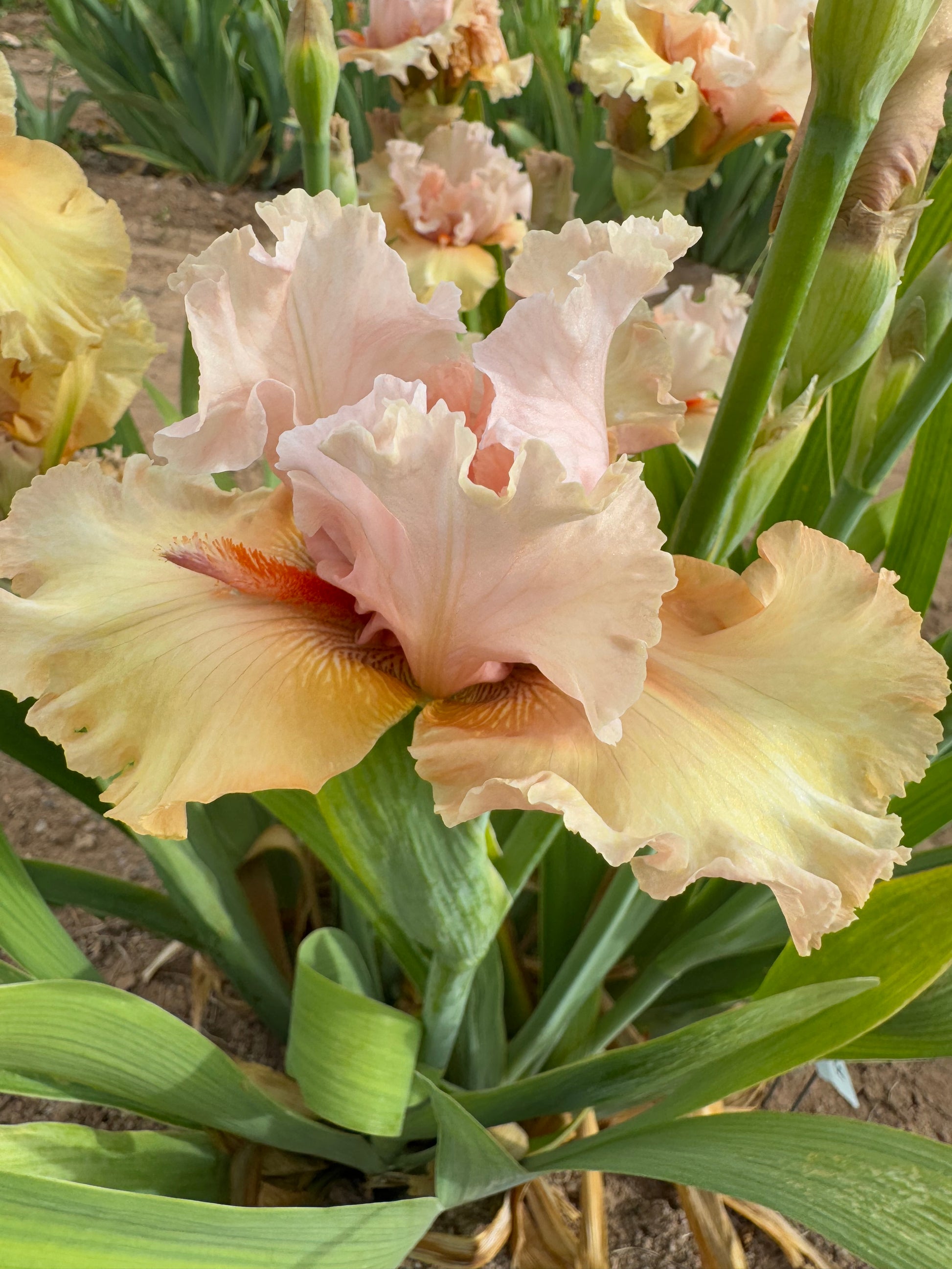 'Bubble Baby' (Tom Burseen, R. 2013). Seedling 010-2123A. TB, 34" (86 cm), Midseason bloom. Standards and style arms light neyron-rose (RHS 56B), frosted white edges; falls cream-yellow, tan washed edges, amber-yellow shoulders; beards orange; slight spicy fragrance; very ruffled. 'Buginarug' X seedling 08-1004: (06-30, 'Din' pollen parent, x 'Ming Lord'). Burseen 2014.