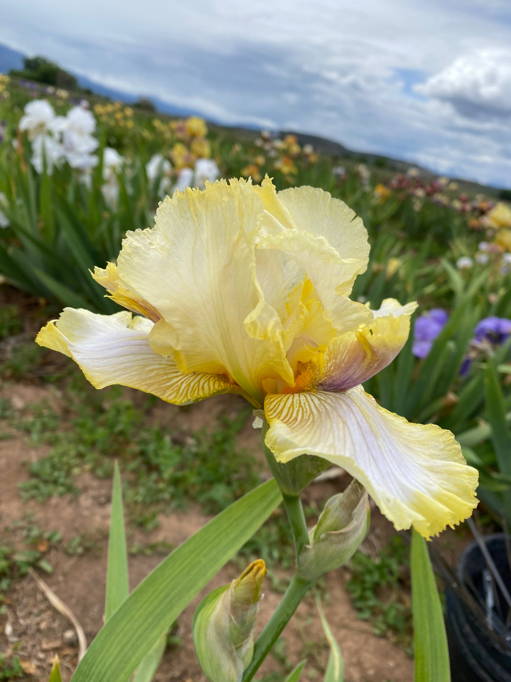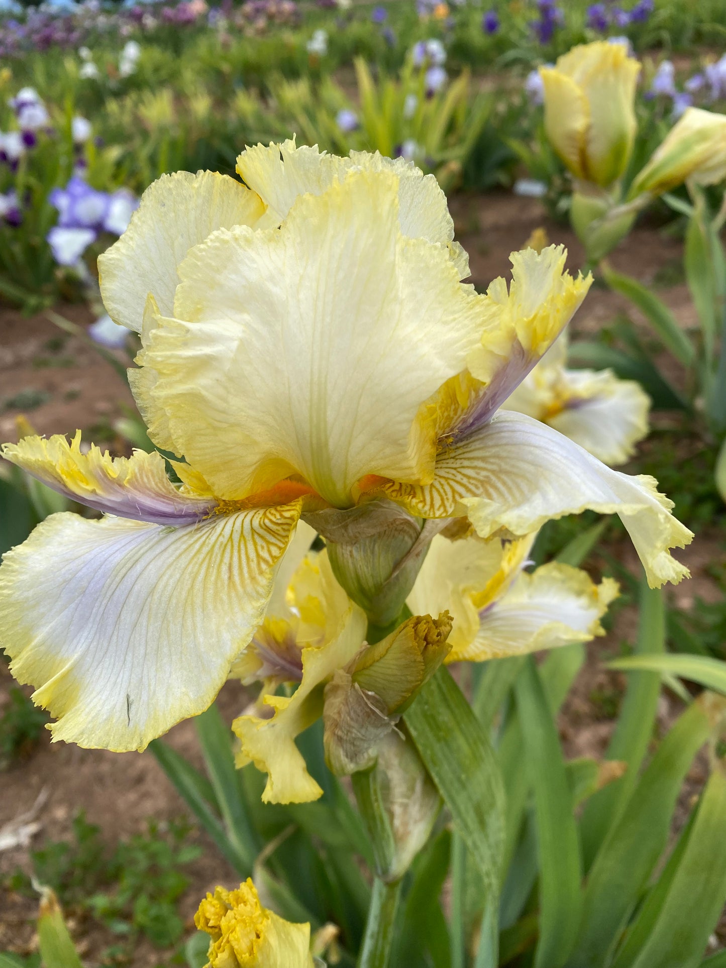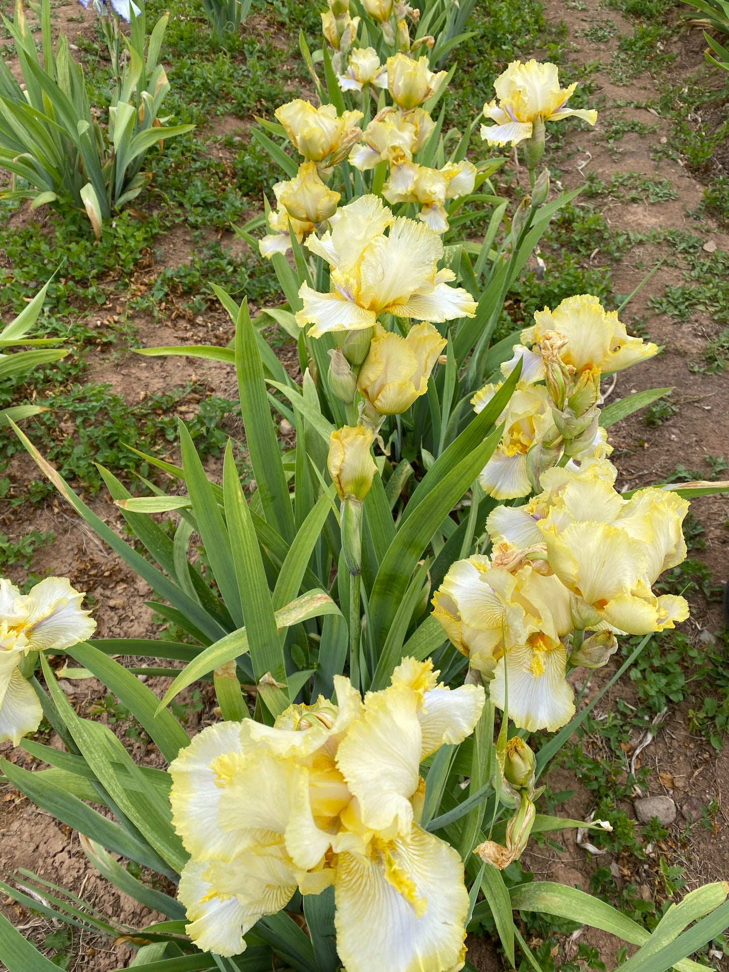 'Canary Feathers' (Walt Dean, R. 1996). TB, 36" (91 cm), Midseason bloom. Yellow, slight rosy central blush in falls.; beards yellow, canary yellow feathery flounces. 'Too Many Flounces' X unknown. Stanley Iris 1997.
