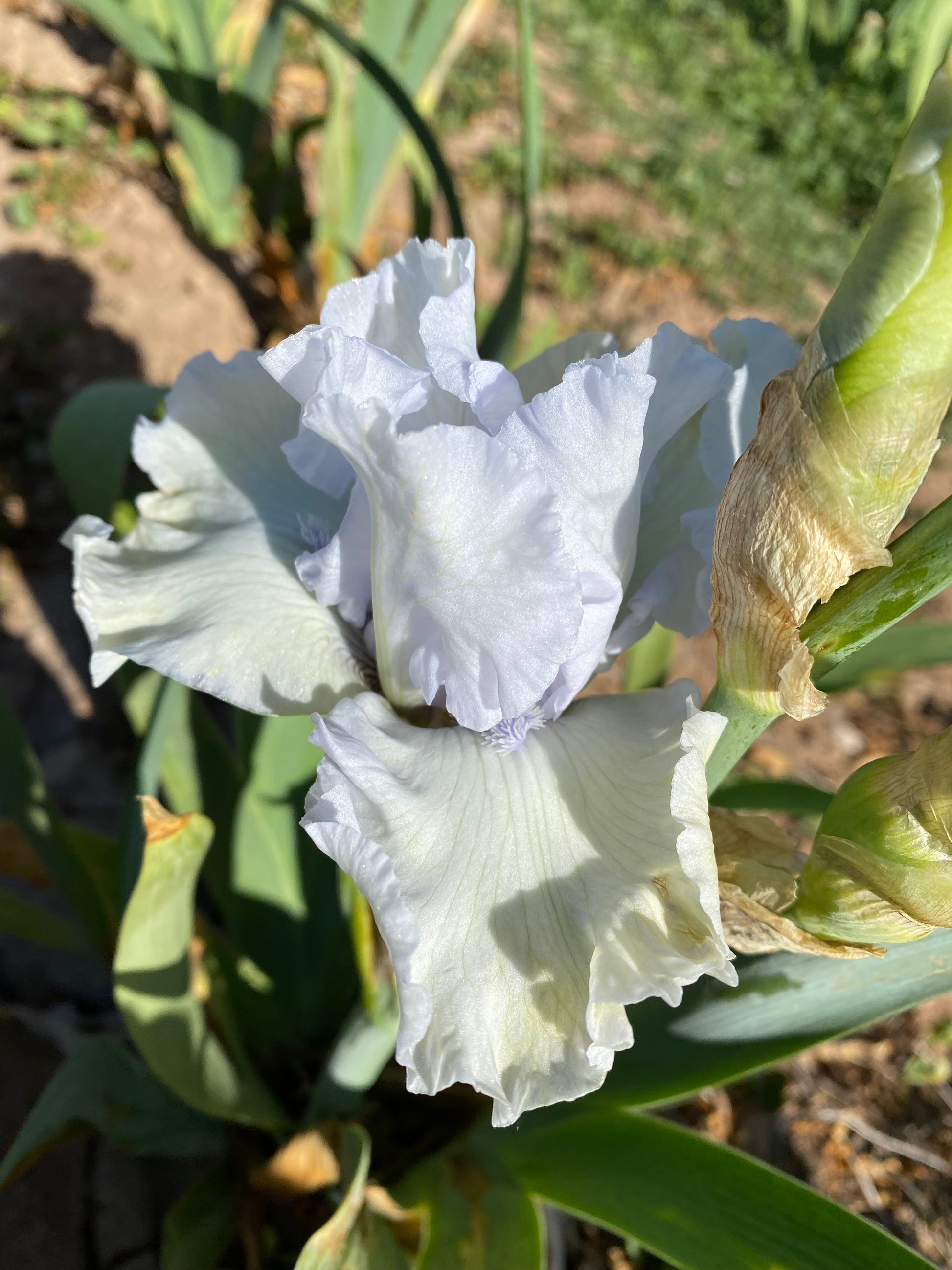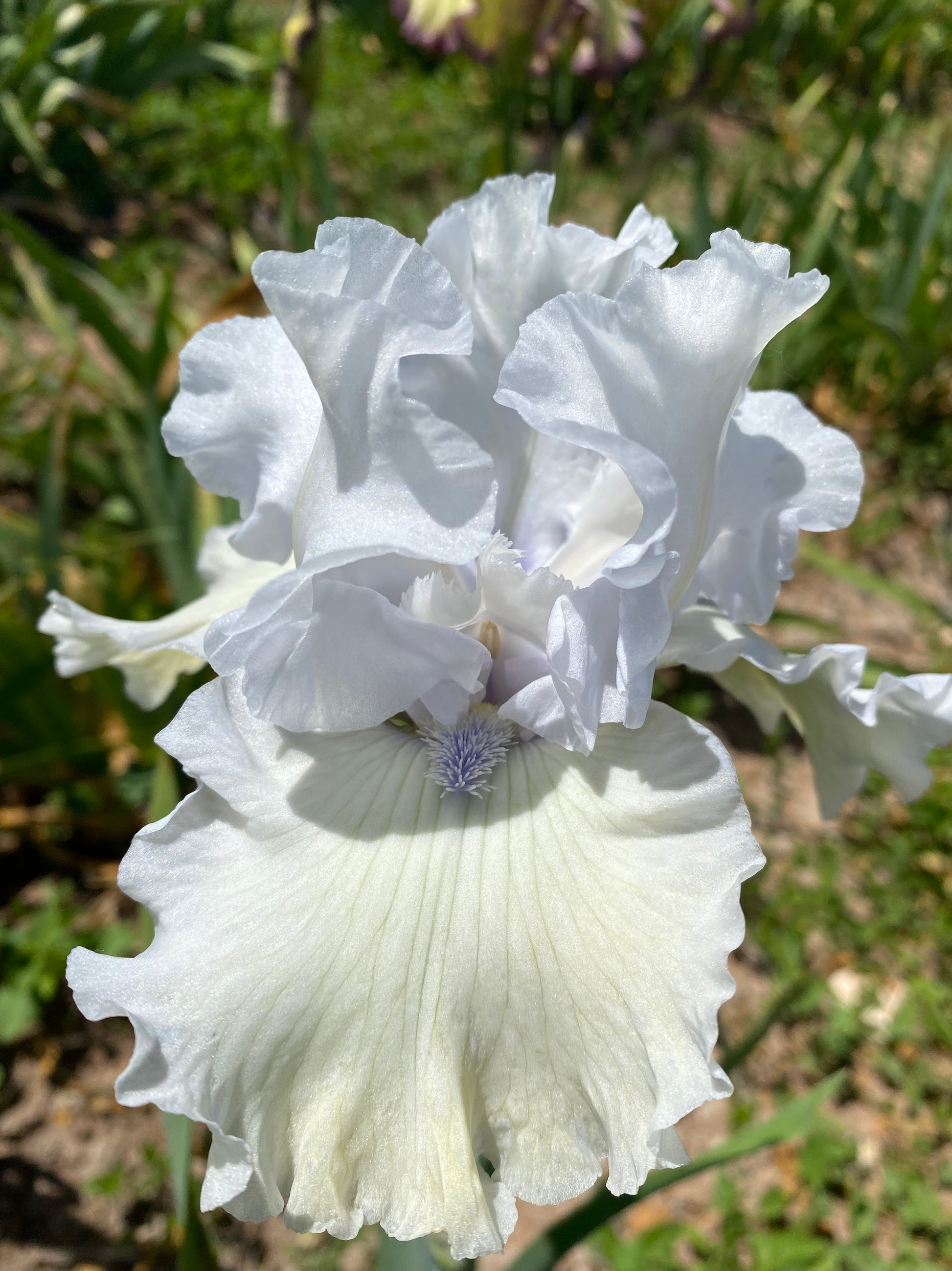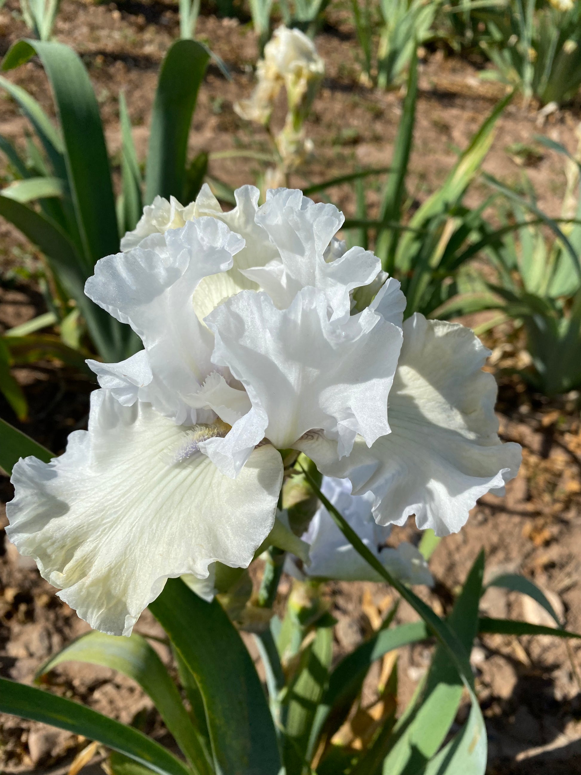 ‘Captivating’ (George Sutton, R. 1997). Seedling# G-29BR. TB, 38″ (97 cm). Late midseason bloom. Heavily ruffled diamond-dusted light lavender self; beards light lavender, hairs tipped light yellow. ‘Winterscape’ X ‘Twice Thrilling’. Sutton 1998.