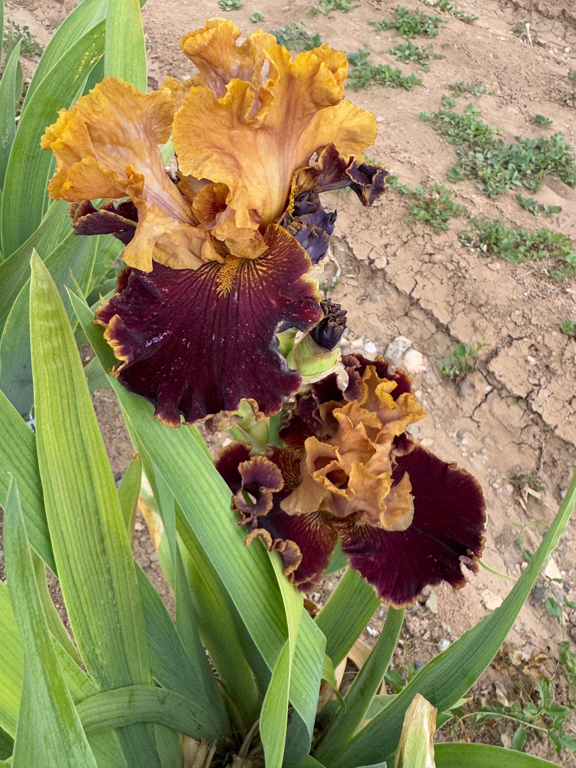 'Cordoban Leather' (Michael Sutton, R. 2022) Seedling AE-351-B, TB, 35" (89 cm), Early to midseason bloom. Standards brown, flushed red-violet at midrib, gold gilt wire rim; style arms dark almond; falls dark burgundy, near black, lighter ¼˝ band at edge; beards brown; serrated. 'Bravery' X seedling AB-6449-C: ('Raspberry Swirl' x 'Elderberry Pie'). Sutton’s 2022. Honorable Mention 2024.
