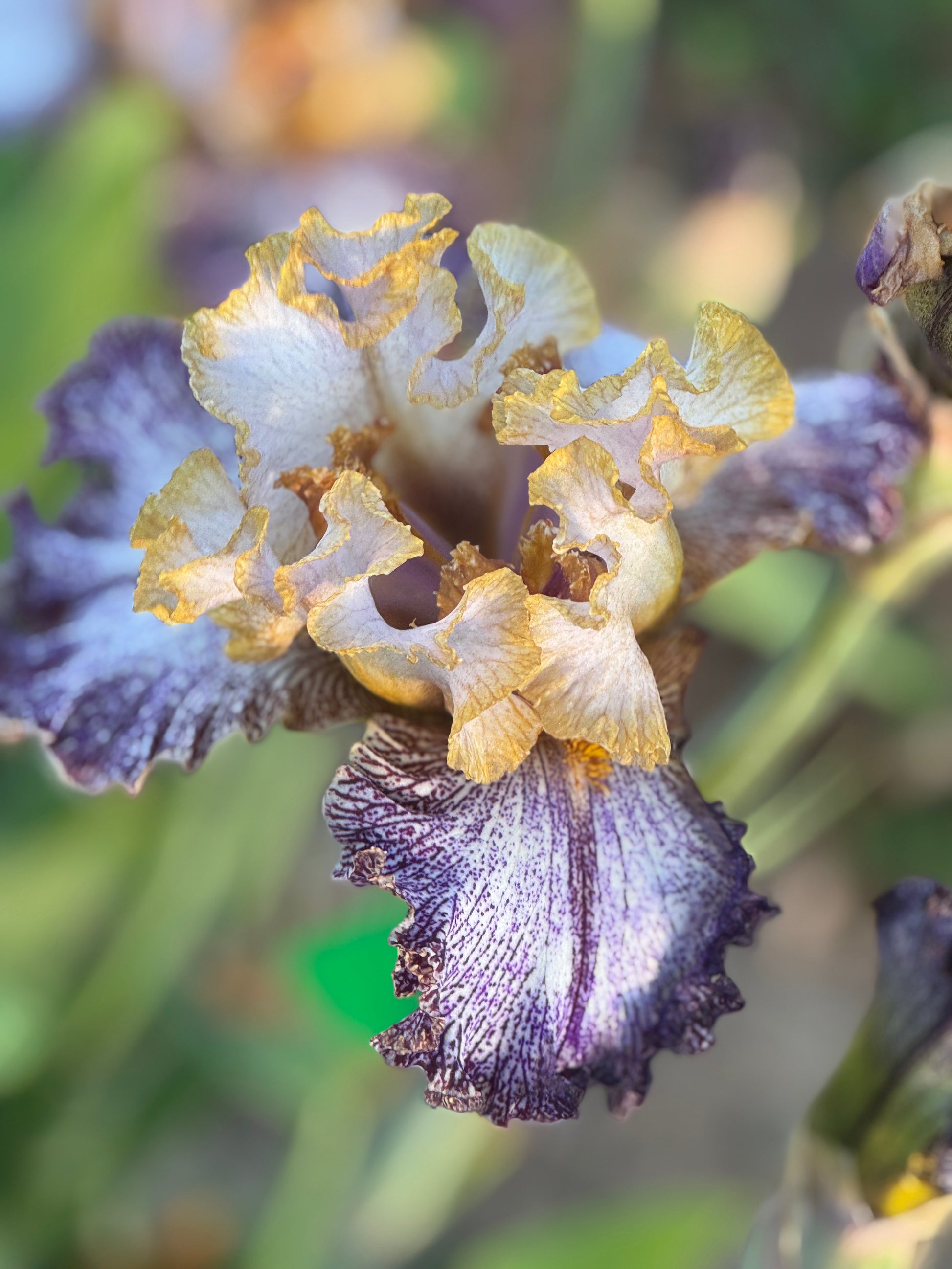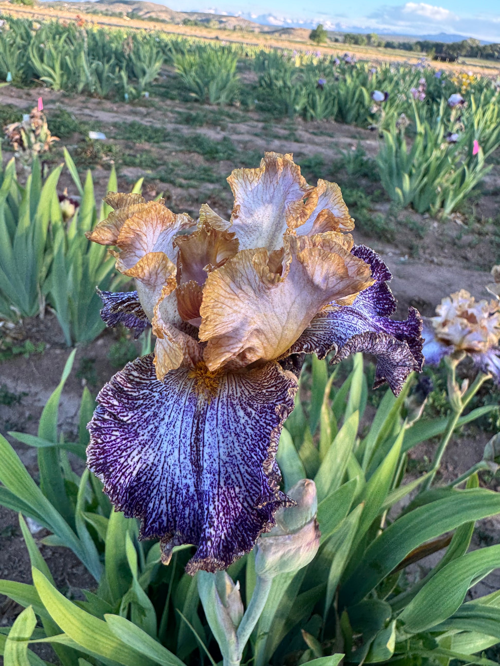 'Dipped In Dots' ( Paul Black, R. 2011) Seedling O174XX. TB, 46" (117 cm). Late to very late bloom. Standards chalky slate white, greenish gold flush up midrib, wide brassy gold blended band; style arms brassy gold, rust tan streaks up crests; Falls white, plicata washed mid purple overall becoming heavier toward edges, narrow plum brown band rimmed brass gold; beards violet white base, tips old gold, brown in middle; pronounced sweet fragrance. 'Magic Masquerade' X 'Ring Around Rosie'. Mid America 2012. Honorable Mention 2014, Award of Merit 2016.