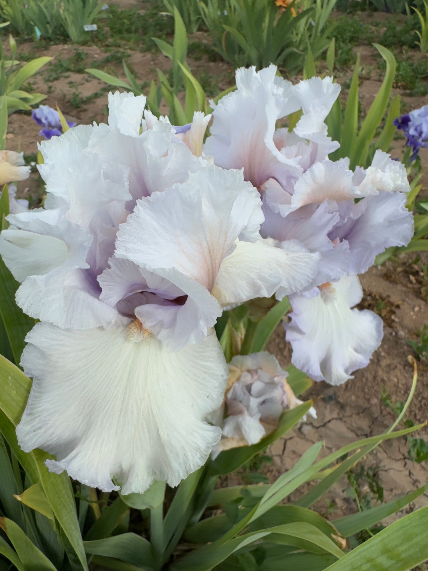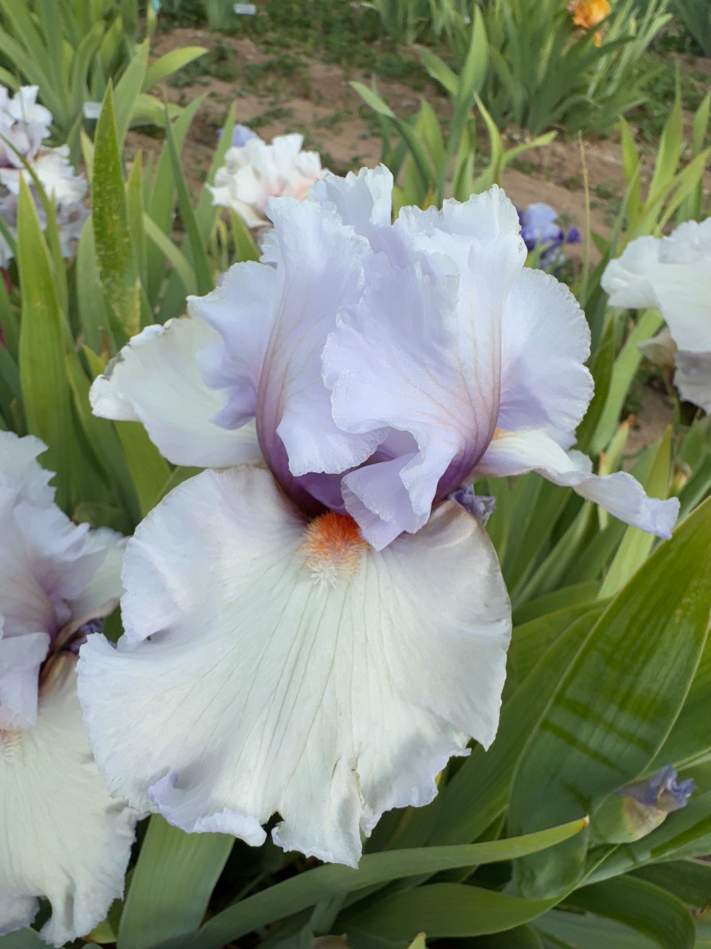 'Draw Me Close' (Robert Van Liere, R. 2015). Seedling 24HB1. TB, 27.5" (70 cm), Midseason to late bloom. Standards silver-blue, pink band on midrib, diamond dusting; style arms silver-blue, pink band on back side; falls silver-blue; beards tangerine. 'Boogie Woogie' X 'Keeping up Appearances.