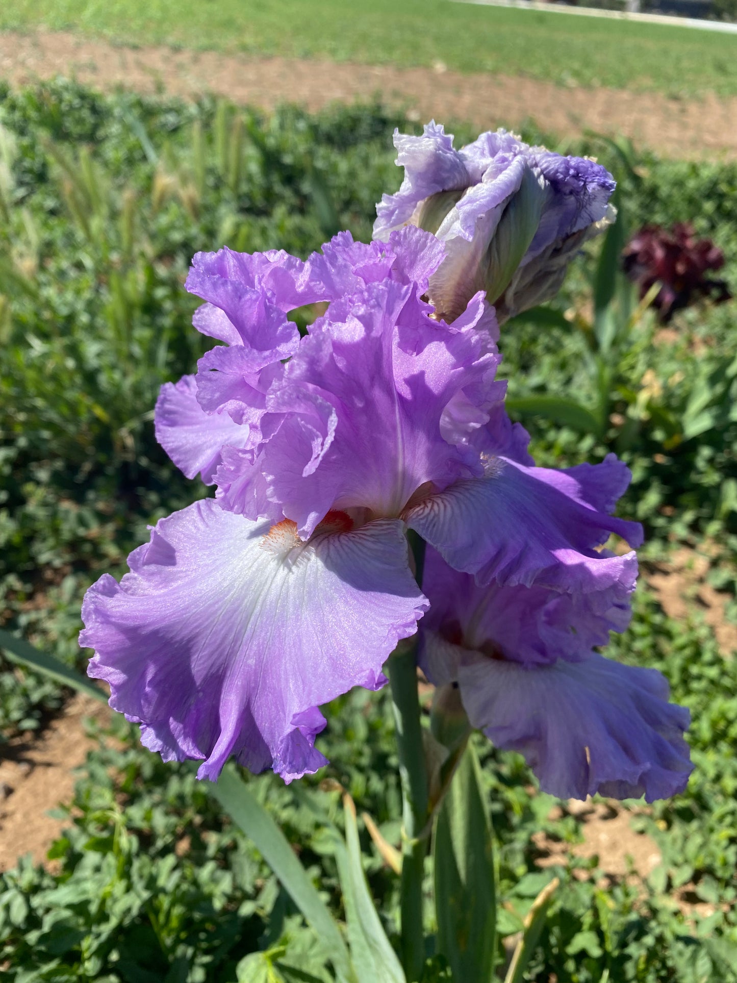 'Excuse Me Darling' ( Barry Blyth, R. 2001). Seedling# H44-1. TB, 34" (86 cm). Early to midseason bloom. Ruffled and laced silvery lilac mauve self; beards white, hairs tipped coral; slight musky fragrance. 'Mallow Dramatic' X 'Louisa's Song'. Tempo Two 2001/02.
