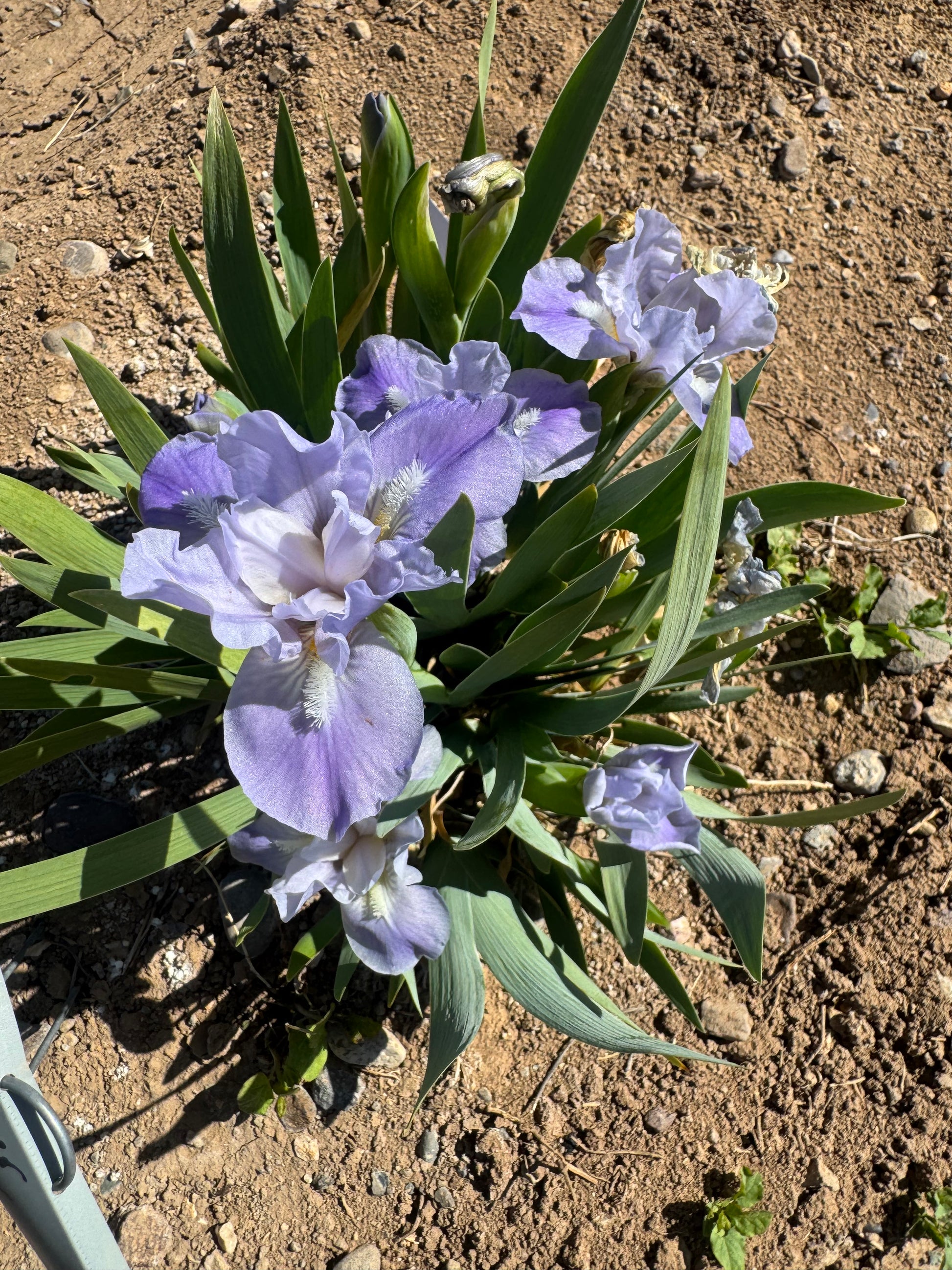 'Feather Duster' (William and Ada Godfrey, R. 2004). Seedling #FFLCX1. MDB, height 7" (18 cm). Late midseason bloom. Standards pale lavender; style arms almost white lavender; falls deeper violet; beards pale lavender, orange in throat. Seedling #MDFFLC1: ('Fairy Footsteps' x 'Little Christopher') X self. Hermit Medlars Walk 2005.