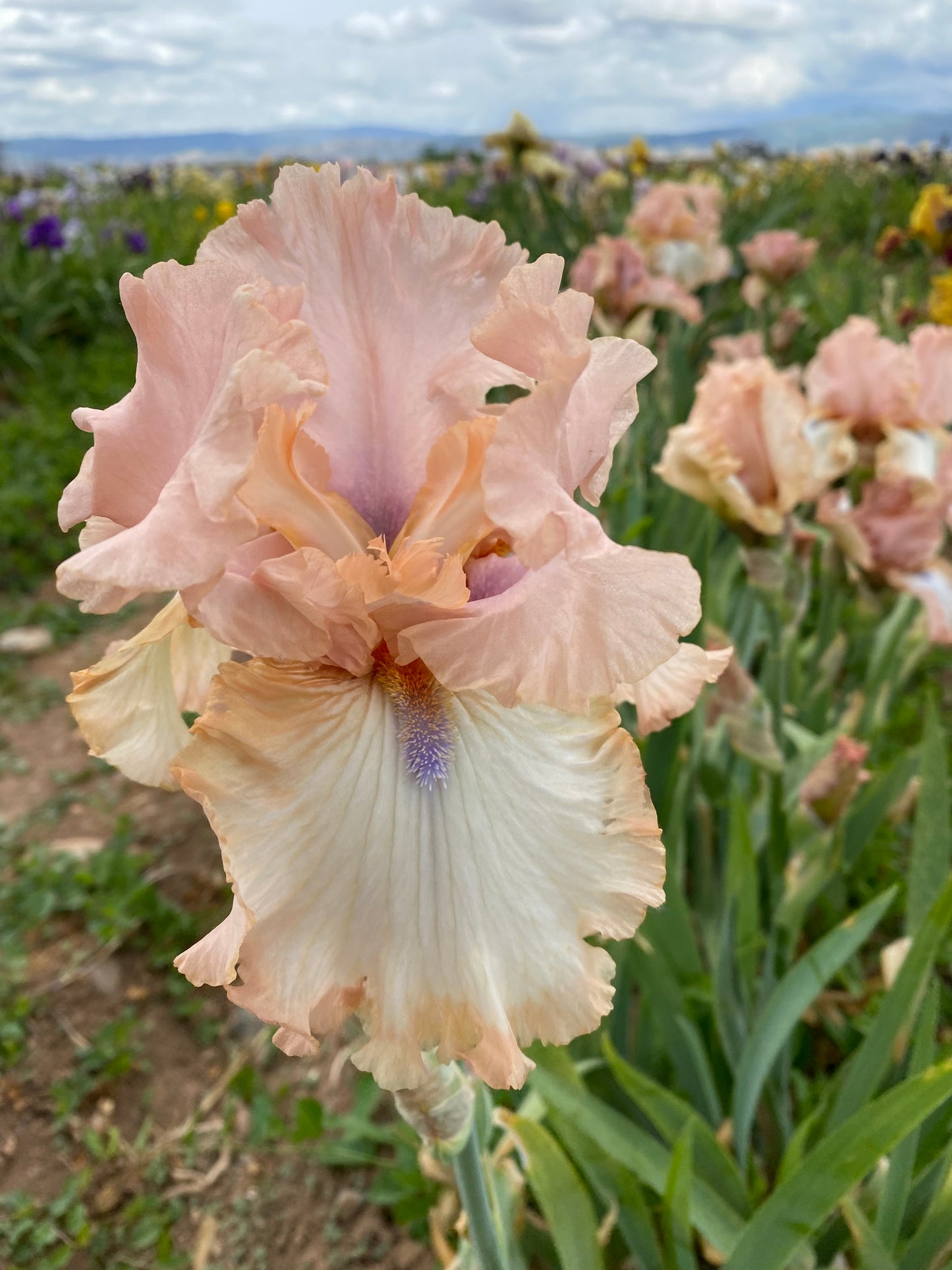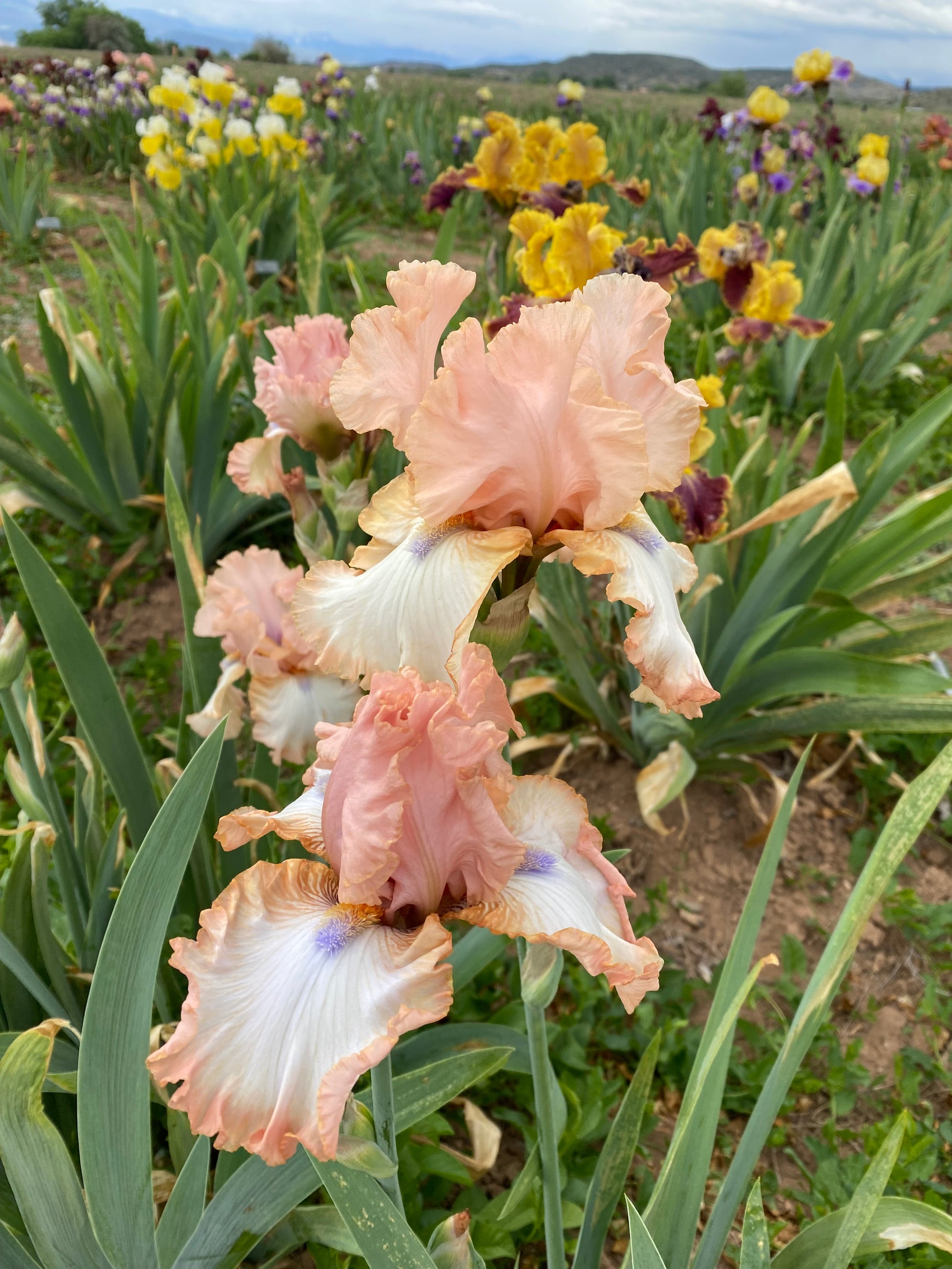 ‘Flirtini’ (Michael Sutton, R. 2011). Seedling# T-524. TB, 36″ (91 cm), Midseason bloom. Standards mauve pink, edged gold wire rim; style arms peach pink; falls white, flesh pink 1/4″ band at edge, greyed orange shoulders; beards tangerine in throat, orange in middle, lavender blue at end; ruffled. ‘Barbara My Love’ X ‘Bride’s Blush’. Sutton 2012. Honorable Mention 2016.