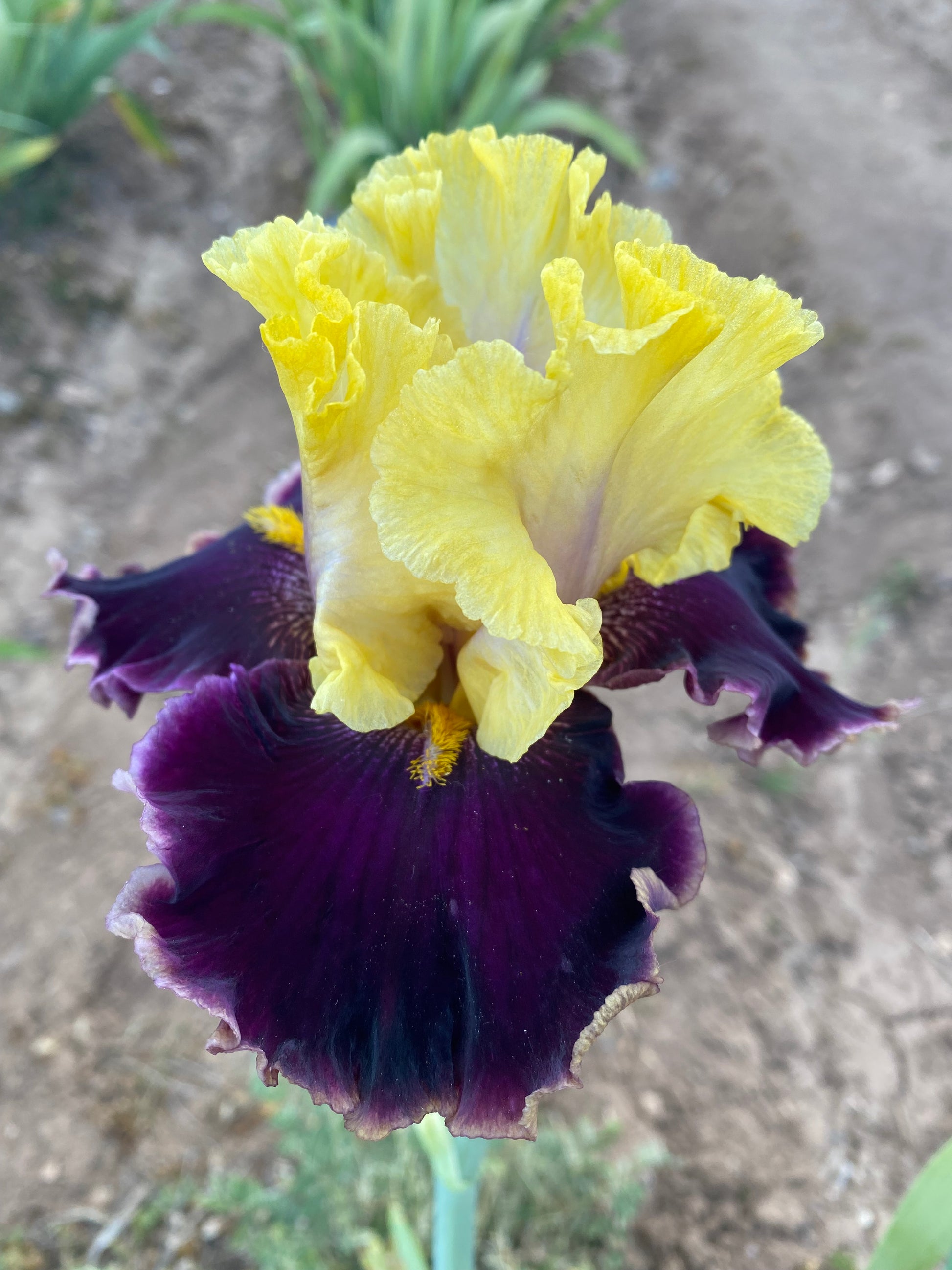 'Football Hero' (Lynda Miller, R. 2014). Seedling# 8010A. TB, 36" (91 cm). Midseason bloom. Standards butter yellow; style arms same, accented violet; falls plum-purple, pale smoky orchid edged; beards gold; slight musky fragrance. 'Hoosier Dome' X 'Saturn'. Salmon Creek 2015. President's Cup 2015; Favorite Guest 2015; Favorite Guest 2016; Honorable Mention 2017; Award of Merit 2019; John C. Wister Medal 2021; American Dykes Medal 2022.