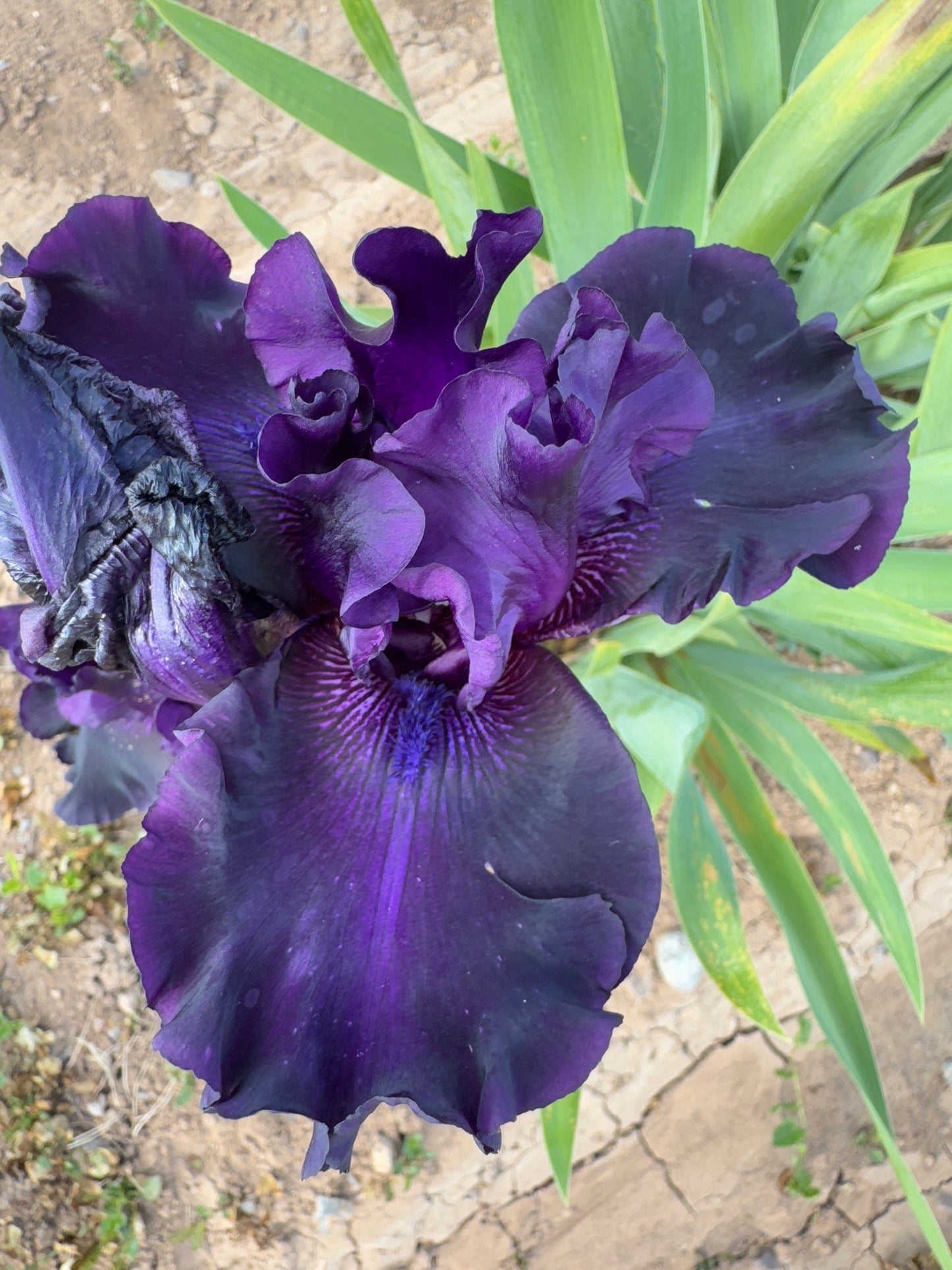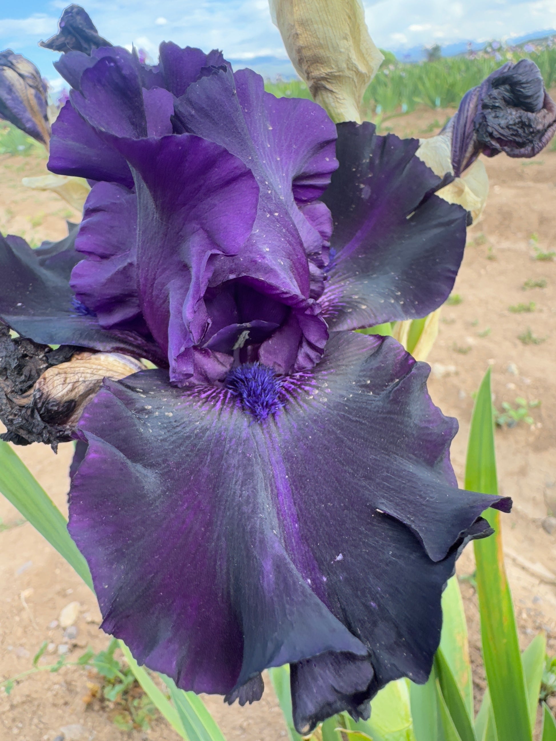 'Ghost Train' (Schreiner, R. 2000). Seedling# EE 134-4. TB, 37" (94 cm), Midseason bloom. Dark purple black (RHS 202A) self; beards dark purple black. 'Around Midnight' X 'Hello Darkness'. Schreiner 2000. Honorable Mention 2002; Award of Merit 2004.