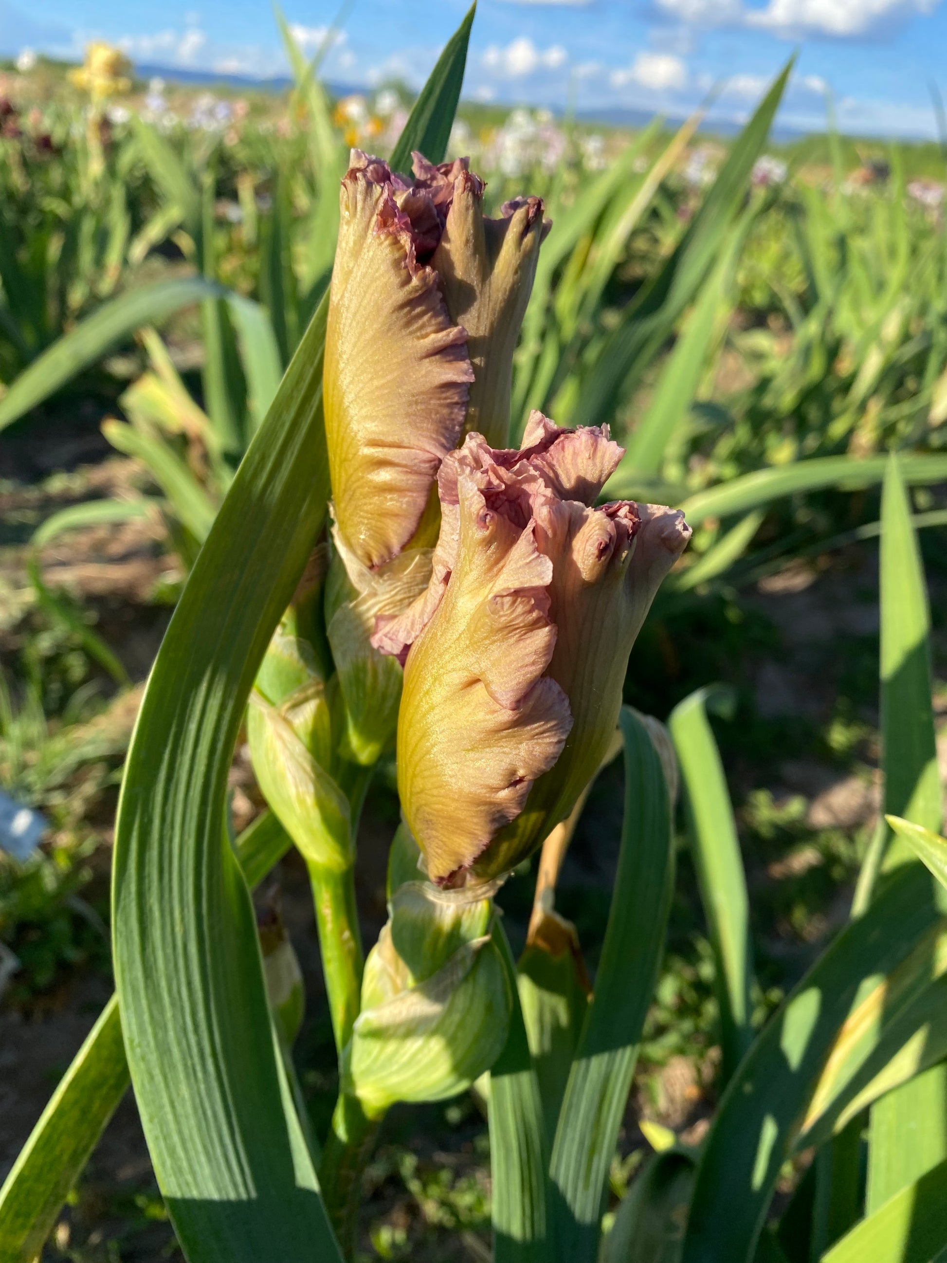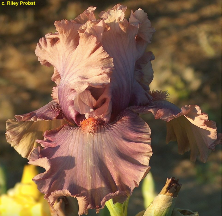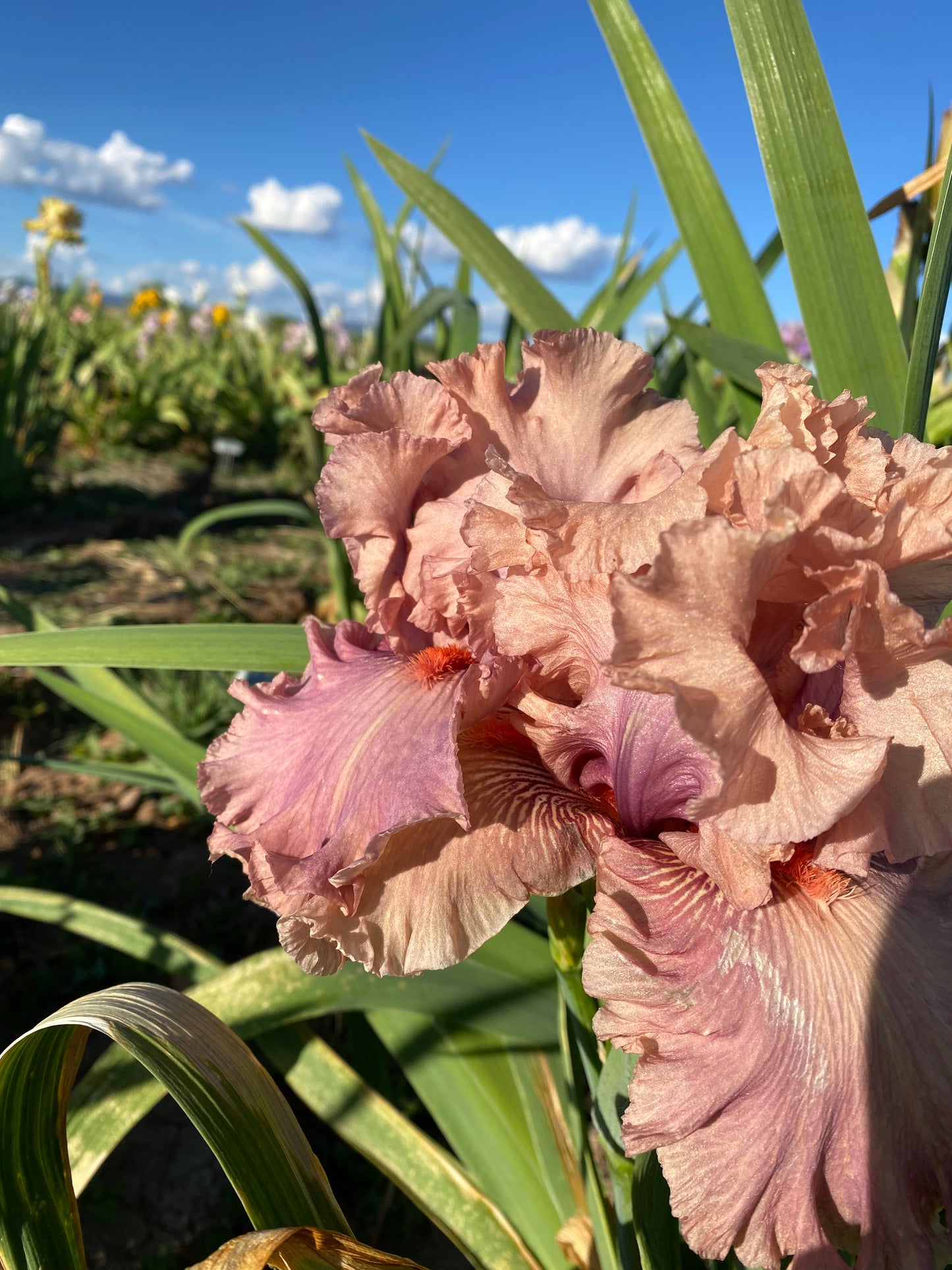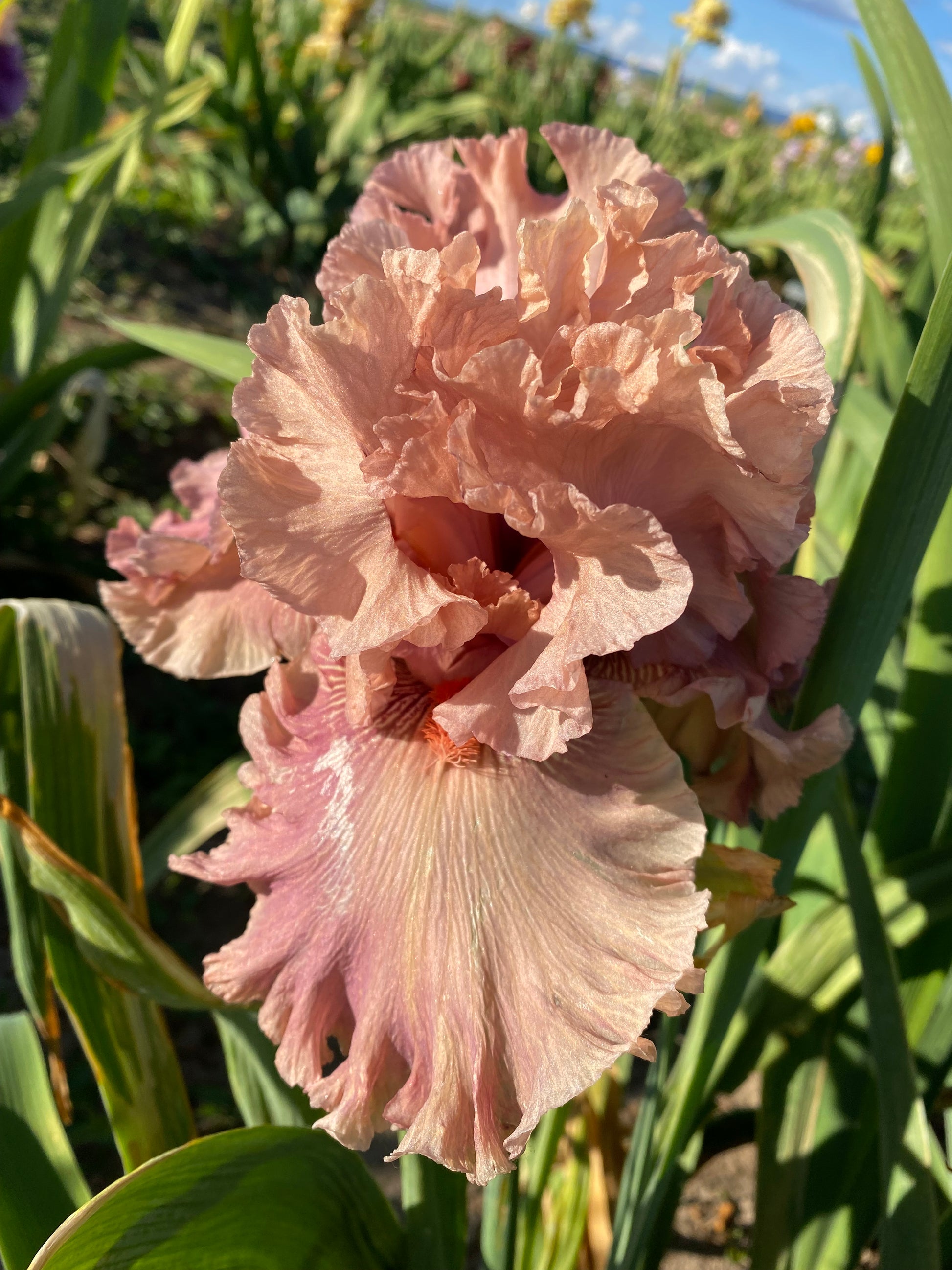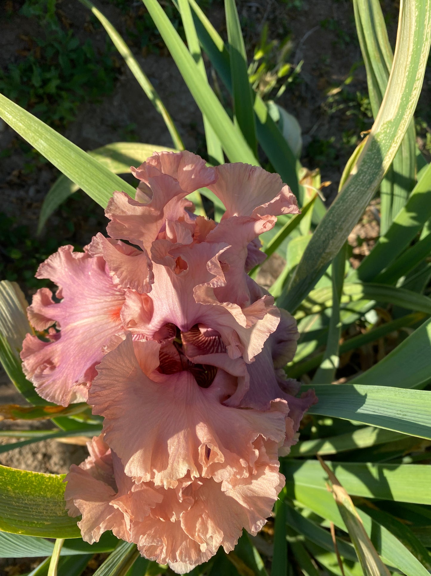 'Good Morning Beautiful' (Alex Stanton, R. 2015). Seedling# ST07-555. TB, 36" (91 cm), Early to late bloom and rebloom. Standards mauve-pink, purple flush at midrib; style arms mauve-pink, purple stigmatic lip; falls mauve-pink, purple veining at shoulders; beards salmon-pink, light pink end; very ruffled; slight sweet fragrance. 'Bewitchment' X 'Epicenter'. 2012 Stanton.