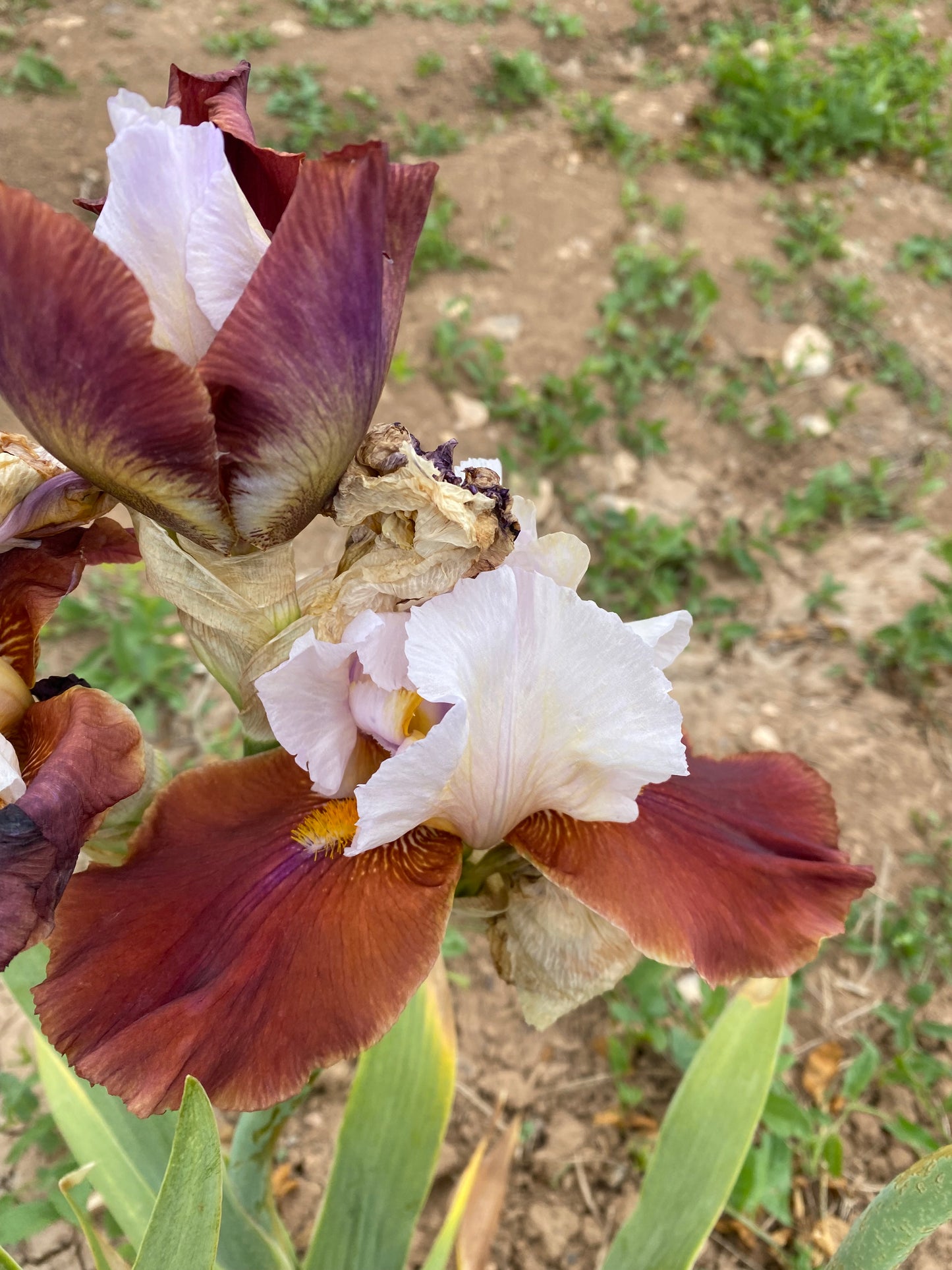 'Latin Hideaway' (Hooker Nichols, R. 1984). Seedling# 8388D. TB, 34" (86 cm). Midseason to late bloom. Standards lavender, suffused buff; falls red, edged tan violet; orange beard; ruffled. 'Taj Rani' X 'In Tempo'. Hillcrest Iris 1986. Honorable Mention 1988; President's Cup 1988; Favorite Guest Iris 1988; Award of Merit 1990.