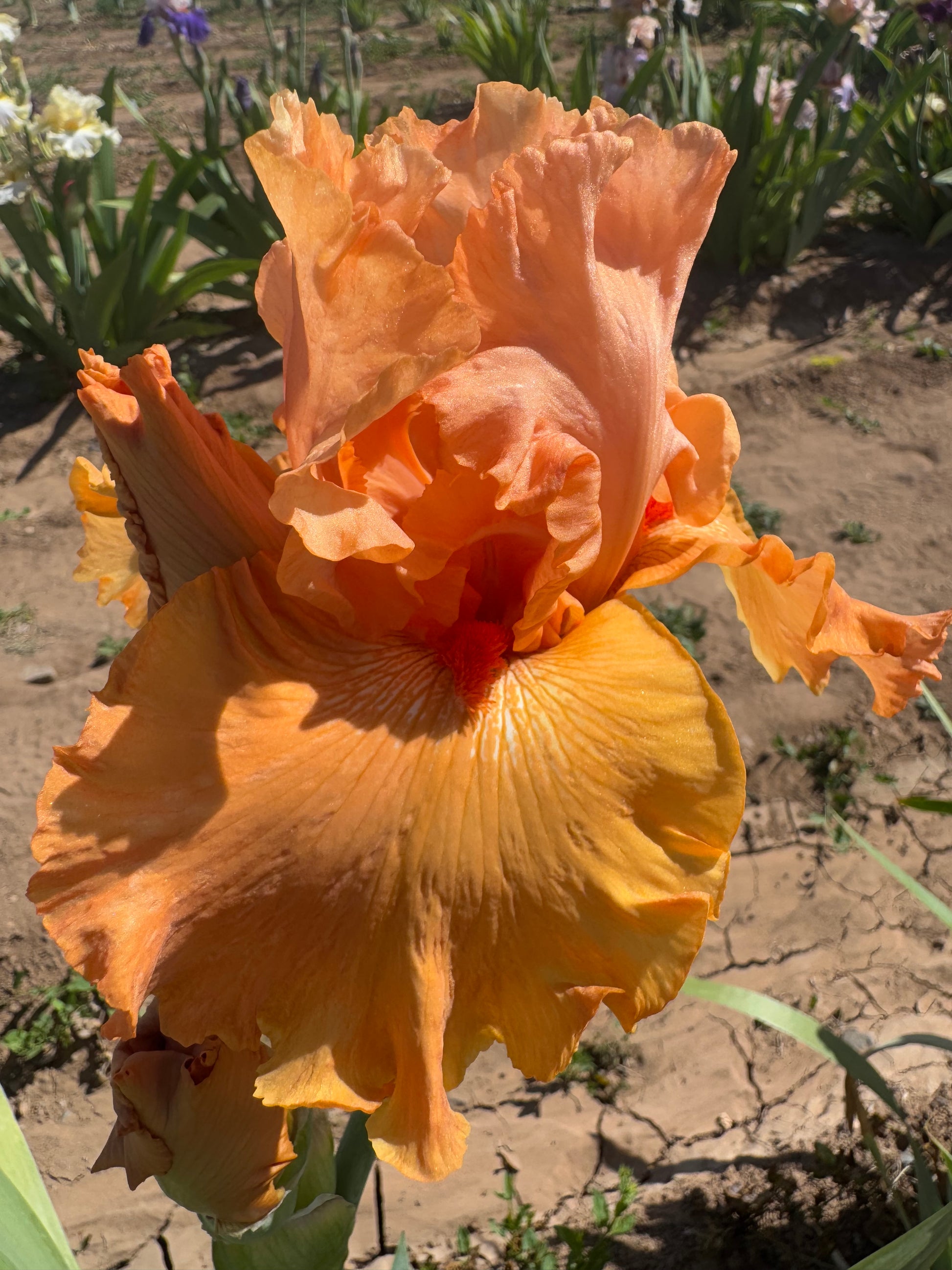 'Legato' (Barry Blyth, R. 1991). Seedling# X140-2. TB, 38" (96 cm). Late midseason bloom. Vibrant metallic orange, few plicata markings around bright saturn orange beards. 'Latin Lark' X ('Edna's Wish' x 'Orangerie'). Tempo Two 1991/92.