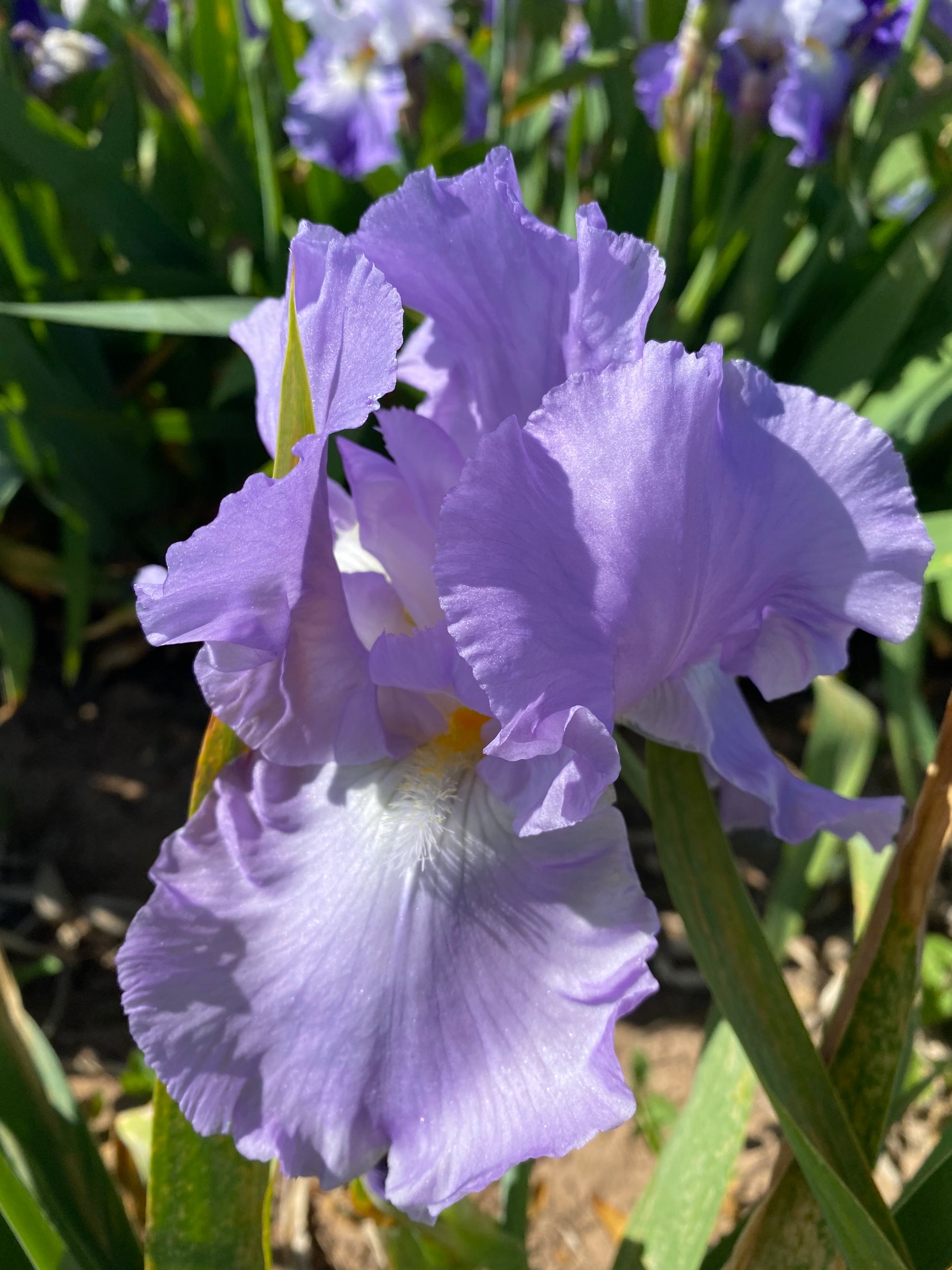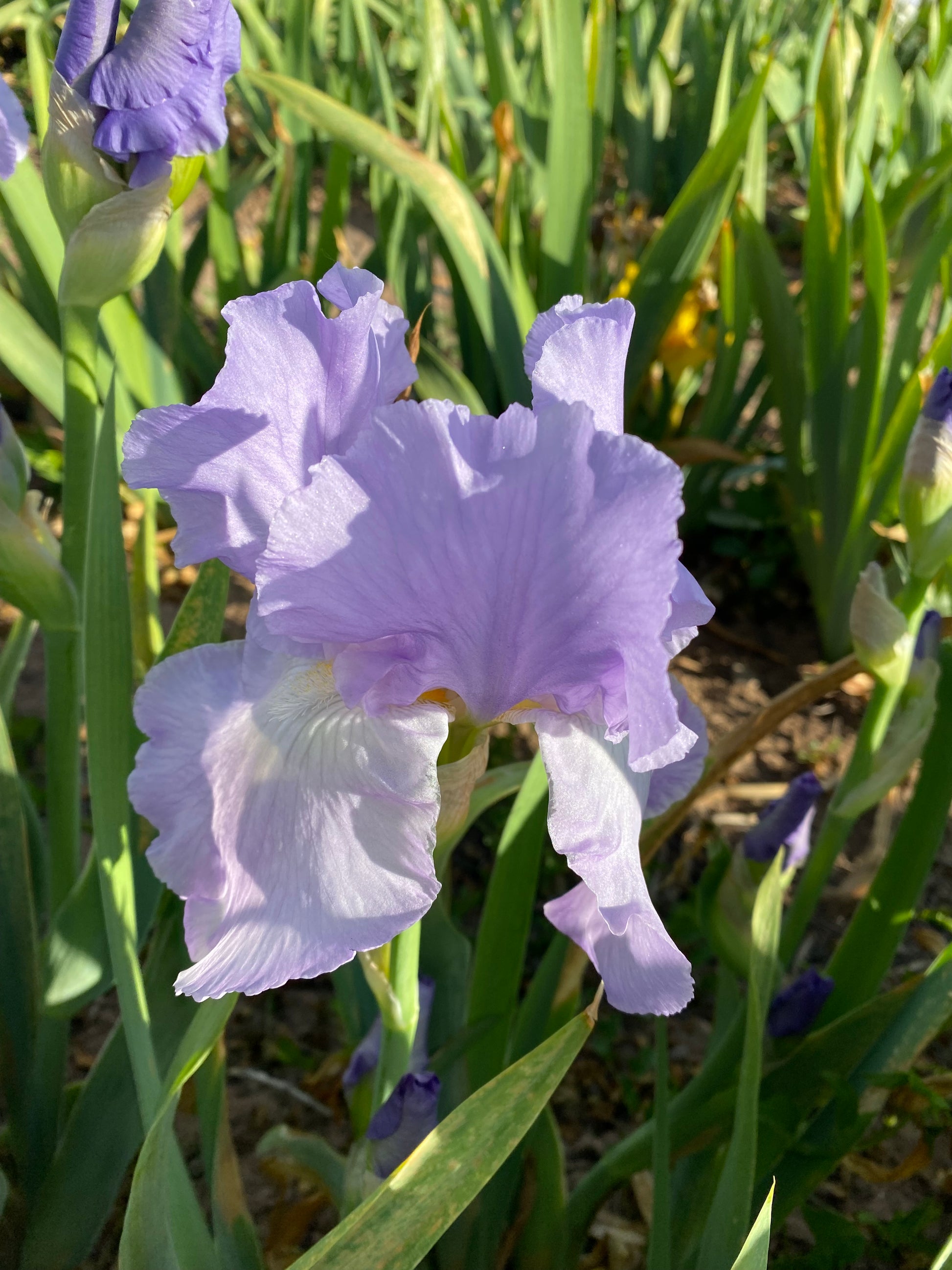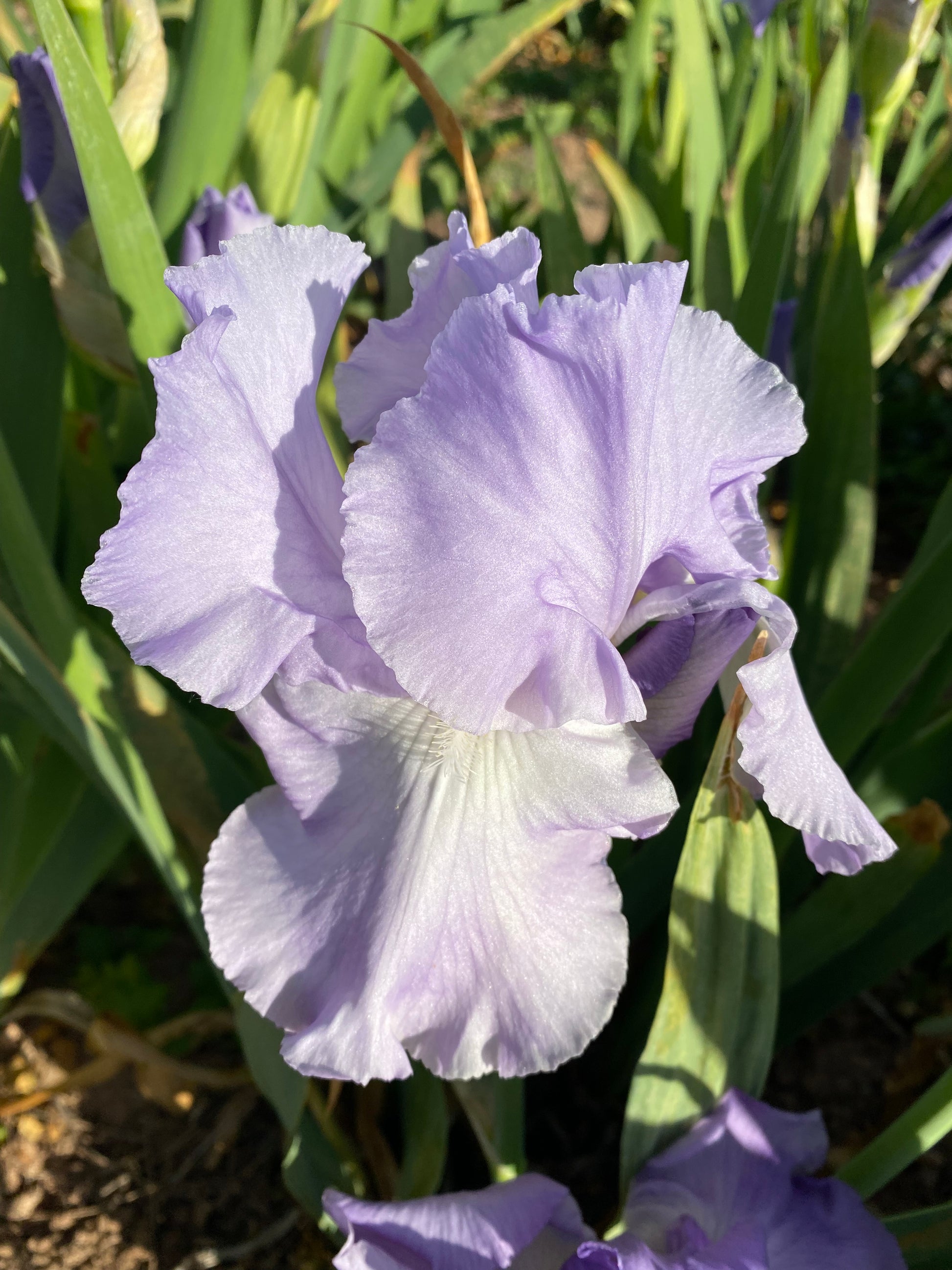 ‘Mary Frances’. (Larry Gaulter, R. 1971). TB, height 38″ (97 cm), Midseason bloom. Ruffled light blue-orchid with white center on falls.; white beard tipped yellow, orange throat. Honorable Mention 1974; Award of Merit 1976; American Dykes Medal 1979. Nelson Award 1980.