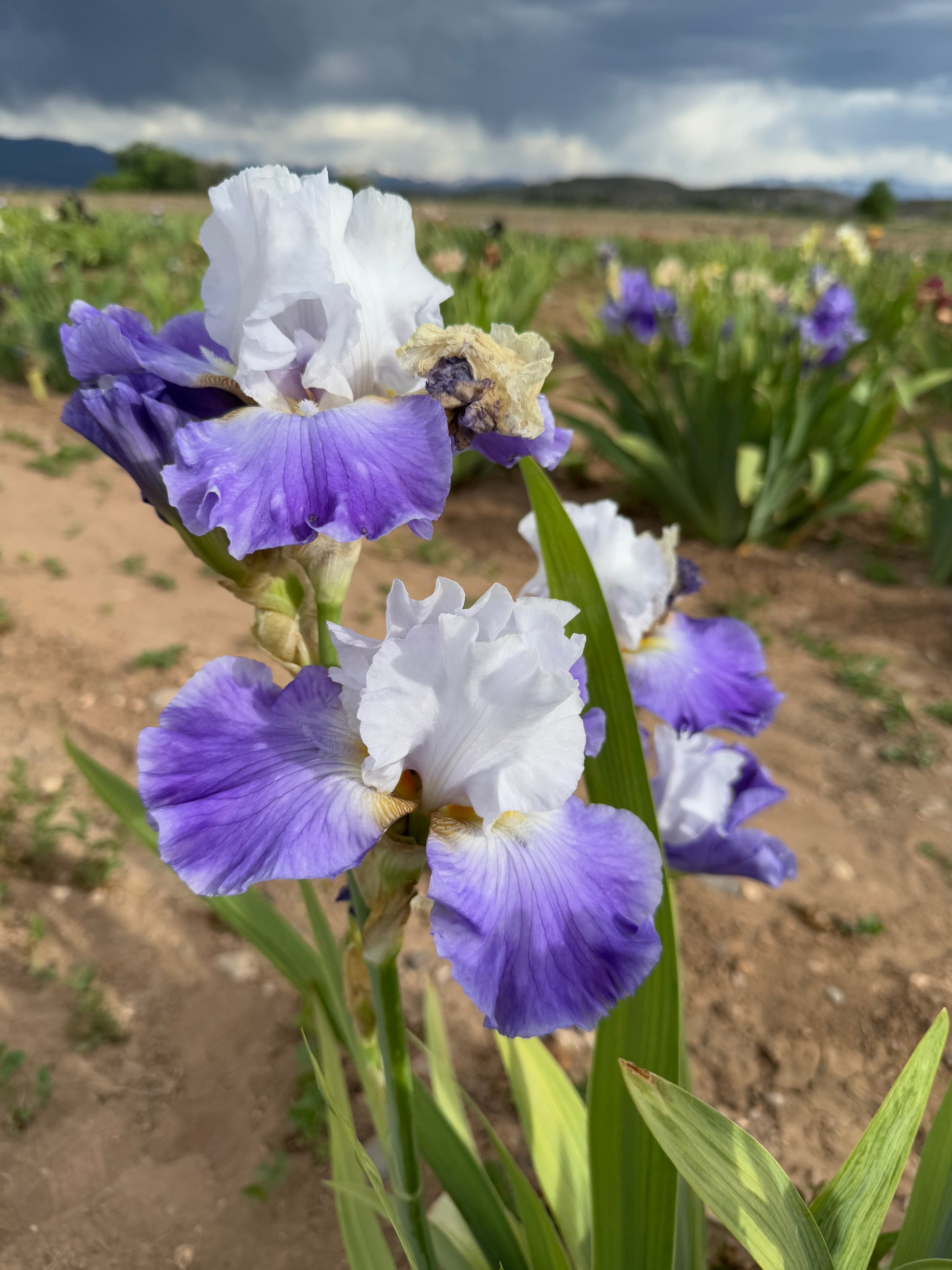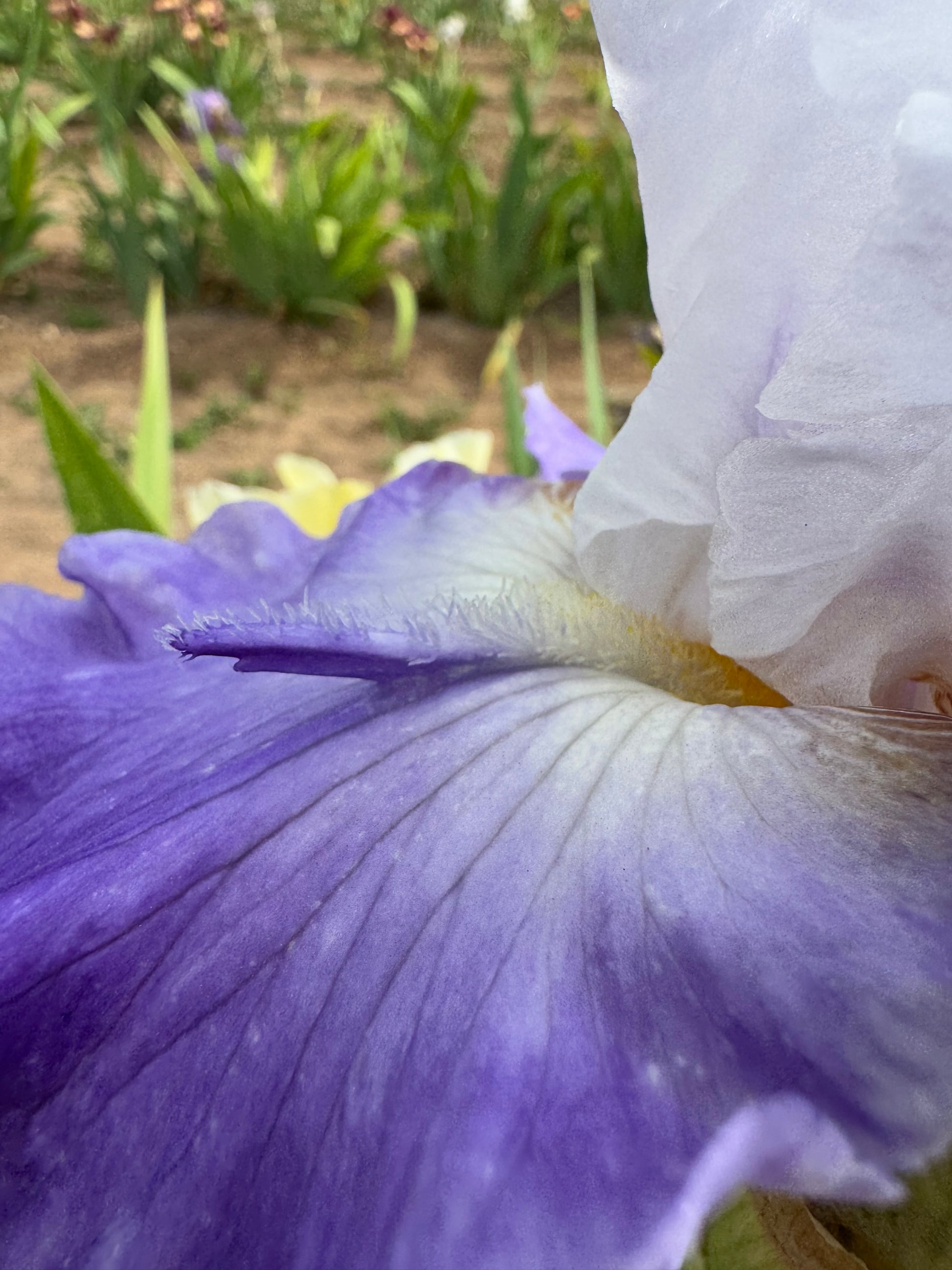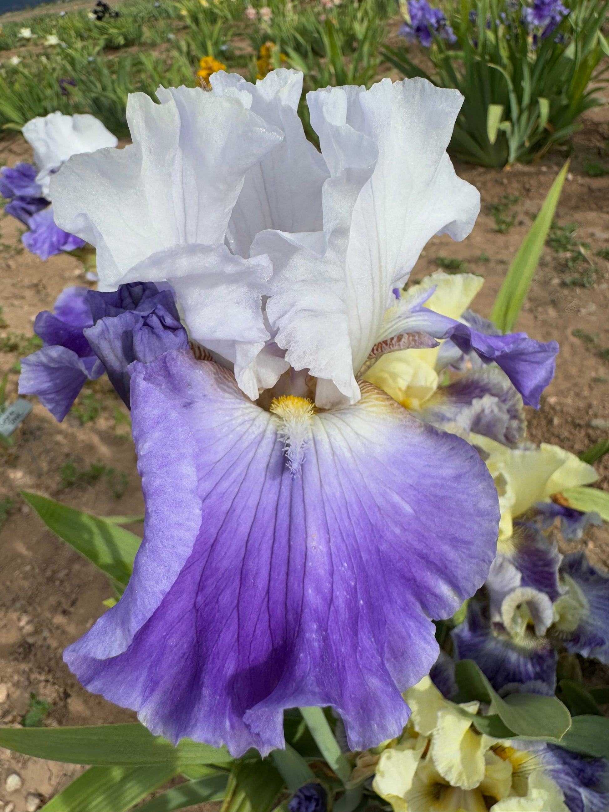 'Masterwork' (Lloyd Zurbrigg, R. 2000). Seedling# OO 33-4-1. TB, 39" (99 cm). Early to very late bloom. Standards white tinted pale violet; style arms white, shaded violet; falls light to medium violet blue; beards light red tangerine, deeper in throat, end blue with short horizontal horn. 'Renown' X 'Mesmerizer'. Friendship 2001.