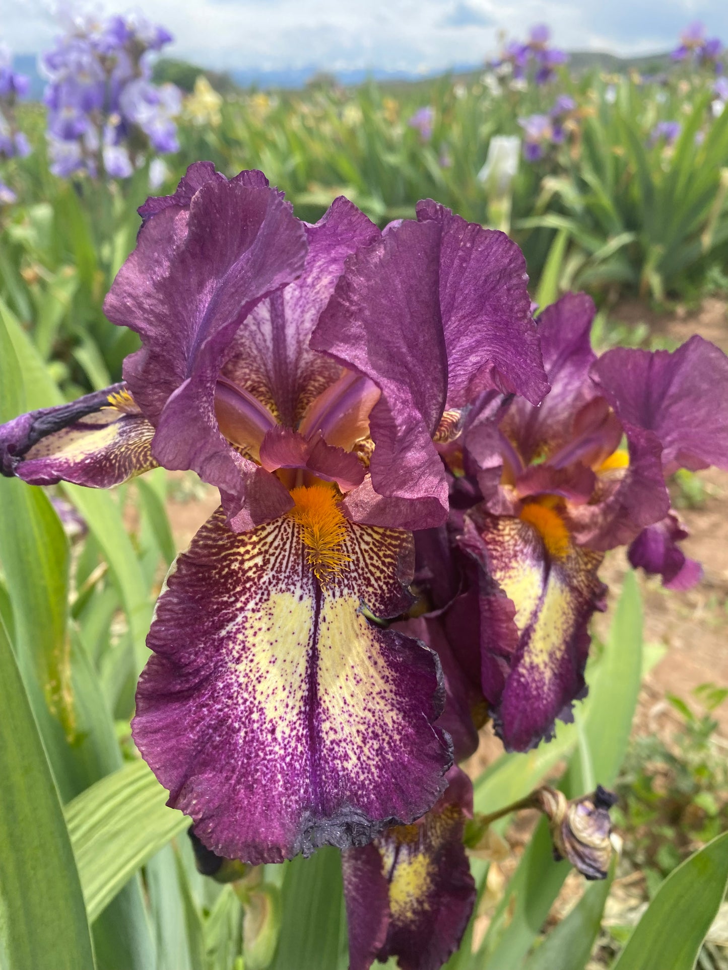 NOID. Unidentified tall bearded iris. Cranberry standards; creamy white center on falls; cranberry plicata edges on falls; cranberry line down middle of fall; yellow beard. Rebloomed for me in September, zone 5.