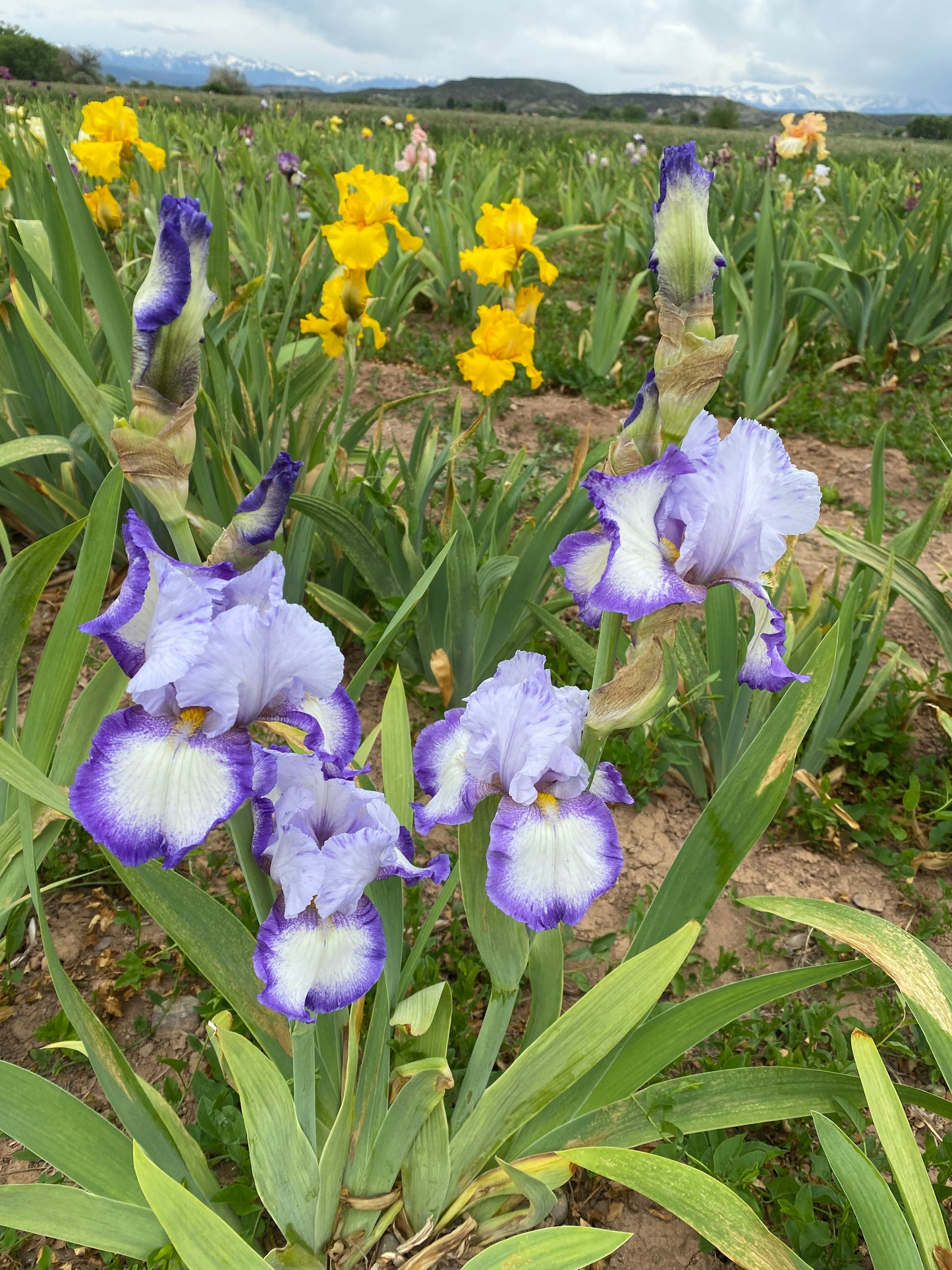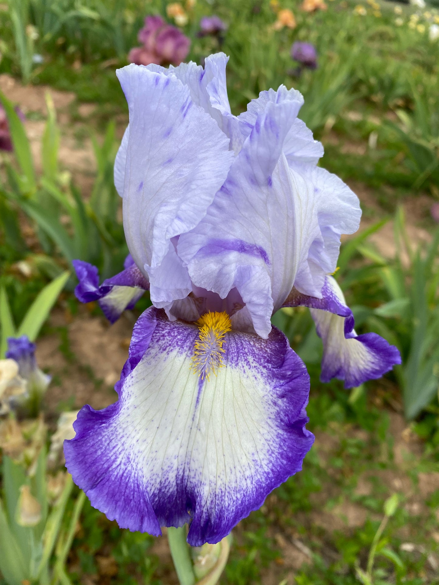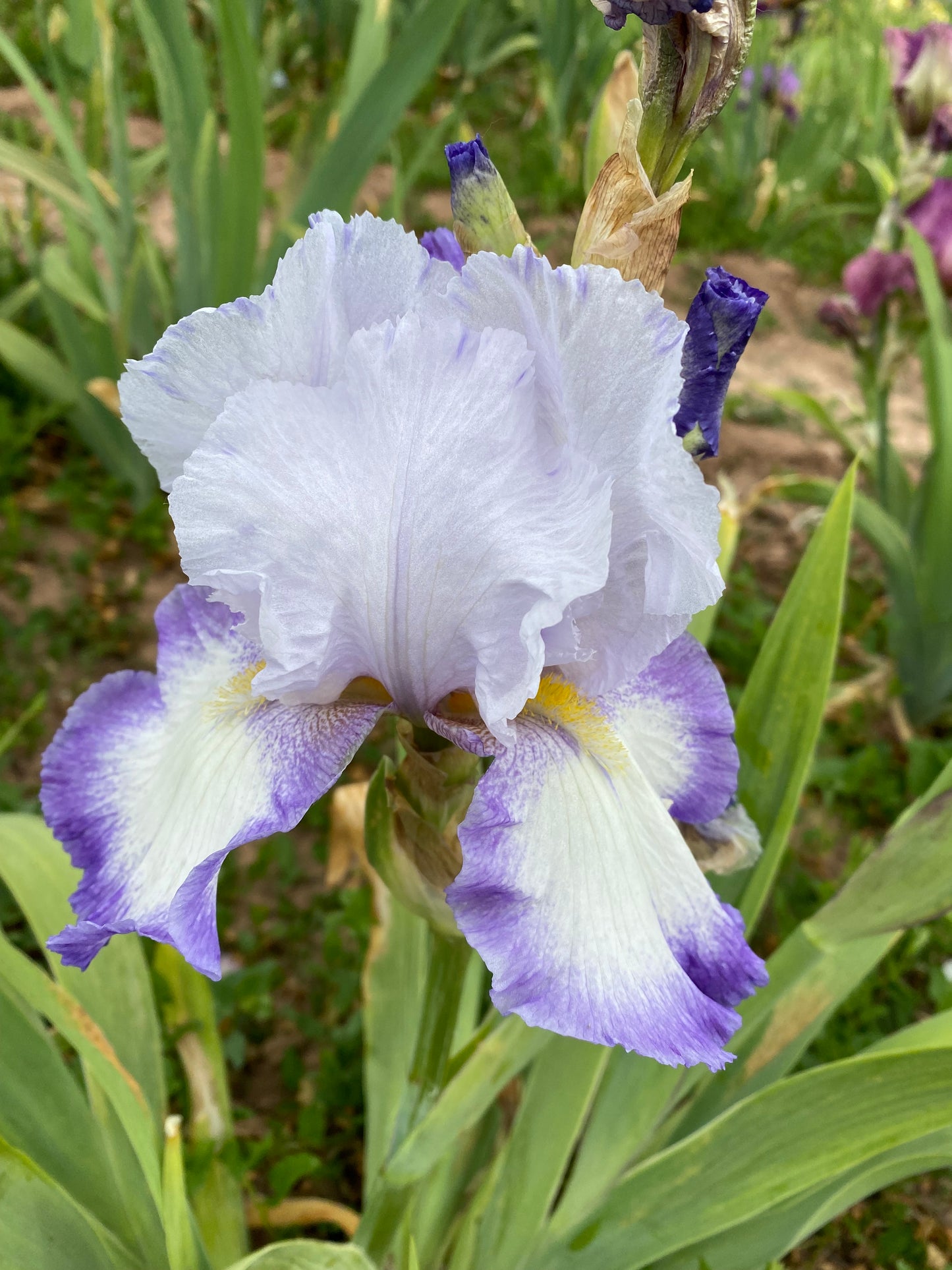 Tall bearded iris. Midseason bloom. Standards white with some purple specks; falls white ground with purple plicata markings; beard yellow.