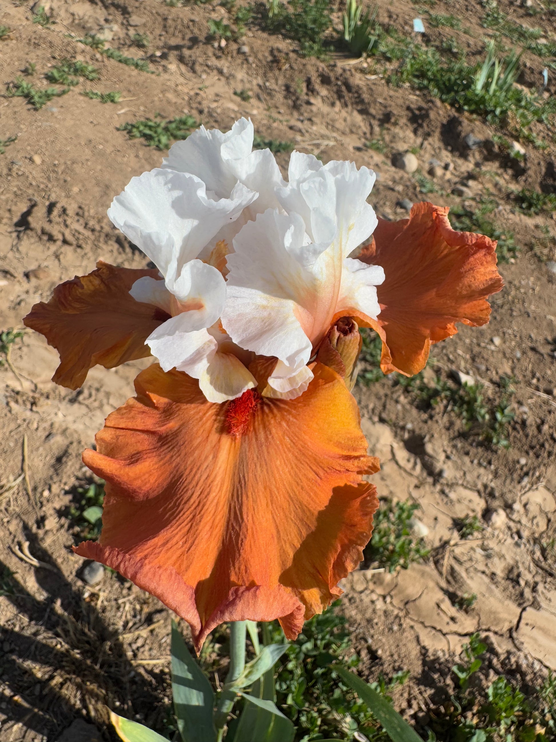 'Pumpkin Pie Ala Mode' (Thomas Johnson, R. 2013) Seedling TC329A. TB, 40" (102 cm). Midseason bloom. Standards white, apricot flush up midrib; style arms white; falls burnt orange; beards tangerine; slight fragrance. 'Ginger Ice' X Blyth seedling O277-4, 'Café D'Amour' sibling. Introduced by Mid-America 2014. Honorable Mention 2016; Award of Merit 2019.