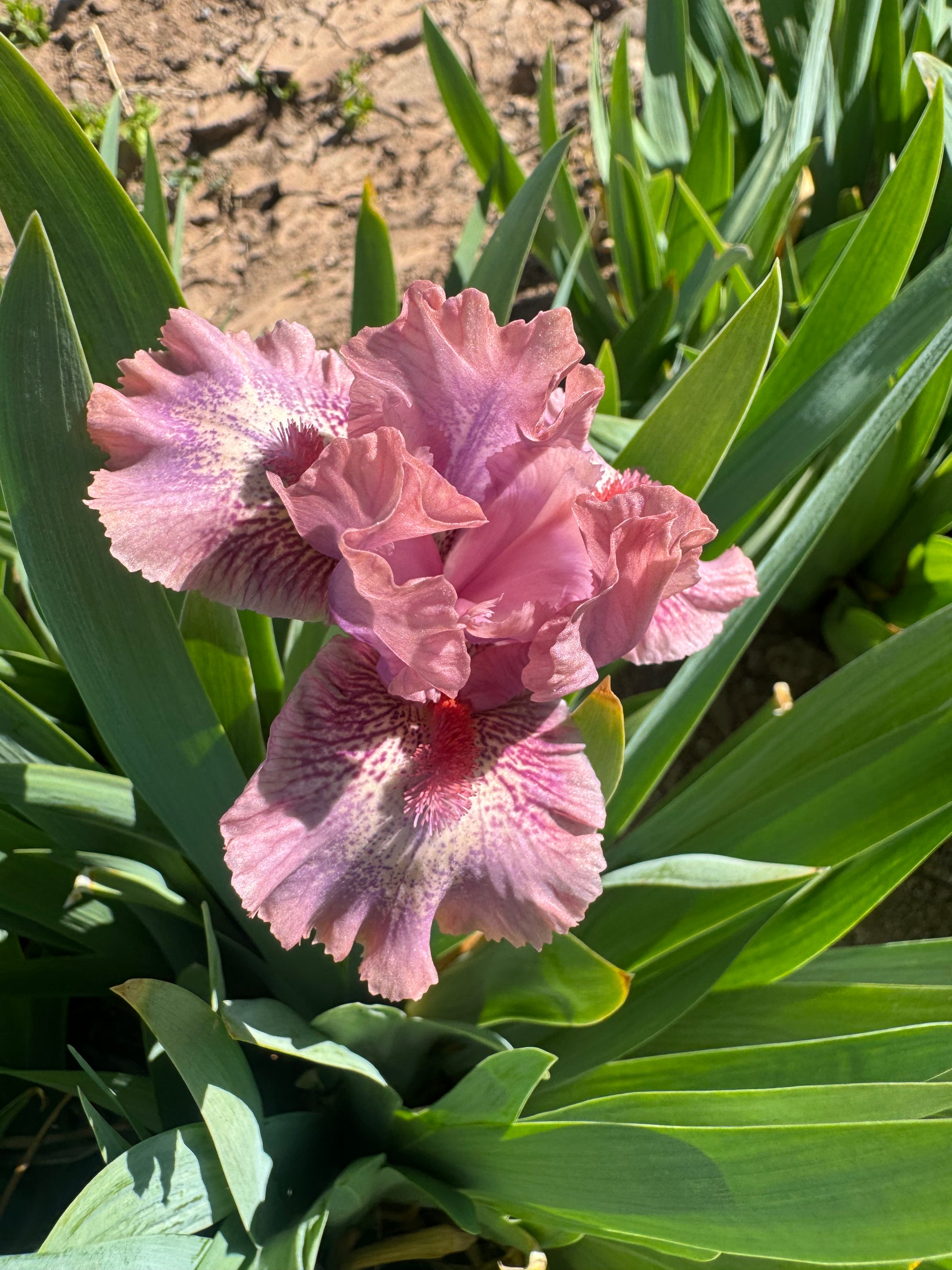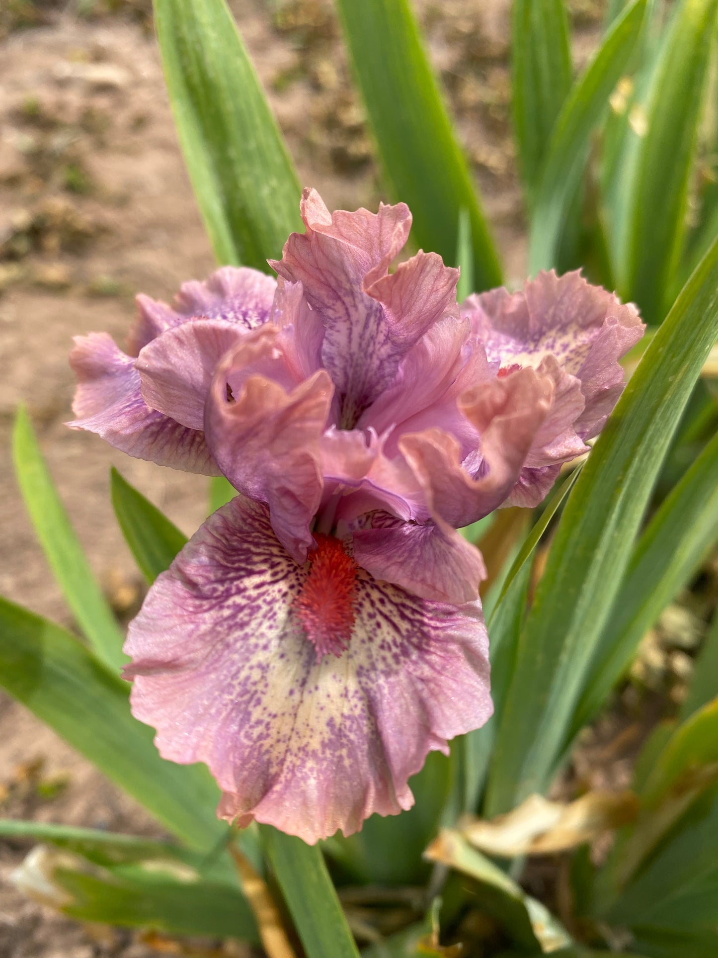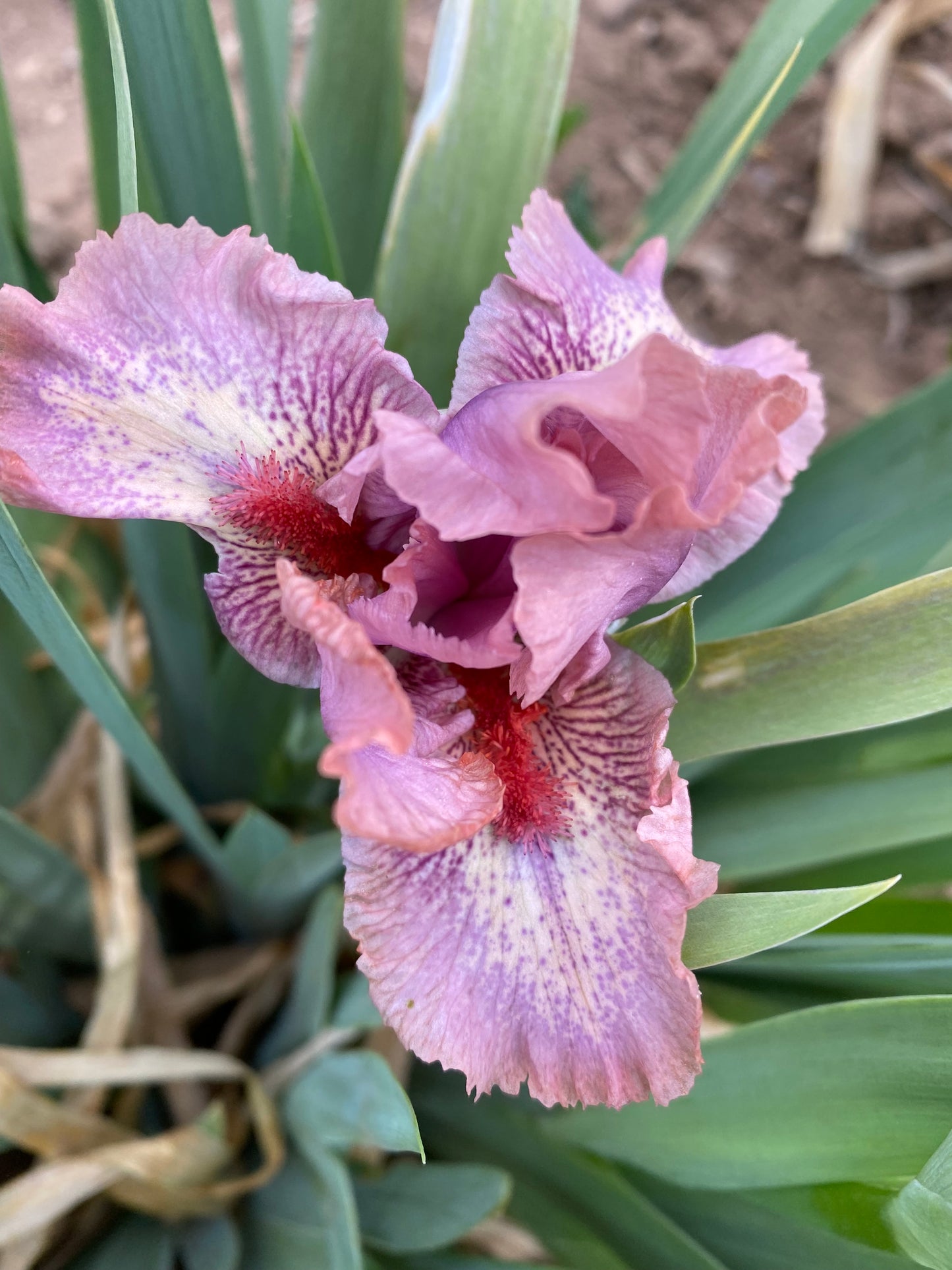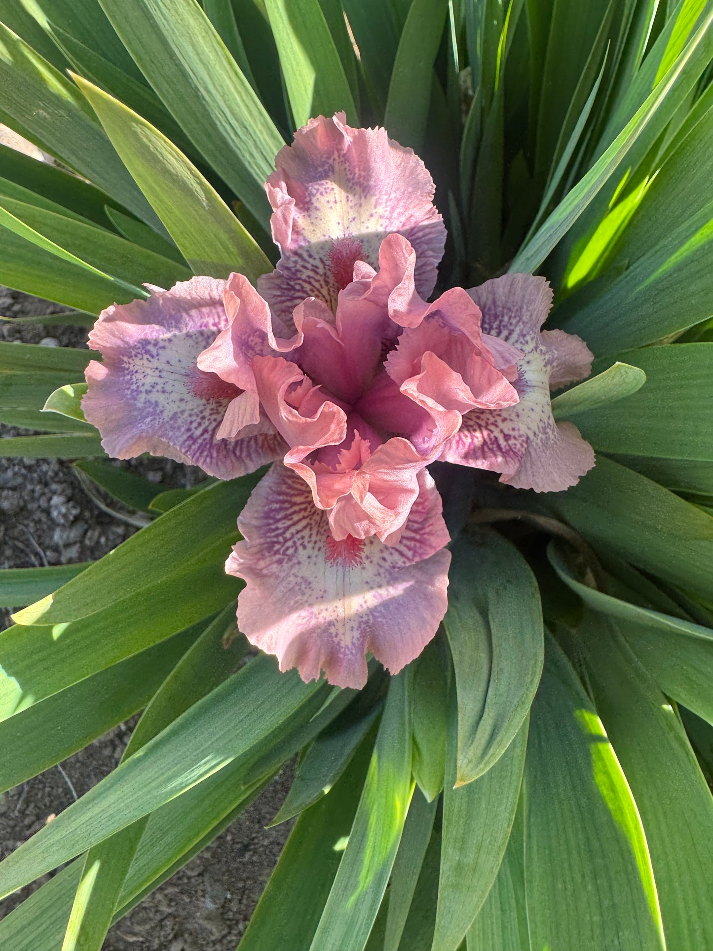 ‘Raspberry Ice’ (Keith Keppel, R. 2011) SDB, 15″ (38 cm), Midseason bloom. Standards buff rose shading to orchid toward base; style arms buff rose; falls apricot cream ground, 3/8″ blended buff rose and orchid band, shoulders peppered and veined darker greyed orchid; beards candy pink and pale orchid giving rusty coral effect. Honorable Mention 2014; Award of Merit 2016; Cook Douglas Medal 2019.