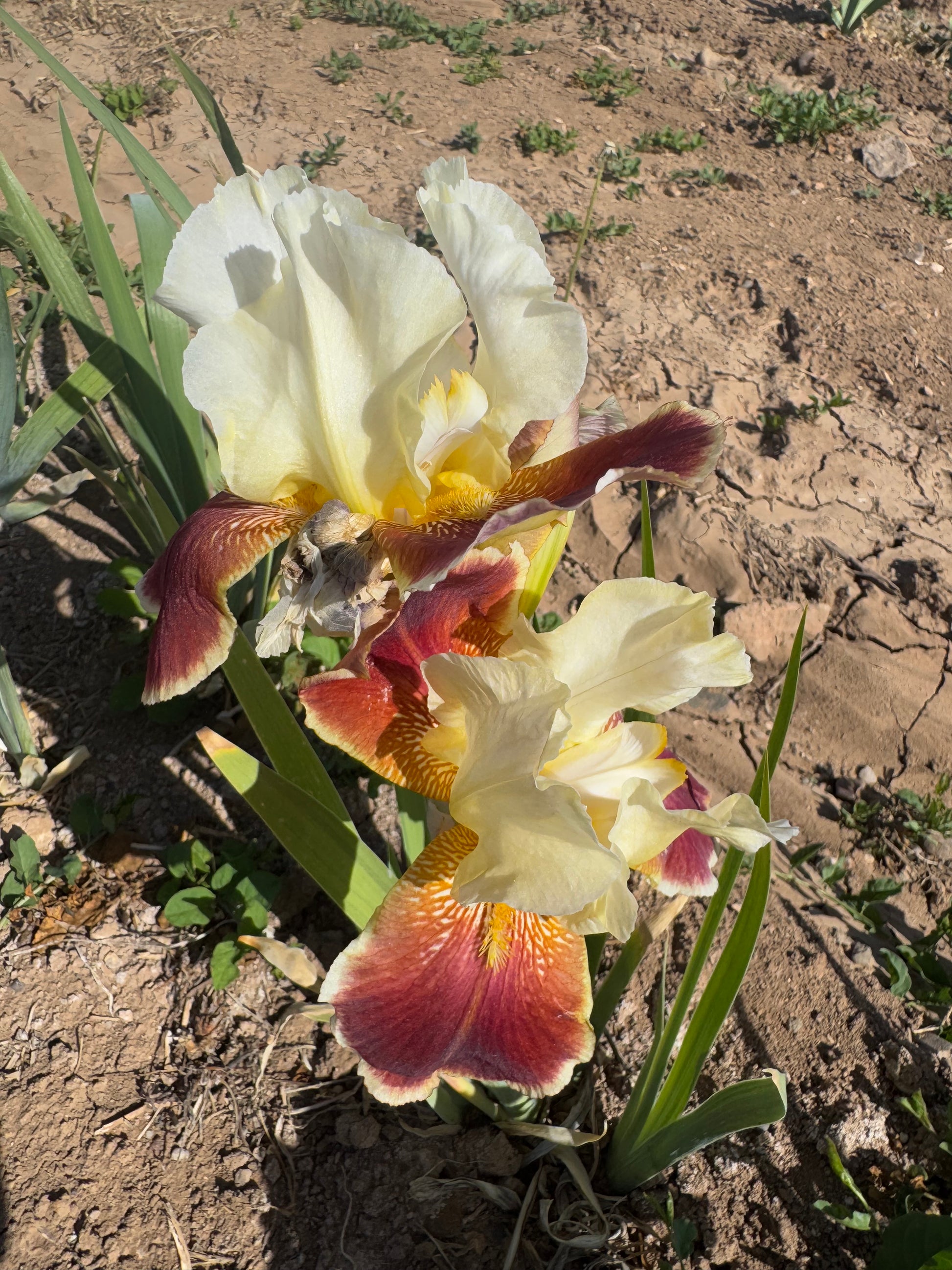 'Repartee' (Catherine and Kenneth D. Smith, R. 1966). Seedling# 64-36. TB, 30" (76 cm), Early, midseason, and late bloom. Color Class-Y4R, Standards ivory-yellow (Ridgway 21F); falls carmine and oxblood red with ivory border. 'Grosvenor' X 'Paradox'. Moldovan 1968. Honorable Mention 1970.
