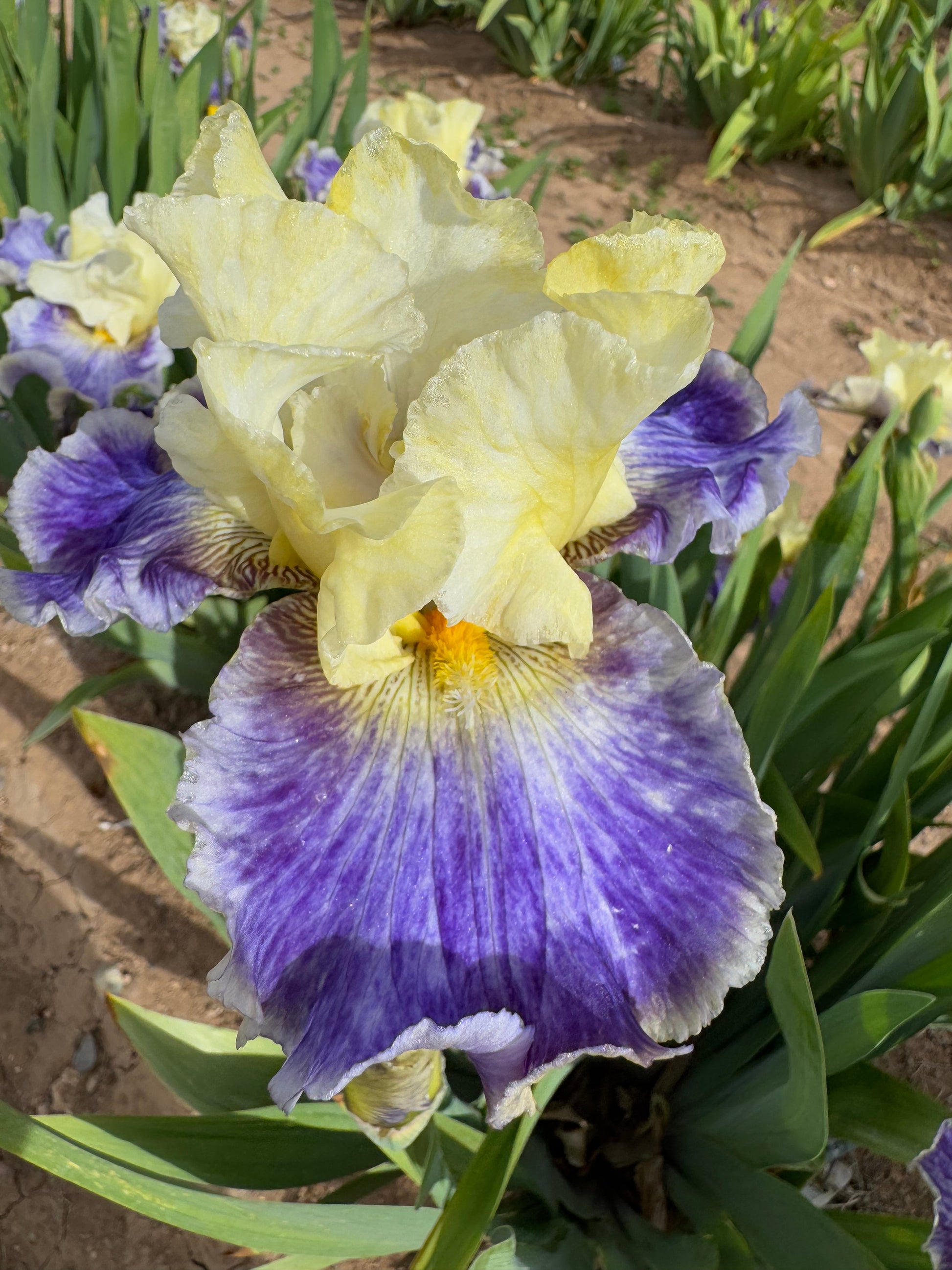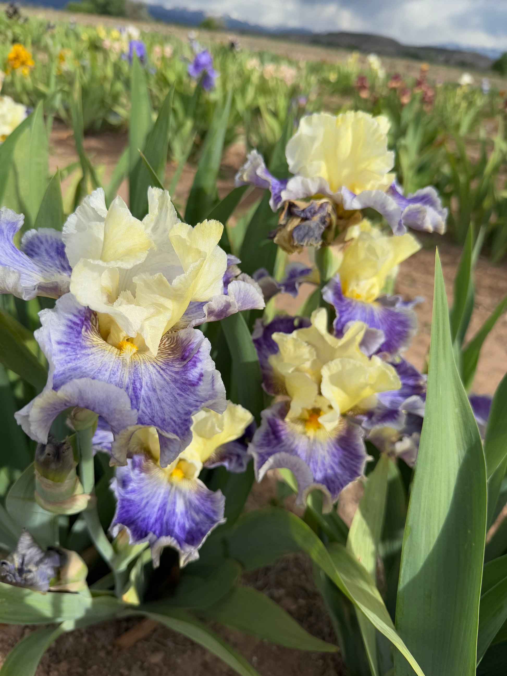 'Rhizome Cowboy' (Schreiners, R. 2023) Seedling C 682-E, TB (reblooming), 35" (89 cm), Midseason bloom. Standards white, rimmed yellow; falls washed purple; beards white base, yellow tips; pronounced sweet fragrance. 'Blueberry Parfait' X seedling YY 415-A:(seedling II 259-A:('Seakist' sibling x 'Mary D') x 'Full Tilt Boogie' pollen parent). Schreiner's Gardens 2023.