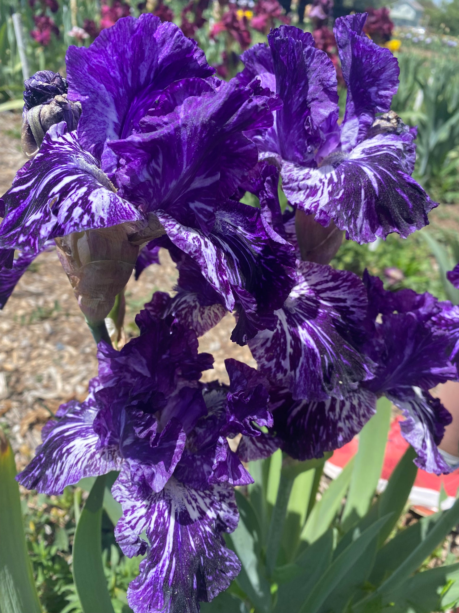 'Splatter Matters' (John Painter, R. 2009). Seedling# J04-14A. TB, 35" (89 cm). Midseason bloom. Standards dark pansyviolet, streaked mottled white and aster violet; style arms dark pansy-violet; falls same but more heavily marked than Standards; beards mixed violet and white, yellow in throat; slight spicy fragrance. 'Jumpin Jack Flash' X 'Telepathy'. Napa Country 2010. Honorable Mention 2013; Award of Merit 2016. Novelty.