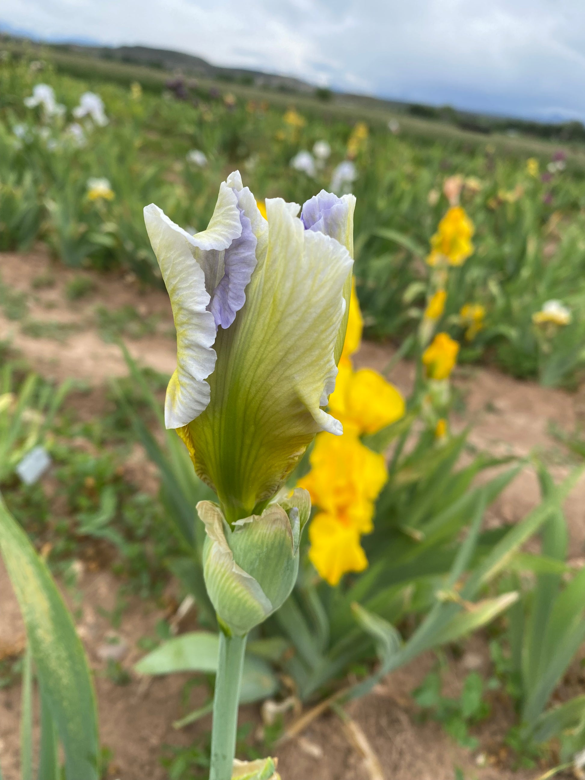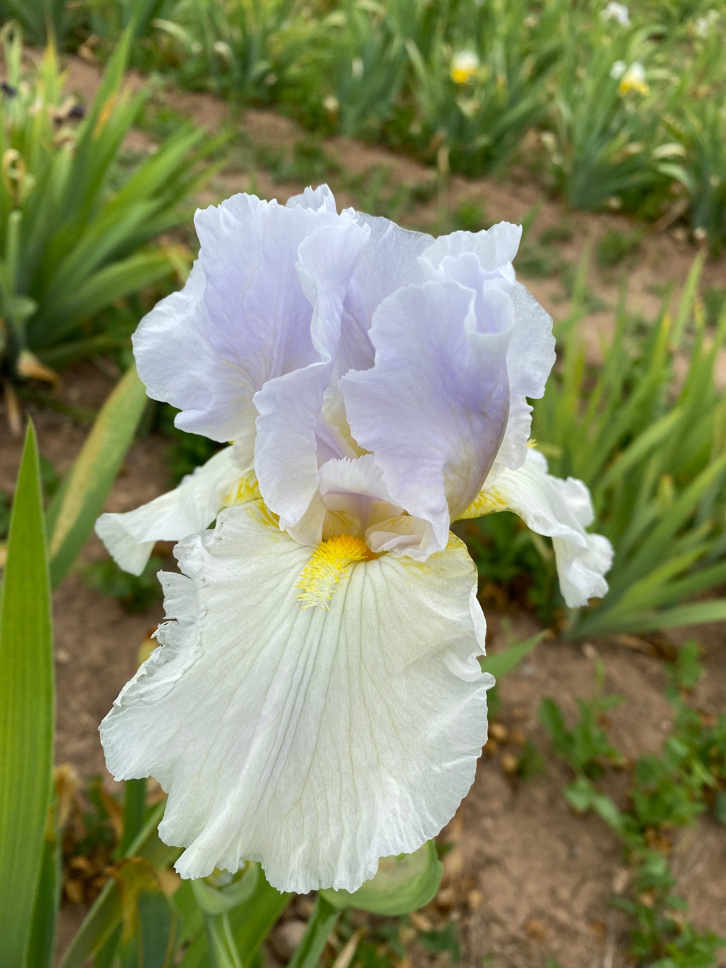 ‘Spring Shower’ (Keith Keppel, R. 1993). TB, 36″ (91 cm), Early midseason bloom. Standards palest blue tip, deepening to chicory blue in center, gentian blue base; falls blue white with faint cream sheen; beards white, tipped dandelion, to chrome yellow; ruffled.