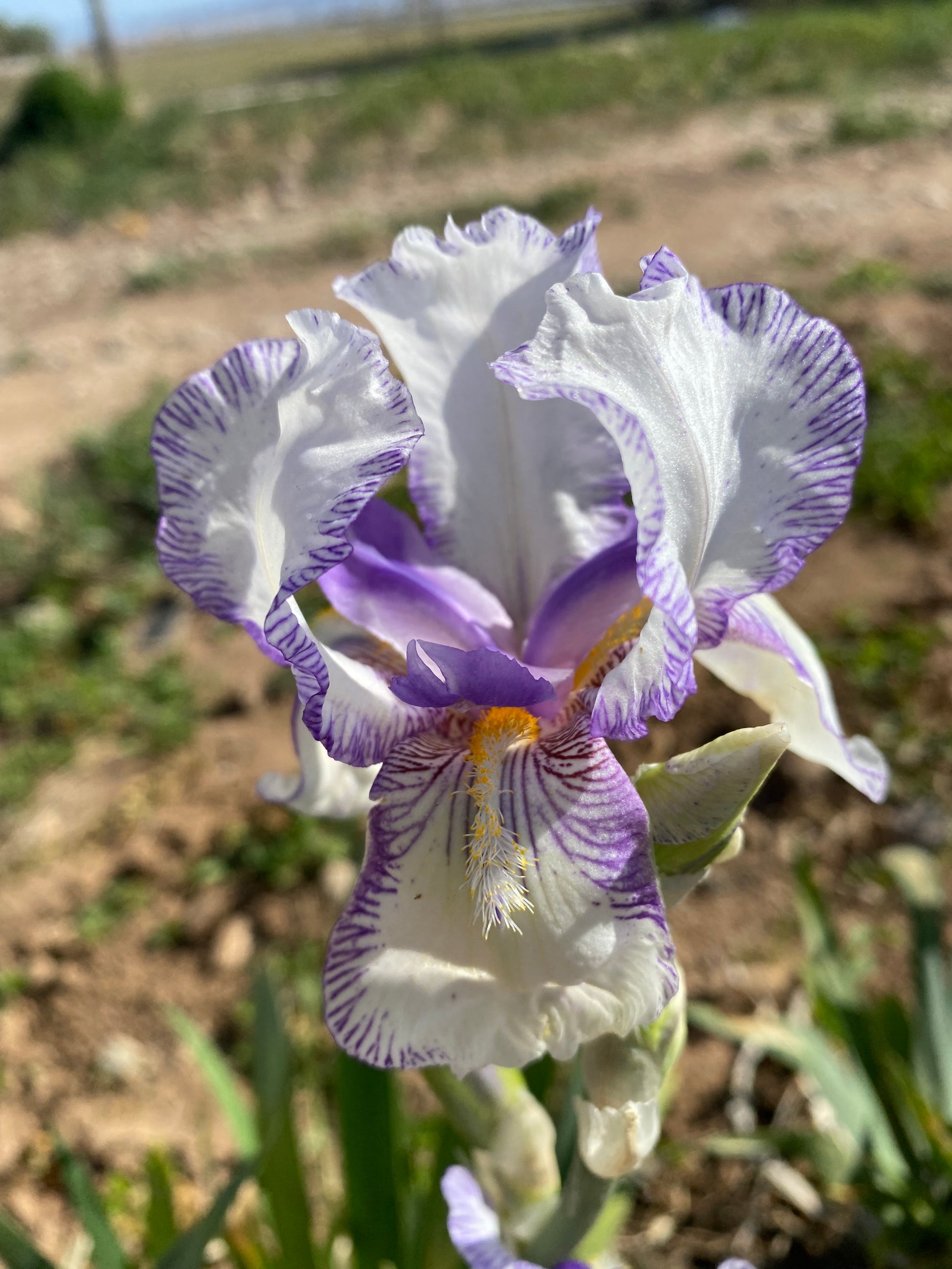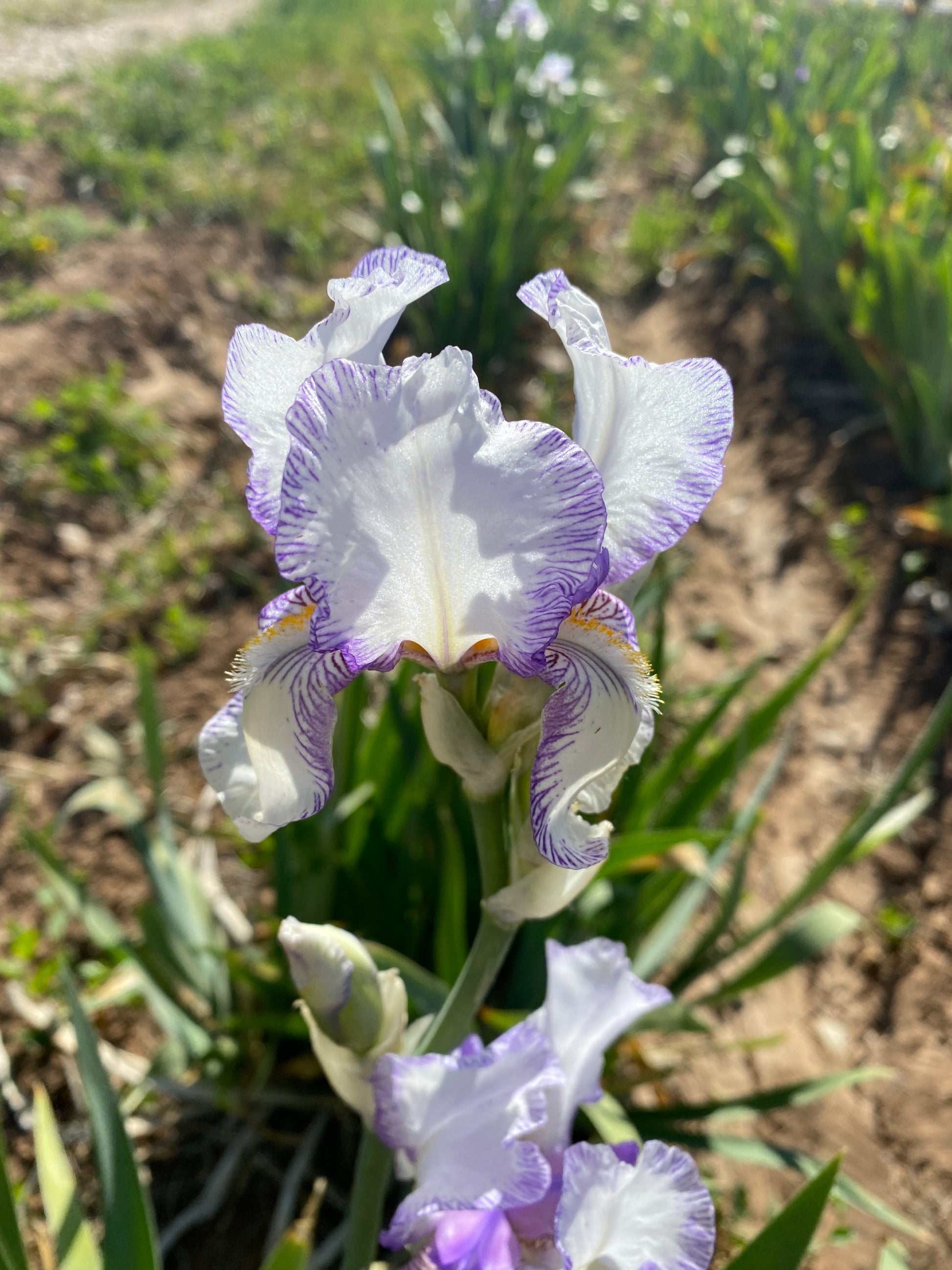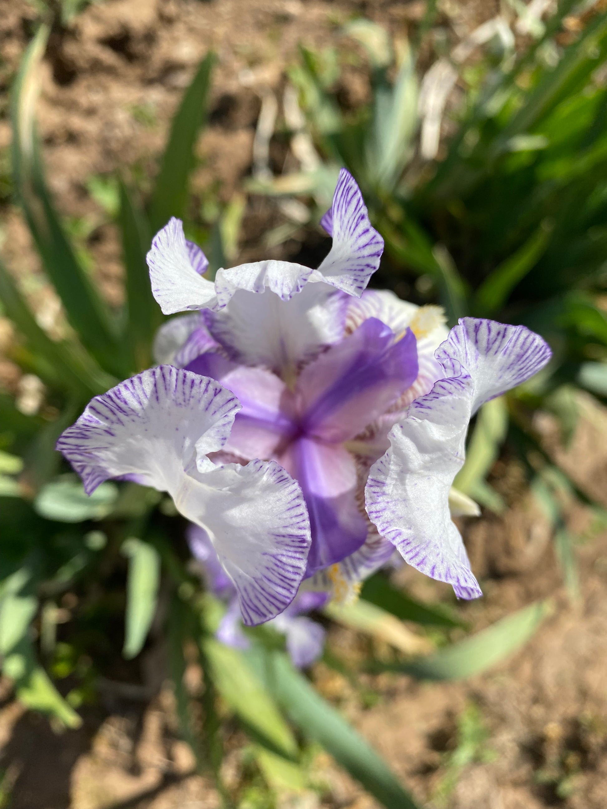 'Swerti' Collected or garden Hybrid, Jean-Baptiste de Lamarck, 1789), TB, Midbloom season. Color code=W8; Color white with a blue edging. Its name (actually meaning "pleated") has become the name for this color form. Considered to be a natural or garden hybrid, or possibly a color form of Iris pallida. Originally called "white iris with blue edges" (alba iris oris cæruleis) it was first described and named in Lamarck's Encyclopedia 3: p. 294 (1789). In cultivation since at least 1590 (in "Le Jardin du Roi très chrétien Henri IV"). The "pleated iris" was first described as iris aphylla in Curtis's "Botanical Magazine" then correctly renamed iris plicata.