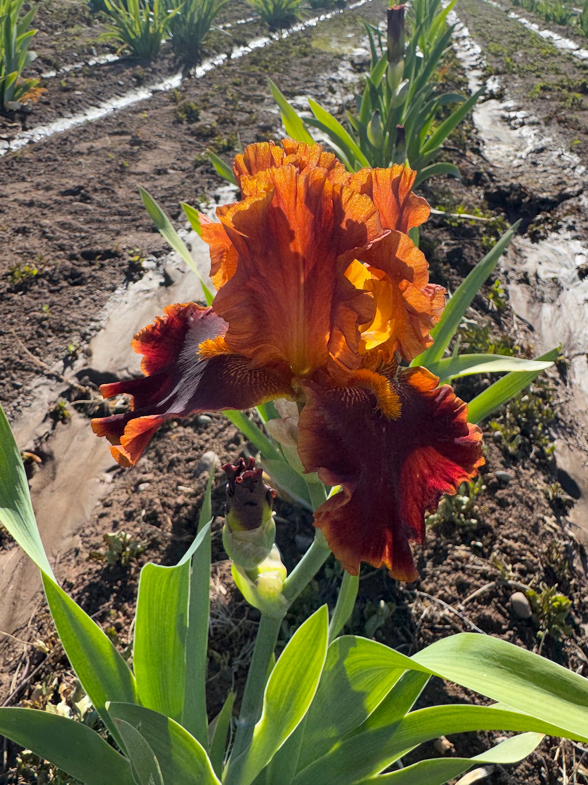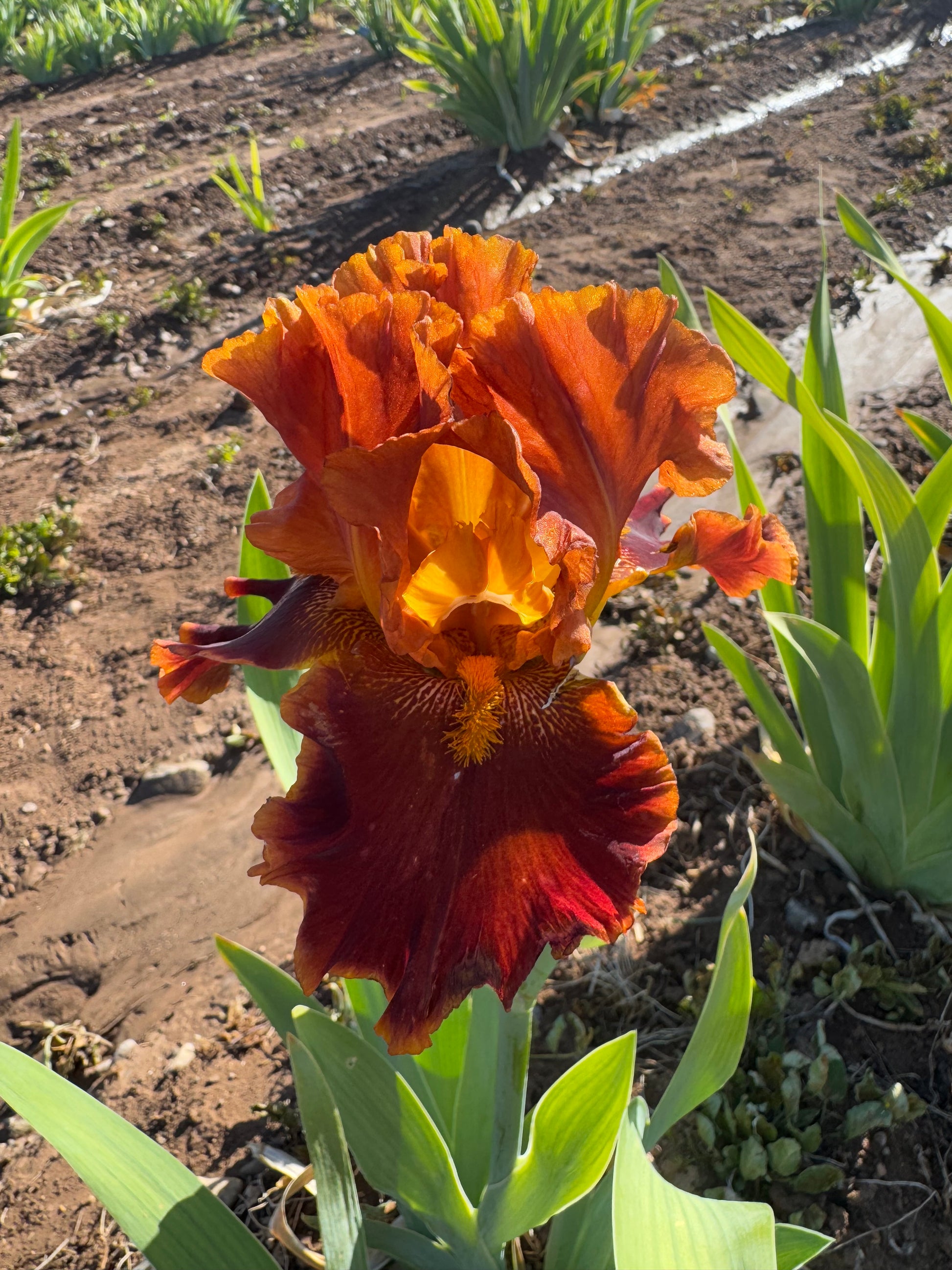'Tonic Rush' (Robert Van Liere, R. 2015). Seedling# 24CT26. TB, 30" (76 cm), Early to midseason bloom. Standards yellow-orange with red tint overlay; style arms yellow-orange; falls yellow-orange with deeper red overlay, lighter margin; beards dull orange. 'Rush Creek' X 'Copatonic'.