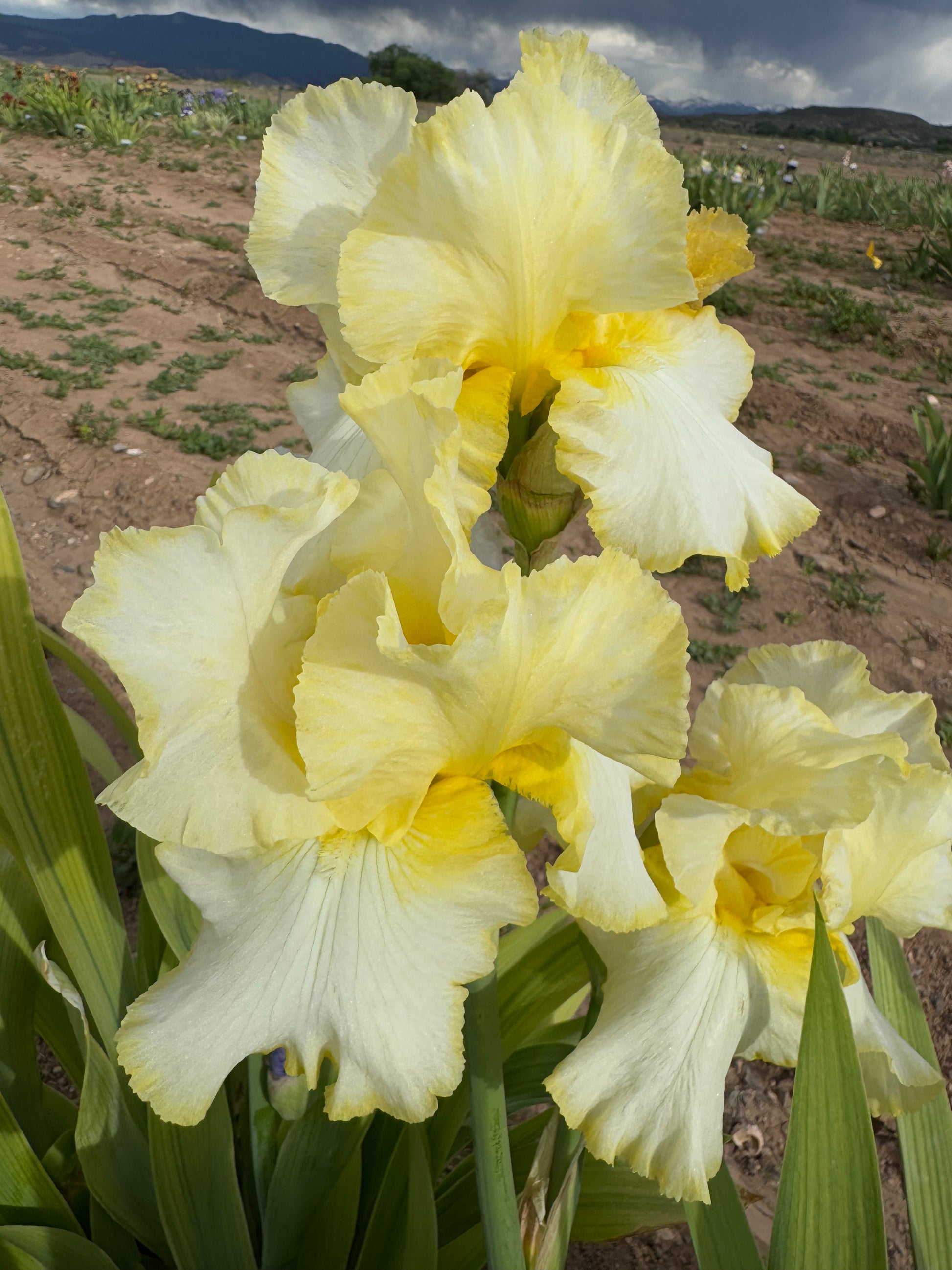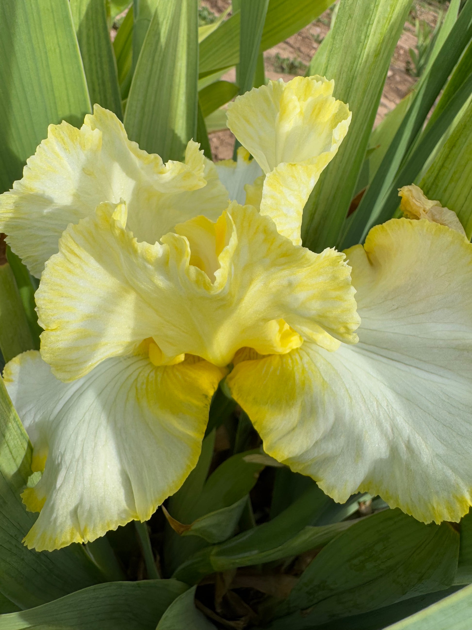 'Total Recall' (Ben Hager, R. 1992). Seedling# RE5079SmkCrBi. TB, 34" (86 cm). Early to late bloom and re-bloom. Standards light to medium yellow; falls white, edged yellow; beards light yellow; ruffled. 'Mother Earth' X 'Bonus Mama'. Melrose 1992. Honorable Mention 1996; Award of Merit 2000.