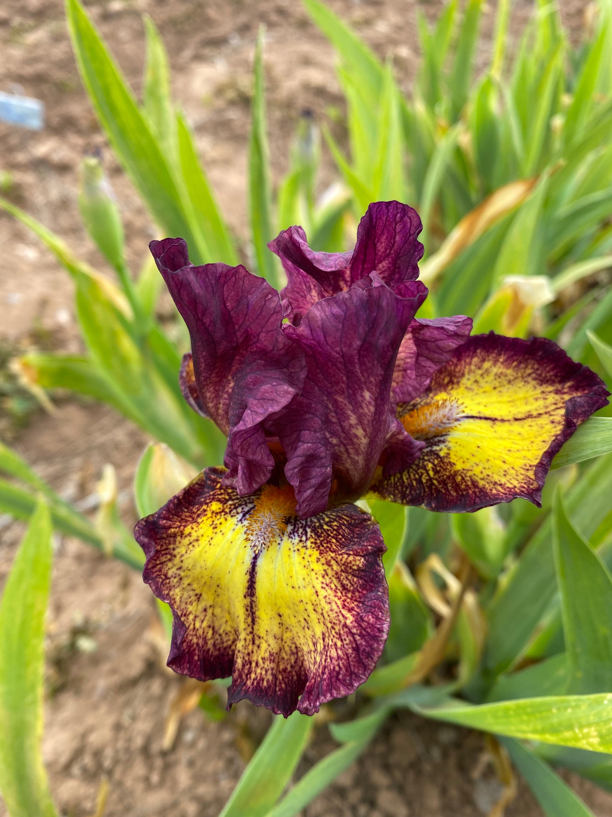 ‘Tripod’ (Michael Sutton, R. 2005). IB, height 20″ (51 cm), Early midseason bloom and rebloom. Standards yellow ground heavily washed maroon; style arms maroon; falls yellow ground, rusty red plicata edge; beards pale yellow, fuzzy white horns; ruffled.